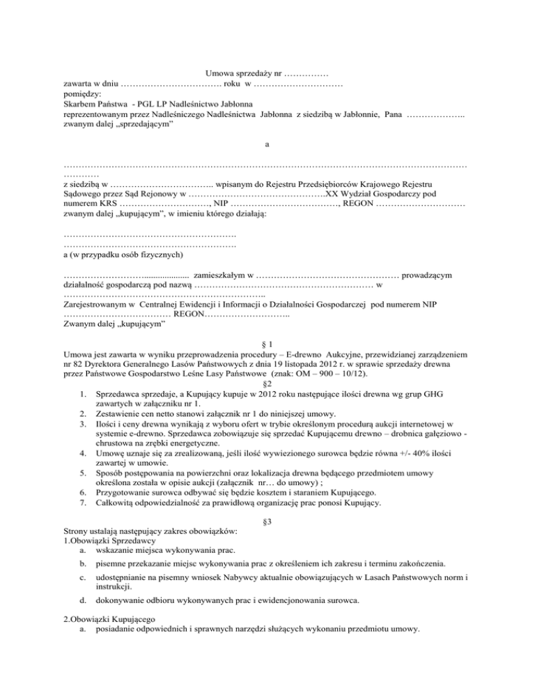 Umowa sprzedaży nr …………… zawarta w dniu ……………………………. roku w ………………………… pomiędzy: Skarbem Państwa - PGL LP Nadleśnictwo Jabłonna reprezentowanym przez Nadleśniczego Nadleśnictwa Jabłonna z siedzibą w Jabłonnie, Pana ……………….. zwanym dalej „sprzedającym” a ……………………………………………………………………………………………………………………… ………… z siedzibą w …………………………….. wpisanym do Rejestru Przedsiębiorców Krajowego Rejestru Sądowego przez Sąd Rejonowy w ……………………………………….XX Wydział Gospodarczy pod numerem KRS …………………………, NIP ………………………………, REGON ………………………… zwanym dalej „kupującym”, w imieniu którego działają: …………………………………………………. …………………………………………………. a (w przypadku osób fizycznych) ……………………….................... zamieszkałym w ………………………………………… prowadzącym działalność gospodarczą pod nazwą …………………………………………………… w ………………………………………………………….. Zarejestrowanym w Centralnej Ewidencji i Informacji o Działalności Gospodarczej pod numerem NIP ……………………………… REGON……………………….. Zwanym dalej „kupującym” §1 Umowa jest zawarta w wyniku przeprowadzenia procedury – E-drewno Aukcyjne, przewidzianej zarządzeniem nr 82 Dyrektora Generalnego Lasów Państwowych z dnia 19 listopada 2012 r. w sprawie sprzedaży drewna przez Państwowe Gospodarstwo Leśne Lasy Państwowe (znak: OM – 900 – 10/12). §2 1. Sprzedawca sprzedaje, a Kupujący kupuje w 2012 roku następujące ilości drewna wg grup GHG zawartych w załączniku nr 1. 2. Zestawienie cen netto stanowi załącznik nr 1 do niniejszej umowy. 3. Ilości i ceny drewna wynikają z wyboru ofert w trybie określonym procedurą aukcji internetowej w systemie e-drewno. Sprzedawca zobowiązuje się sprzedać Kupującemu drewno – drobnica gałęziowo chrustowa na zrębki energetyczne. 4. Umowę uznaje się za zrealizowaną, jeśli ilość wywiezionego surowca będzie równa +/- 40% ilości zawartej w umowie. 5. Sposób postępowania na powierzchni oraz lokalizacja drewna będącego przedmiotem umowy określona została w opisie aukcji (załącznik nr… do umowy) ; 6. Przygotowanie surowca odbywać się będzie kosztem i staraniem Kupującego. 7. Całkowitą odpowiedzialność za prawidłową organizację prac ponosi Kupujący. §3 Strony ustalają następujący zakres obowiązków: 1.Obowiązki Sprzedawcy a. wskazanie miejsca wykonywania prac. b. pisemne przekazanie miejsc wykonywania prac z określeniem ich zakresu i terminu zakończenia. c. udostępnianie na pisemny wniosek Nabywcy aktualnie obowiązujących w Lasach Państwowych norm i instrukcji. d. dokonywanie odbioru wykonywanych prac i ewidencjonowania surowca. 2.Obowiązki Kupującego a. posiadanie odpowiednich i sprawnych narzędzi służących wykonaniu przedmiotu umowy. b. angażowanie na własną odpowiedzialność do wykonania przedmiotu umowy wyłącznie osób 1) o stanie zdrowia umożliwiającym właściwe i bezpieczne realizowanie prac, c. 2) posiadających umiejętność obsługiwania wymienionych w pkt. a. narzędzi. wykonywanie przedmiotu umowy zgodnie ze wskazówkami właściwego terenowo leśniczego odnośnie miejsca i terminu realizacji. terminowe wykonywanie prac. d. e. stosowanie technologii prac przyjaznych dla środowiska, minimalizujących szkody w ekosystemie leśnym, zgodnie z obowiązującymi w Lasach Państwowych zasadami i instrukcjami. f. oznakowanie powierzchni leśnych, na których będą wykonywane prace służące wykonaniu przedmiotu umowy. g. wykonywanie prac zgodnie z zasadami bezpieczeństwa i higieny pracy, w trosce o bezpieczeństwo własne, osób współpracujących z Kupującym oraz osób trzecich. h. stosowanie w szczególności metod pracy przyjaznych dla środowiska, nie powodujących zaśmiecania lasu odpadami produkcyjnymi, umożliwiającymi unikanie uszkadzania drzew oraz zbędnego kaleczenia gleby, uwzględniającymi potrzeby ochrony rezerwatów, ekotonów, ostoi zwierzyny, stanowisk rzadkich zwierząt i roślin oraz innych cennych przyrodniczo obiektów podlegających ochronie prawnej. i. dokonanie po wykonaniu zleconych prac na określonej powierzchni, a przed jej opuszczeniem, gruntownego oczyszczenia i uporządkowania jej powierzchni, a także przyległych do niej rowów melioracyjnych i dróg, z wszelkich odpadów zagrażających naturalnemu środowisku i porządkowi w lasach. 1. 2. 1. 2. §4 1.Kupujący zapłaci Sprzedawcy cenę jednostkową w wysokości: ……… netto (słownie ……………) zł/m3 za drewno PI M2 ZE LUB PL M2 ZE, powiększoną o należny podatek VAT. 2.Jeżeli w okresie obowiązywania umowy nastąpi zmiana stawki podatku od towarów i usług (VAT), od chwili zmiany podatek w nowej stawce będzie doliczany do dotychczasowych cen netto, bez konieczności zmiany umowy. §5 1.Upoważnionymi do odbioru ilościowo-jakościowego wykonania przedmiotu umowy oraz sporządzania i podpisywania dokumentów z tym związanych ze strony Kupującego są właściwi terenowo leśniczowie i podleśniczowie. 2.Upoważnionymi do podpisywania dokumentów ze strony Kupującego jest Kupujący lub osoba przez niego upoważniona. j. p. ……………………………… §6 1.Sprzedawca, dokona pomiaru ilościowego zrębków na pojeździe wywozowym w m3p (m3p=0,25m3 według zamiennika dla zrębków). Wywóz zrębków odbywać się będzie na podstawie sporządzanych kwitów wywozowych (KW), wystawianych przez upoważnionego przedstawiciela Sprzedawcy. Oryginał KW będzie podstawą do wystawienia przez Sprzedawcę faktury VAT za sprzeda