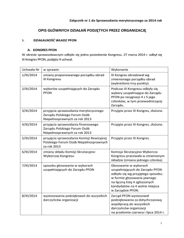 Załącznik nr 1 do Sprawozdania merytorycznego za 2014 rok OPIS GŁÓWNYCH DZIAŁAŃ PODJĘTYCH PRZEZ ORGANIZACJĘ I. DZIAŁALNOŚĆ WŁADZ PFON A. KONGRES PFON W okresie sprawozdawczym odbyło się jedno posiedzenie Kongresu. 27 marca 2014 r. odbył się XI Kongres PFON, podjęto 9 uchwał. Uchwała Nr w sprawie: Wykonanie 1/XI/2014 zmiany proponowanego porządku obrad XI Kongresu XI Kongres obradował wg zmienionego porządku obrad (wykreślono trzy punkty). 2/XI/2014 wyborów uzupełniających do Zarządu PFON Podczas XI Kongresu odbyły się wybory uzupełniające do Zarządu PFON po rezygnacji 4 z 5 jego członków, w tym przewodniczącej Zarządu. 3/XI/2014 przyjęcia sprawozdania merytorycznego Zarządu Polskiego Forum Osób Niepełnosprawnych za rok 2013 Przyjęte przez XI Kongres, złożone. 4/XI/2014 przyjęcia sprawozdania finansowego Zarządu Polskiego Forum Osób Niepełnosprawnych za rok 2013 Przyjęte przez XI Kongres, złożone. 5/XI/2014 przyjęcia sprawozdania Komisji Rewizyjnej Przyjęte przez XI Kongres. Polskiego Forum Osób Niepełnosprawnych za rok 2013 6/XI/2014 zmiany składu Komisji SkrutacyjnoWyborczej Kongresu Komisja Skrutacyjno-Wyborcza Kongresu pracowała w zmienionym składzie (zmiana jednego członka). 7/XI/2014 sposobu głosowania w wyborach uzupełniających do Zarządu PFON Głosowanie w wyborach uzupełniających do Zarządu PFON odbyło się wg przyjętego sposobu: w formie głosowania jawnego na łączną listę 4 zgłoszonych kandydatów na 4 wolne miejsca w Zarządzie PFON. 8/XI/2014 wystosowania podziękowań do wszystkich darczyńców organizacji Zarząd PFON wystosował podziękowania za dotychczasową współpracę do wszystkich darczyńców organizacji na przełomie czerwca i lipca 2014 r. 1 9/XI/2014 podziękowania osobom wchodzącym w skład Grupy ON Inclusion 2014 – 2020 XI Kongres PFON wyraził gratulacje i podziękowania osobom wchodzącym w skład Grupy ON Inclusion 14-20 za podjęcie i przeprowadzenie działań, które doprowadziły do wprowadzenia celu szczegółowego „Przygotowanie podmiotów polityk publicznych do pełnej implementacji postanowień Konwencji ONZ o prawach osób niepełnosprawnych” do Priorytetu 9.4 Programu PO WER. B. ZARZĄD PFON Zarząd od dnia 27.03.2014 r. do dn. 25.11.2014 r. działał w składzie: Grzegorz Kozłowski – przewodniczący Zarządu, Maria Król – wiceprzewodnicząca Zarządu, Bogumił Maszewski – wiceprzewodniczący Zarządu, Beata Peplińska-Strehlau – skarbnik, Piotr Kowalski – sekretarz. W związku z rezygnacją Grzegorza Kozłowskiego z funkcji przewodniczącego, Zarząd w dn. 17.12.2014 ponownie się ukonstytuował i przewodniczącą Zarządu została Maria Król. W okresie sprawozdawczym odbyło się 9 posiedzeń Zarządu (29.01, 27.03, 11.04, 06.05, 17.06, 10.09, 28.10, 12.11, 17.12). Jednocześnie regularnie, w formie telefonicznej i mailowej, członkowie Zarządu kontaktowali się w sprawach bieżących. W okresie sprawozdawczym Zarząd podjął 17 uchwał w sprawach: 1. lokalizacji siedziby Polskiego Forum Osób Niepełnosprawnych – z dn. 29.01.2014 2. założenia konta w innym banku niż dotychczasowy PEKAO SA – z dn. 29.01.2014 3. składki Stowarzyszenia „Otwarte Drzwi” – z dn. 29.01.2014 4. Regulaminu e-mailowych uzgodnień oraz skypowych posiedzeń Zarządu PFON – z dn. 29.01.2014 5. przystąpienia PFON do Polskiej Unii Zatrudnienia Wspomaganego – z dn. 31.01.2014 6. przyjęcia sprawozdania merytorycznego Polskiego Forum Osób Niepełnosprawnych za rok 2013 – z dn. 27.03.2014 7. przyjęcia sprawozdania finansowego Polskiego Forum Osób Niepełnosprawnych za rok 2013 – z dn. 27.03.2014 8. zatwierdzania operacji bankowych Polskiego Forum Osób Niepełnosprawnych – z dn. 11.04.2014 9. utworzenia „rady konsultacyjnej” i zespołu eksperckiego – z dn. 11.04.2014 10. powołania Zespołu Doradczo-Programowego w PFON – z dn. 06.05.2014 11. reaktywacji Zespołu Badań, Ewaluacji i Monitoringu w PFON – z dn. 06.05.2014 12. przyjęcia Karkonoskiego Sejmiku Osób Niepełnosprawnych w poczet członków zwyczajnych 2 PFON – z dn. 31.07.2014 13. sformalizowania współpracy z Koalicją Na Rzecz Osób z Niepełnosprawnościami – z dn. 10.09.2014 14. działania Sekretarza Zarządu PFON – z dn. 10.09.2014 15. bieżącego wsparcia działań organizacji pozarządowych – z dn. 10.09.2014 16. Zasad przyznawania honorowego patronatu Polskiego Forum Osób Niepełnosprawnych – z dn. 19.09.2014 17. ponownego ukonstytuowania się Zarządu PFON – z dn. 17.12.2014 II. DZIAŁALNOŚĆ PFON W EUROPEJSKIM FORUM OSÓB NIEPEŁNOSPRAWNYCH (EDF) Członkiem Zarządu EDF była p. Małgorzata Koter-Mórgowska, Przewodnicząca Zarządu Lubelskiego Związku Inwalidów Narządu Ruchu. W okresie sprawozdawczym odbyły się trzy posiedzenia Zarządu EDF, w tym jedno połączone ze Zgromadzeniem Ogólnym: w dniach 22-23 lutego w Atenach, gdzie – w ramach konferencji „Implementacja praw osób z niepełnosprawnościami a fundusze strukturalne” – Małgorzata Koter-Mórgowska przedstawiła polskie doświadczenia w tym zakresie, a w szczególności działania Grupy „ON Inclusion 14-20”, zarys przygotowanego przez nią dokumentu pt. "Właściwe włączanie tematyki osób z niepełnosprawnościami w programowanie funduszy UE 20142020 – postulaty organizacji pozarządowych" oraz dalsze efekty pracy Grupy; w dniach 16-18 maja w Zagrzebiu; podczas Zgromadzenia Ogólnego EDF PFON był reprezentowany również przez ówczesnego przewodniczącego Zarządu PFON Grzegorza Kozłowskiego i p. Lucynę Długołęcką (członkinię z ramienia PFON Grupy eksperckiej EDF ds. osób ze szczególnymi potrzebami wsparcia); w dniach 8-9 listopada w Brukseli. Ponadto – jako członkini Grupy Doradczej EDF ds. niezależnego życia i usług świadczonych na poziomie społeczności lokalnych – p. Małgorzata Koter-Mórgowska brała udział w posiedzeniach Grupy w dniach 21 lutego i 7 li