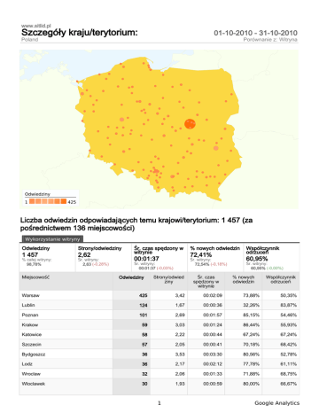 www.sitlid.pl Szczegóły kraju/terytorium: 01-10-2010 - 31-10-2010 Poland Porównanie z: Witryna Odwiedziny 1 425 Liczba odwiedzin odpowiadających temu krajowi/terytorium: 1 457 (za pośrednictwem 136 miejscowości) Wykorzystanie witryny Odwiedziny Strony/odwiedziny 1 457 2,62 % całej witryny: 98,78% Śr. witryny: 2,63 (-0,28%) Miejscowość Śr. czas spędzony w witrynie % nowych odwiedzin 00:01:37 Śr. witryny: 72,54% (-0,18%) Śr. witryny: 00:01:37 (-0,03%) Odwiedziny Strony/odwied ziny 72,41% Śr. czas spędzony w witrynie Współczynnik odrzuceń 60,95% Śr. witryny: 60,95% (-0,00%) % nowych odwiedzin Współczynnik odrzuceń Warsaw 425 3,42 00:02:09 73,88% 50,35% Lublin 124 1,67 00:00:36 32,26% 83,87% Poznan 101 2,69 00:01:57 85,15% 54,46% Krakow 59 3,03 00:01:24 86,44% 55,93% Katowice 58 2,22 00:00:44 67,24% 67,24% Szczecin 57 2,05 00:00:41 70,18% 68,42% Bydgoszcz 36 3,53 00:03:30 80,56% 52,78% Lodz 36 2,17 00:02:12 77,78% 61,11% Wroclaw 32 2,06 00:01:33 71,88% 68,75% Wloclawek 30 1,93 00:00:59 80,00% 66,67% 1 Google Analytics 1 – 10 z 136 2 Google Analytics