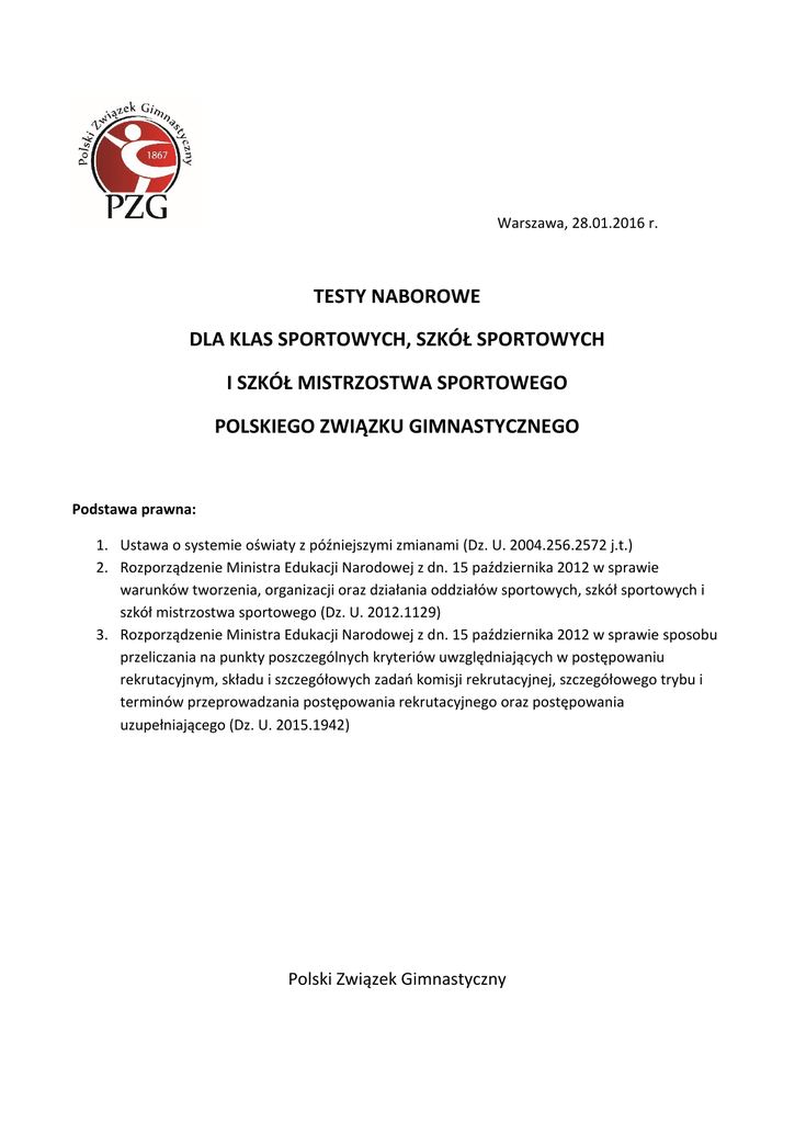 Warszawa, 28.01.2016 r. TESTY NABOROWE DLA KLAS SPORTOWYCH, SZKÓŁ SPORTOWYCH I SZKÓŁ MISTRZOSTWA SPORTOWEGO POLSKIEGO ZWIĄZKU GIMNASTYCZNEGO Podstawa prawna: 1. Ustawa o systemie oświaty z późniejszymi zmianami (Dz. U. 2004.256.2572 j.t.) 2. Rozporządzenie Ministra Edukacji Narodowej z dn. 15 października 2012 w sprawie warunków tworzenia, organizacji oraz działania oddziałów sportowych, szkół sportowych i szkół mistrzostwa sportowego (Dz. U. 2012.1129) 3. Rozporządzenie Ministra Edukacji Narodowej z dn. 15 października 2012 w sprawie sposobu przeliczania na punkty poszczególnych kryteriów uwzględniających w postępowaniu rekrutacyjnym, składu i szczegółowych zadań komisji rekrutacyjnej, szczegółowego trybu i terminów przeprowadzania postępowania rekrutacyjnego oraz postępowania uzupełniającego (Dz. U. 2015.1942) Polski Związek Gimnastyczny GIMNASTYKA SPORTOWA KOBIET TEST NABOROWY DO I KLASY SPORTOWEJ W SZKOLE PODSTAWOWEJ I SZKOLE PODSTAWOWEJ MISTRZOSTWA SPORTOWEGO Maksymalna liczba punktów wynosi 100. 1. Pomiar siły ramion i obręczy barkowej * w zwisie na drążku w nachwycie utrzymanie ciała na ugiętych rękach, drążek znajduje się minimum na wysokości oczu. Czas (s) Pkt 1s 3 2s 6 3s 9 4s 12 5s 15 6s 18 7 s i więcej 20 2. Pomiar siły mm brzucha * w zwisie unoszenie prostych nóg do poziomu. Ilość Pkt 1 4 2 8 3 12 4 16 5 i więcej 20 3. Próba gibkości * skłon w przód w siadzie płaskim – do 5 pkt * skłon w przód w siadzie rozkrocznym – do 5 pkt. * szpagat wykroczny na lepszą nogę – do 5 pkt Odchylenia kątów od pożądanych wartości. do 20 - 5 pkt 20 - 45 – 3 pkt 45 – 0 pkt 4. Ćwiczenia równoważne, materace asekuracyjne pod równoważnią 40 cm. Materac do zeskoku 40 cm. * przejście po równoważni samodzielnie – do 10 pkt. w tym: - samodzielne wejście na równoważnię do 3 pkt - samodzielne przejście po równoważni z asekuracją do 4 pkt - samodzielny zeskok na materac 3 pkt 5. Próba szybkości –bieg na odcinku 20 m * technika biegu Ocena Pkt Słaba 1-4 Dobra 5-12 wybitna 13-20 6. Wizualna ocena sylwetki – do 15 pkt * wzrost do 125 cm – 5 pkt, 126-130 cm – 3 pkt, powyżej 130 cm – 1 pkt * masa ciała do 25 kg – 5 pkt, 26-30 kg – 3 pkt, powyżej 30 kg – 1 pkt * brak widocznych wad postawy – 5 pkt Tabela norm sprawności Sprawność Suma punktów Wybitna Powyżej 70 pkt Dobra 51-70 pkt Średnia 30– 50 pkt Niska poniżej 30 pkt Uzyskanie co najmniej średniej normy sprawności jest wynikiem pozytywnym, kwalifikującym do szkolenia w I klasie sportowej w szkoły podstawowej i szkole podstawowej mistrzostwa sportowego. TEST NABOROWY DO I KLASY SPORTOWEJ W GIMNAZJUM I GIMNAZJUM MISTRZOSTWA SPORTOWEGO Warunkiem wstępnym jest posiadanie co najmniej II kl. PZG. Maksymalna liczba punktów wynosi 100. 1. Podciągania w zwisie na górnej żerdzi (bez zamachu) o tułowiu prostym. Broda minimum na wysokości żerdzi. 1 podciągnięcie-1 pkt, max 10 pkt. 2. Wychwyty na dolnej żerdzi, odmach, tułów powyżej poziomu 1 wychwyt-2 pkt. max 10 pkt. 3. W zwisie na górnej żerdzi, twarzą do dolnej żerdzi koła prostym tułowiem-nogi nad dolną żerdzią, ręce proste. 1 koło-2 pkt. max 10 pkt. 4. Na planszy gimnastycznej obroty w staniu na rękach. Dojście do stania na RR, szpiczagą z palców. Obrót musi być zakończony w staniu na RR. 1 obrót-3 pkt., 2 obroty-6 pkt., 3 Obroty-10 pkt. itp. max 10 pkt. 5. Na niskich stojaczkach szpiczagi z podporu nogi w rozkroku w poziomce. Po szpiczadze zejście do podporu w rozkroku, do poziomki, RR proste. 1 spiczaga-2 pkt., 2 szpiczagi 4 pkt., 3 spiczagi-6 pkt. itp max 10 pkt. 6. Na równoważni obroty na 1 nodze. Po obrocie można zejść na całą stopę. Liczy się najlepszy wynik z 3 podejść. 180-3 pkt., 360-6 pkt., 540-10 pkt. max 10 pkt. 7. Wysoka poziomka na równoważni (na czas). Nogi razem minimum w pionie. 3 sek.-2 pkt., 6 sek.-4 pkt., 9 sek.-6 pkt. itp. max 10 pkt. 8. Gibkość-3 szpagaty, tułów prosty, ręce w górze każdy szpagat wykroczny-3 pkt, szpagat rozkroczny-4 pkt, brak szpagatu 0 pkt., pośrednich punktów nie ma. max 10 pkt 9. Naskoki na górkę materacy 50 cm i zeskok w ciągu 30 sek. 30 naskoków-10 pkt., 28 naskoków-9 pkt, 26 naskoków-8 pkt. itp. max 10 pkt 10. Salto w tył kulone w miejscu w kwadracie 50 cm x 50 cm, lądowanie w kwadrat. Próbę wykonuje się tak długo dopóki jakaś część NN dotyka kwadratu. Po wylądowaniu nie wolno przestawiać NN. 1 razy-2 pkt. 2 razy-4 pkt. 3 razy-6 pkt. itp. max 10 pkt. TABELA NORM SPRAWNOŚCI I klasa sportowa Gimnazjum Sprawność Suma punktów wybitna powyżej 60 pkt wysoka 51-60 pkt średnia 35-50 pkt niska 25-34 pkt bardzo niska poniżej 25 pkt Uzyskanie co najmniej średniej sprawności jest wynikiem pozytywnym, kwalifikującym do szkolenia sportowego w klasie sportowej w Gimnazjum lub w Gimnazjum Mistrzostwa Sportowego. TEST NABOROWY DO I KLASY SPORTOWEJ W SZKOLE PONADGIMNAZJALNEJ I W SZKOLE PONADGIMNAZJALNEJ MISTRZOSTWA SPORTOWEGO Warunkiem wstępnym jest posiadanie co najmniej II elite kl. PZG. Maksymalna liczba punktów wynosi 100. 1. Podciągania w zwisie na górnej żerdzi (bez zamachu) o tułowiu prostym. Broda minimum na wysokości żerdzi. 1 podciągnięcie-1 pkt, max 10 pkt. 2. Wychwyty na dolnej żerdzi, odmach, tułów powyżej poziomu 1 wychwyt-2 pkt. max 10 pkt. 3. W zwisie na górnej żerdzi, twarzą do dolnej żerdzi koła prostym tułowiem-nogi nad dolną żerdzią, ręce proste. 1 koło-2 pkt. max 10 pkt. 4. Na planszy gimnastycznej obroty w staniu na rękach. Dojście do stania na RR, szpiczagą z palców. Obrót musi być zakończony w staniu na RR. 1 obrót-3 pkt., 2 obroty-6 pkt., 3 Obroty-10 pkt. max 10 pkt. 5. Na niskich stojaczkach szpiczagi z podporu nogi w rozkroku w poziomce. Po szpiczadze zejście do podporu w rozkroku, do poziomki, RR proste. 1 spiczaga-2 pkt., 2 szpiczagi 4 pkt., 3 spiczagi-6 pkt. itp. max 10 pkt. 6. Na równoważni obroty na 1 nod
