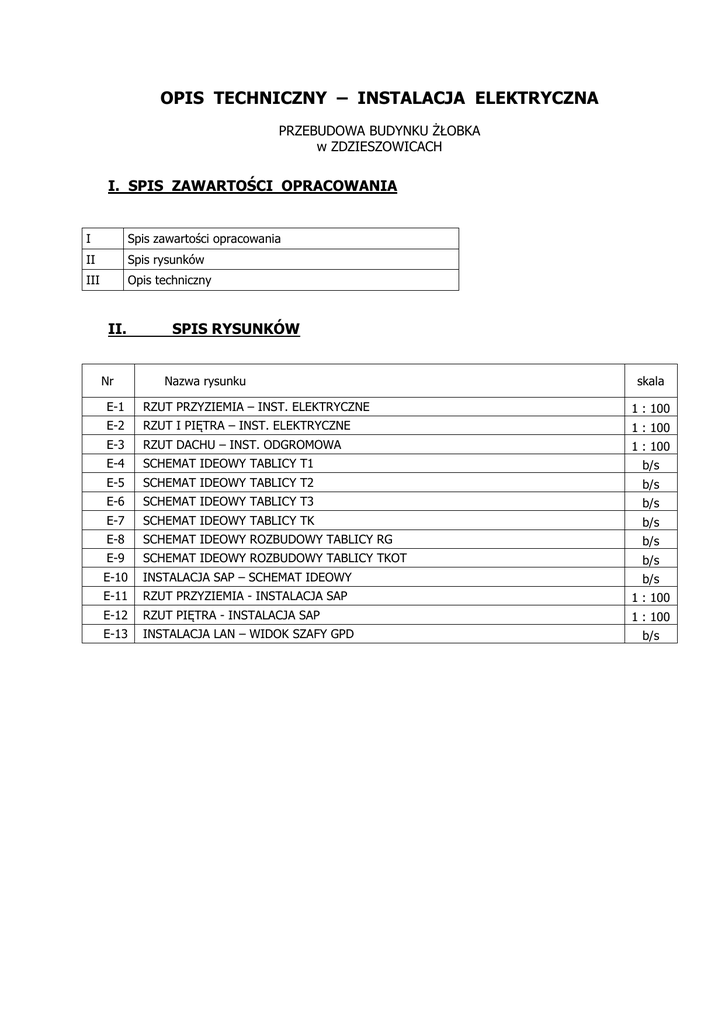 OPIS TECHNICZNY – INSTALACJA ELEKTRYCZNA PRZEBUDOWA BUDYNKU ŻŁOBKA w ZDZIESZOWICACH I. SPIS ZAWARTOŚCI OPRACOWANIA I Spis zawartości opracowania II Spis rysunków III Opis techniczny II. Nr SPIS RYSUNKÓW Nazwa rysunku skala E-1 RZUT PRZYZIEMIA – INST. ELEKTRYCZNE 1 : 100 E-2 RZUT I PIĘTRA – INST. ELEKTRYCZNE 1 : 100 E-3 RZUT DACHU – INST. ODGROMOWA 1 : 100 E-4 SCHEMAT IDEOWY TABLICY T1 b/s E-5 SCHEMAT IDEOWY TABLICY T2 b/s E-6 SCHEMAT IDEOWY TABLICY T3 b/s E-7 SCHEMAT IDEOWY TABLICY TK b/s E-8 SCHEMAT IDEOWY ROZBUDOWY TABLICY RG b/s E-9 SCHEMAT IDEOWY ROZBUDOWY TABLICY TKOT b/s E-10 INSTALACJA SAP – SCHEMAT IDEOWY b/s E-11 RZUT PRZYZIEMIA - INSTALACJA SAP 1 : 100 E-12 RZUT PIĘTRA - INSTALACJA SAP 1 : 100 E-13 INSTALACJA LAN – WIDOK SZAFY GPD b/s III. Opis techniczny Spis treści: 1. 2. 3. 4. 4.1. 5. 5.1. 5.2. 5.2.1. 5.3. 5.3.1. 5.4. 5.5. 5.6. 6. 7. 8. 9. 10. 11. 11.1. 12. 13. 14. 15. 16. 17. 18. Temat opracowania ......................................................................................................................................... 3 Podstawa opracowania projektu .................................................................................................................... 3 Zakres projektu ................................................................................................................................................ 3 Zasilanie obiektu: ............................................................................................................................................. 3 Przyłącze energetyczne ................................................................................................................................... 3 Instalacje elektryczne wewnętrzne: .............................................................................................................. 3 Rozdzielnica Główna RG ................................................................................................................................. 3 Instalacja oświetlenia ...................................................................................................................................... 3 Osprzęt łączeniowy .......................................................................................................................................... 4 Instalacja gniazd 230V/400V ......................................................................................................................... 4 Osprzęt łączeniowy .......................................................................................................................................... 4 Zasilanie urządzeń układu wentylacji ............................................................................................................ 4 Zasilanie wind towarowych ............................................................................................................................ 4 Oświetlenie awaryjne ...................................................................................................................................... 4 Okablowanie strukturalne ............................................................................................................................... 5 Instalacja monitoringu wizyjnego CCTV ....................................................................................................... 6 Instalacja domofonowa ................................................................................................................................... 6 Pożarowy wyłącznik prądu: ............................................................................................................................ 6 Instalacja oddymiania grawitacyjnego klatek schodowych ....................................................................... 6 Instalacja sygnalizacji pożaru ........................................................................................................................ 7 Uwagi końcowe .............................................................................................................................................. 11 Instalacja piorunochronna LPS .................................................................................................................... 12 Połączenia wyrównawcze ............................................................................................................................. 12 Ochrona przeciwprzepięciowa ...................................................................................................................... 12 Ochrona przeciwporażeniowa ...................................................................................................................... 12 Materiały ......................................................................................................................................................... 13 Próby i badania powykonawcze ................................................................................................................... 13 Uwagi końcowe .............................................................................................................................................. 13 1. Temat opracowania Przedmiotem opracowania jest projekt wykonawczy wewnętrznej instalacji elektrycznej Budynku Żłobka w Zdzieszowicach. 2. Podstawa opracowania projektu - zlecenie inwestora, - ustalenia i wytyczne inwestora, - inwentaryzacja w terenie, - obowiązujące przepisy i normy. 3. Zakres projektu Projekt techniczny swoim zakresem obejmuje: - rozbudowę rozdzielnicy głównej budynku RG, - lokalne tablice elektryczne, - instalację gniazd 230V i 400V, - instalację oświetlenia podstawowego, - instalację oświetlenia awaryjnego, - instalację systemu sygnalizacji pożaru, - instalację sieci teleinformatycznej, - zasilanie odbiorników stałych, - instalację odgromową budynku. 4. Zasilanie obiektu: 4.1. Pr