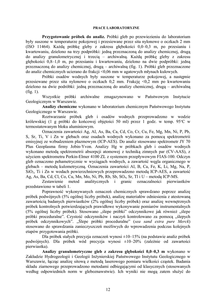 PRACE LABORATORYJNE Przygotowanie próbek do analiz. Próbki gleb po przewiezieniu do laboratorium były suszone w temperaturze pokojowej i przesiewane przez sita nylonowe o oczkach 2 mm (ISO 11464). Każdą próbkę gleby z zakresu głębokości 0,0–0,3 m, po przesianiu i kwartowaniu, dzielono na trzy podpróbki: jedną przeznaczoną do analizy chemicznej, drugą do analizy granulometrycznej i trzecią – archiwalną. Każdą próbkę gleby z zakresu głębokości 0,8–1,0 m, po przesianiu i kwartowaniu, dzielono na dwie podpróbki: jedną przeznaczoną do analizy chemicznej, drugą – archiwalną (fig. 1). Próbki gleb przeznaczone do analiz chemicznych ucierano do frakcji <0,06 mm w agatowych młynach kulowych. Próbki osadów wodnych były suszone w temperaturze pokojowej, a następnie przesiewane przez sita nylonowe o oczkach 0,2 mm. Frakcję <0,2 mm po kwartowaniu dzielono na dwie podróbki: jedną przeznaczoną do analizy chemicznej, drugą – archiwalną (fig. 1). Wszystkie próbki archiwalne zmagazynowano w Państwowym Instytucie Geologicznym w Warszawie. Analizy chemiczne wykonano w laboratorium chemicznym Państwowego Instytutu Geologicznego w Warszawie. Roztwarzanie próbek gleb i osadów wodnych przeprowadzono w wodzie królewskiej (1 g próbki do końcowej objętości 50 ml) przez 1 godz. w temp. 95 oC w termostatowanym bloku aluminiowym. Oznaczenia zawartości Ag, Al, As, Ba, Ca, Cd, Co, Cr, Cu, Fe, Mg, Mn, Ni, P, Pb, S, Sr, Ti, V i Zn w glebach oraz osadach wodnych wykonano za pomocą spektrometrii emisyjnej ze wzbudzeniem plazmowym (ICP-AES). Do analiz stosowano spektrometr JY 70 Plus Geoplasma firmy Jobin-Yvon. Analizy Hg w próbkach gleb i osadów wodnych wykonano metodą spektrometrii absorpcji atomowej z techniką zimnych par (CV-AAS), z użyciem spektrometru Perkin-Elmer 4100 ZL z systemem przepływowym FIAS-100. Odczyn gleb oznaczono pehametrycznie w wyciągach wodnych, a zawartość węgla organicznego w glebach – metodą kulometryczną. Oznaczenia zawartości Al, B, Ca, Fe, K, Li, Mg, Na, P, SiO2, Ti i Zn w wodach powierzchniowych przeprowadzono metodą ICP-AES, a zawartość Ag, As, Ba, Cd, Cl, Co, Cu, Mn, Mo, Ni, Pb, Rb, Sb, SO4, Sr, Tl i U – metodą ICP-MS. Zestawienie metod analitycznych i granic oznaczalności pierwiastków przedstawiono w tabeli 1. Poprawność wykonywanych oznaczeń chemicznych sprawdzano poprzez analizę próbek podwójnych (5% ogólnej liczby próbek), analizę materiałów odniesienia z atestowaną zawartością badanych pierwiastków (2% ogólnej liczby próbek) oraz analizę wewnętrznych próbek kontrolnych potwierdzających prawidłowe wykonywanie pomiarów instrumentalnych (5% ogólnej liczby próbek). Stosowano „ślepe próbki” odczynnikowe jak również „ślepe próbki proceduralne”. Czystość odczynników i naczyń kontrolowano za pomocą „ślepych próbek odczynnikowych”. „Ślepe próbki proceduralne” (sea sand extra pure Merck) stosowano do sprawdzania zanieczyszczeń możliwych do wprowadzenia podczas kolejnych etapów przygotowania próbki. Dla próbek stałych precyzja oznaczeń wynosi ±10–15% (na podstawie analiz próbek podwójnych). Dla próbek wód precyzja wynosi ±10–20% (zależnie od zawartości pierwiastka). Analizy granulometryczne gleb z zakresu głębokości 0,0–0,3 m wykonano w Zakładzie Hydrogeologii i Geologii Inżynierskiej Państwowego Instytutu Geologicznego w Warszawie, łącząc analizę sitową z metodą laserowego pomiaru wielkości cząstek. Badania składu ziarnowego przeprowadzono metodami odbiegającymi od klasycznych (stosowanych według odpowiednich norm w gleboznawstwie). Ich wyniki nie mogą zatem służyć do 12 podziału gleb według kryteriów gleboznawczych. Są natomiast bardzo pomocne przy interpretacji wyników badań geochemicznych. Próbki przesiewano przez zestaw sit o oczkach 2 mm, 1 mm i 0,5 mm. Próbki niektórych gleb gliniastych rozdrabniano w moździerzu porcelanowym przed przesiewaniem. Ważono uzyskane frakcje: 2–1 mm, 1,0–0,5 mm i <0,5 mm. Pomiary wielkości ziaren we frakcji <0,5 mm przeprowadzono za pomocą laserowego miernika wielkości cząstek Analysette-22 firmy Fritsch. Wyniki analiz granulometrycznych (po przeliczeniu na udziały procentowe) przedstawiono na mapach z uwzględnieniem wybranych klas ziarnowych: 1,0–0,1 mm – frakcja piaszczysta, 0,1–0,02 mm – frakcja pylasta, <0,02 mm – frakcja ilasta (tabl. 4–6). 13