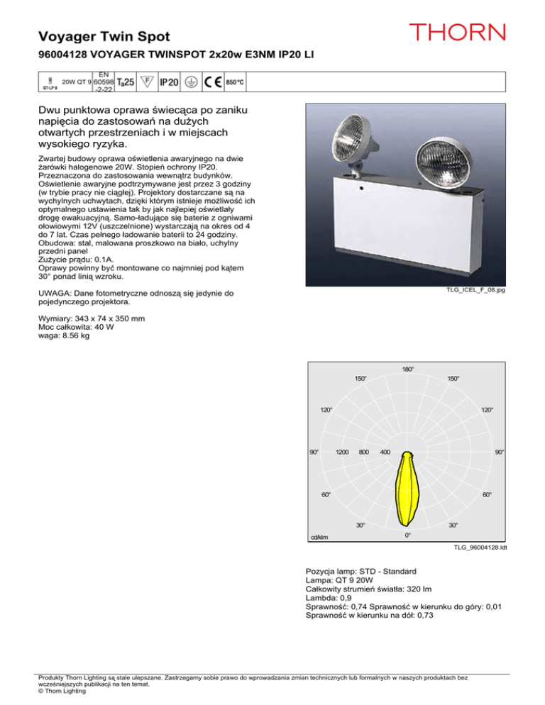 Voyager Twin Spot 96004128 VOYAGER TWINSPOT 2x20w E3NM IP20 LI 20W QT 9 Dwu punktowa oprawa świecąca po zaniku napięcia do zastosowań na dużych otwartych przestrzeniach i w miejscach wysokiego ryzyka. Zwartej budowy oprawa oświetlenia awaryjnego na dwie żarówki halogenowe 20W. Stopień ochrony IP20. Przeznaczona do zastosowania wewnątrz budynków. Oświetlenie awaryjne podtrzymywane jest przez 3 godziny (w trybie pracy nie ciągłej). Projektory dostarczane są na wychylnych uchwytach, dzięki którym istnieje możliwość ich optymalnego ustawienia tak by jak najlepiej oświetlały drogę ewakuacyjną. Samo-ładujące się baterie z ogniwami ołowiowymi 12V (uszczelnione) wystarczają na okres od 4 do 7 lat. Czas pełnego ładowanie baterii to 24 godziny. Obudowa: stal, malowana proszkowo na biało, uchylny przedni panel Zużycie prądu: 0.1A. Oprawy powinny być montowane co najmniej pod kątem 30° ponad linią wzroku. TLG_ICEL_F_08.jpg UWAGA: Dane fotometryczne odnoszą się jedynie do pojedynczego projektora. Wymiary: 343 x 74 x 350 mm Moc całkowita: 40 W waga: 8.56 kg 180° 150° 150° 120° 90° 120° 1200 800 90° 400 60° 60° 30° cd/klm 30° 0° TLG_96004128.ldt Pozycja lamp: STD - Standard Lampa: QT 9 20W Całkowity strumień światła: 320 lm Lambda: 0,9 Sprawność: 0,74 Sprawność w kierunku do góry: 0,01 Sprawność w kierunku na dół: 0,73 Produkty Thorn Lighting są stale ulepszane. Zastrzegamy sobie prawo do wprowadzania zmian technicznych lub formalnych w naszych produktach bez wcześniejszych publikacji na ten temat. © Thorn Lighting