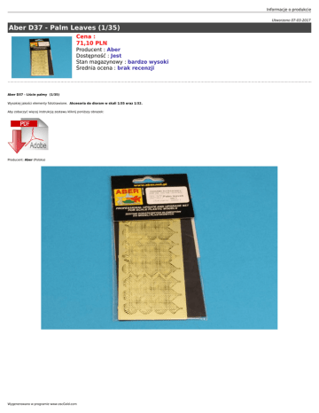 Informacje o produkcie Utworzono 07-03-2017 Aber D37 - Palm Leaves (1/35) Cena : 71,10 PLN Producent : Aber Dostępność : Jest Stan magazynowy : bardzo wysoki Średnia ocena : brak recenzji Aber D37 - Liście palmy (1/35) Wysokiej jakości elementy fototrawione. Akcesoria do dioram w skali 1/35 oraz 1/32. Aby zobaczyć więcej instrukcję zestawu kliknij poniższy obrazek: Producent: Aber (Polska) Wygenerowano w programie www.oscGold.com Polecamy! Ważne informacje: Prosimy o dokładne zapoznanie się z zasadami działania naszego sklepu. To bardzo ważne i pozwoli na uniknięcie nieporozumień związanych z koniecznością oczekiwania na przesyłkę. Wszystkie zamówienia realizujemy w kolejności zgłoszeń. Wybranie "przesyłka priorytetowa" jako sposobu wysyłki nie oznacza, że paczka zostanie wysłana na drugi dzień. To tylko rodzaj usługi pocztowej. Firma Jadar-Model jest właścicielem dwóch sklepów. Jeden z nich to sklep internetowy, drugi zaś jest prawdziwy i mieści się w Warszawie, stolicy Polski. Te same modele i akcesoria oferowane w sklepie internetowym sprzedawane są w jednocześnie w obu sklepach. Ponieważ nasza oferta jest bardzo duża nie mamy magazynu z wielką ilością tych samych przedmiotów. Może zdarzyć się, że model, który chcesz kupić został sprzedany w drugim sklepie. Wtedy zostaniesz powiadomiony emailem, że realizacja Twojego zamówienia będzie dłuższa, ponieważ musimy uzupełnić magazyn i czekamy na dostawę od producenta. Prosimy o cierpliwość i wyrozumiałość. Nie ponosimy odpowiedzialności za różnicę w zawartości pudełka w stosunku do prezentowanego zdjęcia. Zdjęcia są zazwyczaj reklamówkami i mogą zawierać również inne części, które nie wchodzą w skład danego produktu. Salon Modelarski Jadar-Model Ul. Jagiellońska 58, 03-468 Warszawa (przy Pl.Hallera) tel.(0 22) 403-34-30 (w sprawie zamówień prosimy dzwonić: (0 22) 620-05-39) Tutaj jesteśmy - kliknij poniższy link: Warszawa, Jagiellońska 58 sklep jest czynny w godz.: pon.-pt. 11.oo 19.oo sobota 10.oo 14.oo