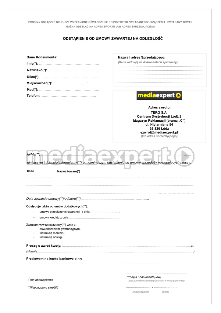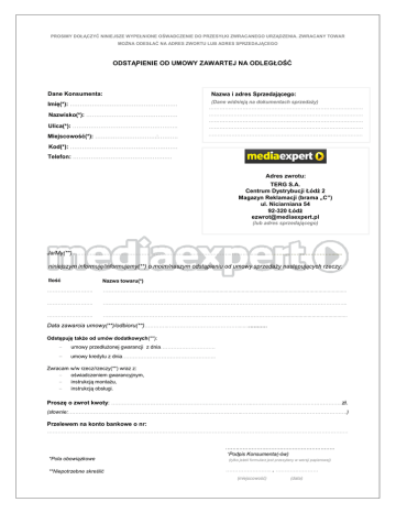 PROSIMY DOŁĄCZYĆ NINIEJSZE WYPEŁNIONE OŚWADCZENIE DO PRZESYŁKI ZWRACANEGO URZĄDZENIA. ZWRACANY TOWAR MOŻNA ODESŁAĆ NA ADRES ZWORTU LUB ADRES SPRZEDAJĄCEGO ODSTĄPIENIE OD UMOWY ZAWARTEJ NA ODLEGŁOŚĆ Nazwa i adres Sprzedającego: Dane Konsumenta: Imię(*): ……………………………………………… Nazwisko(*): ………………………………………. Ulica(*): …………………………………………….. Miejscowość(*): ………………………….:………. (Dane widnieją na dokumentach sprzedaży) …………………………………………………………………………… …………………………………………………………………………… …………………………………………………………………………… …………………………………………………………………………… …………………………………………………………………………… Kod(*): ……………………………………………… Telefon: ……………………………………….…. Adres zwrotu: TERG S.A. Centrum Dystrybucji Łódź 2 Magazyn Reklamacji (brama „C”) ul. Niciarniana 54 92-320 Łódź [email protected] (lub adres sprzedającego) Ja/My(**) ……………………………………………………………………………..………................……………………………........ niniejszym informuję/informujemy(**) o moim/naszym odstąpieniu od umowy sprzedaży następujących rzeczy: Ilość Nazwa towaru(*) …………………….. ……………………………………………….................................................................................................... …………………….. ………………………………………………………………….…………………………………………………….. …………………….. …………………………………………………………………………………………........................................... Data zawarcia umowy(**)/odbioru(**)…………..………………………………….................. Odstępuję także od umów dodatkowych(**): − umowy przedłużonej gwarancji z dnia…………………………. − umowy kredytu z dnia…………………………………………….. Zwracam − − − w/w rzecz/rzeczy(**) wraz z: oświadczeniem gwarancyjnym, instrukcją montażu, instrukcją obsługi. Proszę o zwrot kwoty: ……………………………………………………………………..…………………………….……………..zł. (słownie:……………………………………………………………….……………………...………………………………………………….) Przelewem na konto bankowe o nr: ………………………………………………………………………………………………………………….…………………………………. ……..……………………………………………… *Podpis Konsumenta(-ów) *Pola obowiązkowe **Niepotrzebne skreślić (tylko jeżeli formularz jest przesyłany w wersji papierowej) …………………….. , …………………… (miejscowość) (data)