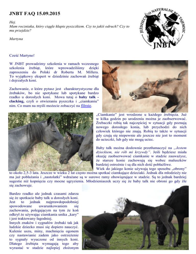 JNBT FAQ 15.09.2015 Hej. Mam roczniaka, który ciągle kłapie pyszczkiem. Czy to jakiś odruch? Czy to mu przejdzie? Martyna Cześć Martyno! W JNBT prowadzimy szkolenia w ramach wczesnego szkolenia źrebiąt, które wprowadziliśmy dzięki zaproszeniu do Polski dr Roberta M. Millera. To wyjątkowy ekspert w dziedzinie zachowań źrebiąt i dojrzałych koni. Zachowanie, o które pytasz jest charakterystyczne dla źrebaków, bo nie spotykane lub spotykane bardzo rzadko u dorosłych koni. Mowa tutaj o baby talk clacking, czyli o otwieraniu pyszczka i „ciamkaniu” nim. Co mam na myśli możecie zobaczyć na filmie. „Ciamkanie” jest wrodzone u każdego źrebięcia. Już w kilka godzin po urodzeniu można je zaobserwować. Źrebaczki robią tak najczęściej w sytuacji gdy poznają nowego dorosłego konia, lub przychodzi do nich człowiek którego nie znają. Robią to także w sytuacji gdy czują się niepewnie ale jeszcze nie jest to moment do ucieczki, lub gdy nie mogą uciec. Baby talk można dosłownie przetłumaczyć na „Jestem dzieckiem, nie rób mi krzywdy”. Jeśli będziesz miała okazję zaobserwować ciamkanie w stadzie zauważysz, że starsze konie zachowują się wobec maluszków bardziej ostrożnie i są dla nich dość pobłażliwe. Wiek do jakiego konie używają tego sposobu „obrony” to około 2,5-3 lata. Jeszcze w wieku 2 lat często można spotkać ciamkające dzieciaki. Jednak dla młodzieży nie ma już pobłażania i „nastolatki” wdrażane są w surowe ramy obowiązujące w stadzie. Są to jednak bardziej sugestie niż kopnięcia czy mocne ugryzienia. Młodzieniaszek uczy się że baby talk nie obroni go gdy źle się zachowuje. Bardzo rzadko ale jednak czasami zdarza się że spotkacie baby talk u dorosłych koni. Jest to jednak najprawdopodobniej spowodowane uwarunkowaniem się zachowania, polegającym na tym że koń odkrył że używając ciamkania unika „kary” i jest traktowany łagodniej. Innych znaków i sygnałów źrebaki tak jak ludzkie dziecko musi się dopiero nauczyć. Kulenie uszu, miny, machnięcia ogonem czy nastawianie zadem jako ostrzeżenie to sygnały wyuczone od innych koni. Dlatego źrebięta wymagają tego aby wyrastać w stadzie najlepiej złożonym z klaczy, wałachów i innych źrebaków/młodzieży. Ideałem jest tabun złożony z ogiera, klaczy i źrebiąt. Sieroty pozostawiane na dłuższy czas bez stada są „niemowami” lub ich mowa ciała jest bardzo upośledzona. Opiekę nad źrebiętami powinna sprawować osoba doświadczona ponieważ jest to zadanie dość niebezpieczne. Maluchy bowiem nie stosują faz w komunikacji. Źrebię nie skuli uszu żeby nas ostrzec przed kopnięciem, on po postu nastawi się i kopnie i zrobi to bardzo szybko. Traktuj źrebięta delikatnie i z łagodnością ale konsekwentnie i nie zapominaj, że przyjdzie kiedyś czas wymagań. Powodzenia! Tosia JNBT