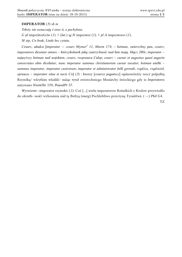 Słownik polszczyzny XVI wieku - wersja elektroniczna hasło: IMPERATOR (stan na dzień: 18-10-2015) www.spxvi.edu.pl strona 1/1 IMPERATOR (3) sb m Teksty nie oznaczają é oraz ó; a pochylone. G pl imperåtor(o)w (1). ◊ (lat.) sg N imperator (1). ◊ pl A imperatores (1). Sł stp, Cn brak, Linde bez cytatu. Cesarz, władca [imperator — cesarz Mymer1 11, Murm 174; – hetman, zwierzchny pan, cesarz; imperatores dicuntur omnes ‒ którzykolwiek jaką zwierzchność nad kim mają. Mącz 280c; imperator – najwyższy hetman nad wojskiem, cesarz, rozprawca Calep; cesarz ‒ caesar et augustus quasi augurio consecratus olim dicebatur, nunc imperator summus christianorum caesar vocatur; hetman wielki ‒ summus imperator, imperator castrorum; imperator et administrator belli gerendi; rządźca, rządziciel, sprawca – imperator vitae et necis Cn] (3) : ktorzy [cesarze pogańscy] opánowáwſzy rzecż poſpolitą Rzymſką/ wſzytkim władáli/ máiąc tytuł zwierzchniego Monárchy świeckiego gdy ie Imperatores názywano NiemObr 159; PowodPr 57. Wyrażenie: »imperator rzymski« (1): Coż [...] wielu imperatorow Rzimſkich y Krolow przywiodło do okruth- nośći wykonánia nád tę Beſtyą (marg) Pochlebſtwo przicżyną Tyrańſtwá. ( —) Phil G4. TZ