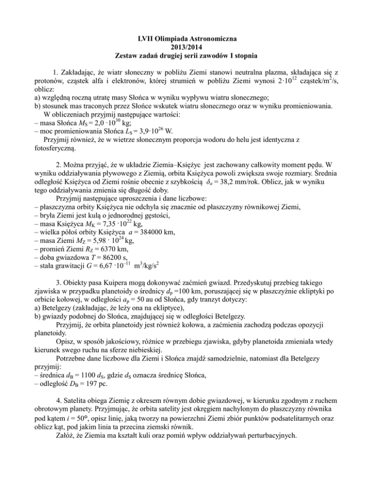 LVII Olimpiada Astronomiczna 2013/2014 Zestaw zadań drugiej serii zawodów I stopnia 1. Zakładając, że wiatr słoneczny w pobliżu Ziemi stanowi neutralna plazma, składająca się z protonów, cząstek alfa i elektronów, której strumień w pobliżu Ziemi wynosi 2·1012 cząstek/m2/s, oblicz: a) względną roczną utratę masy Słońca w wyniku wypływu wiatru słonecznego; b) stosunek mas traconych przez Słońce wskutek wiatru słonecznego oraz w wyniku promieniowania. W obliczeniach przyjmij następujące wartości: – masa Słońca MS = 2,0 ·1030 kg; – moc promieniowania Słońca LS = 3,9·1026 W. Przyjmij również, że w wietrze słonecznym proporcja wodoru do helu jest identyczna z fotosferyczną. 2. Można przyjąć, że w układzie Ziemia–Księżyc jest zachowany całkowity moment pędu. W wyniku oddziaływania pływowego z Ziemią, orbita Księżyca powoli zwiększa swoje rozmiary. Średnia odległość Księżyca od Ziemi rośnie obecnie z szybkością δa = 38,2 mm/rok. Oblicz, jak w wyniku tego oddziaływania zmienia się długość doby. Przyjmij następujące uproszczenia i dane liczbowe: – płaszczyzna orbity Księżyca nie odchyla się znacznie od płaszczyzny równikowej Ziemi, – bryła Ziemi jest kulą o jednorodnej gęstości, – masa Księżyca MK = 7,35 ·1022 kg, – wielka półoś orbity Księżyca a = 384000 km, – masa Ziemi MZ = 5,98 · 1024 kg, – promień Ziemi RZ = 6370 km, – doba gwiazdowa T = 86200 s, – stała grawitacji G = 6,67 ·10–11 m3/kg/s2 3. Obiekty pasa Kuipera mogą dokonywać zaćmień gwiazd. Przedyskutuj przebieg takiego zjawiska w przypadku planetoidy o średnicy dp =100 km, poruszającej się w płaszczyźnie ekliptyki po orbicie kołowej, w odległości ap = 50 au od Słońca, gdy tranzyt dotyczy: a) Betelgezy (zakładając, że leży ona na ekliptyce), b) gwiazdy podobnej do Słońca, znajdującej się w odległości Betelgezy. Przyjmij, że orbita planetoidy jest również kołowa, a zaćmienia zachodzą podczas opozycji planetoidy. Opisz, w sposób jakościowy, różnice w przebiegu zjawiska, gdyby planetoida zmieniała wtedy kierunek swego ruchu na sferze niebieskiej. Potrzebne dane liczbowe dla Ziemi i Słońca znajdź samodzielnie, natomiast dla Betelgezy przyjmij: – średnica dB = 1100 dS, gdzie dS oznacza średnicę Słońca, – odległość DB = 197 pc. 4. Satelita obiega Ziemię z okresem równym dobie gwiazdowej, w kierunku zgodnym z ruchem obrotowym planety. Przyjmując, że orbita satelity jest okręgiem nachylonym do płaszczyzny równika pod kątem i = 50º, opisz linię, jaką tworzy na powierzchni Ziemi zbiór punktów podsatelitarnych oraz oblicz kąt, pod jakim linia ta przecina ziemski równik. Załóż, że Ziemia ma kształt kuli oraz pomiń wpływ oddziaływań perturbacyjnych.
