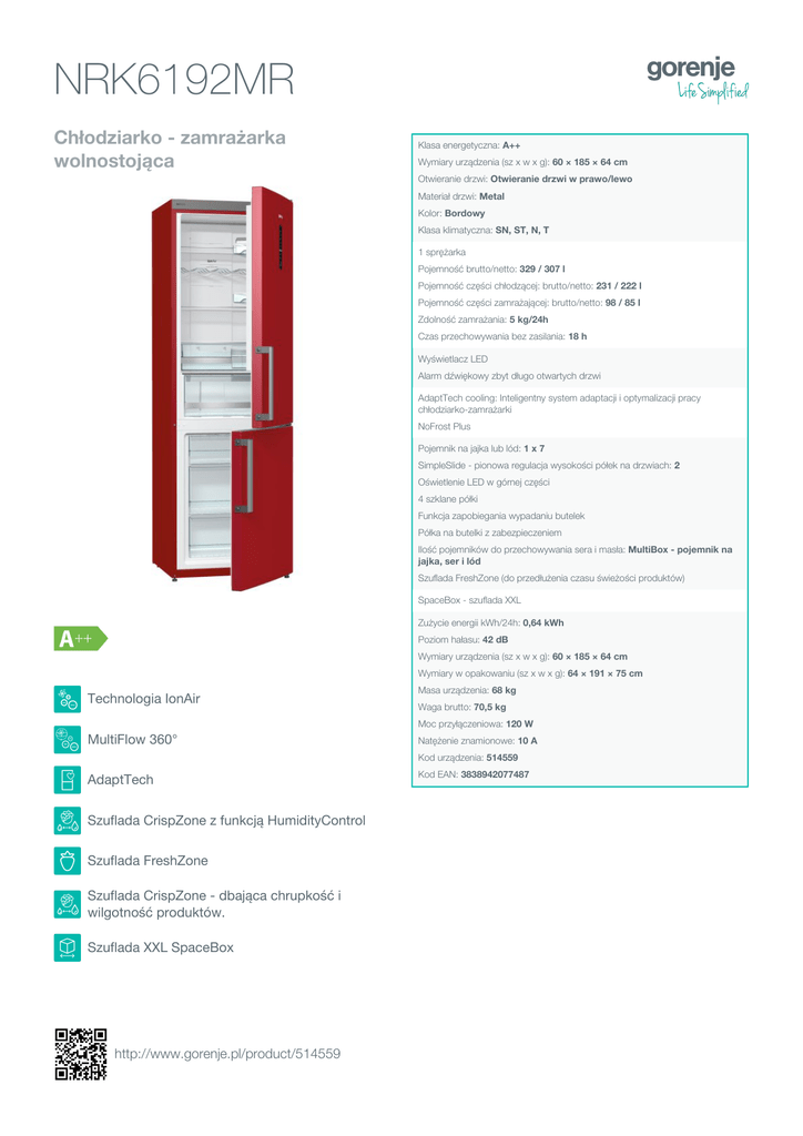NRK6192MR Chłodziarko - zamrażarka wolnostojąca Klasa energetyczna: A++ Wymiary urządzenia (sz x w x g): 60 × 185 × 64 cm Otwieranie drzwi: Otwieranie drzwi w prawo/lewo Materiał drzwi: Metal Kolor: Bordowy Klasa klimatyczna: SN, ST, N, T 1 sprężarka Pojemność brutto/netto: 329 / 307 l Pojemność części chłodzącej: brutto/netto: 231 / 222 l Pojemność części zamrażającej: brutto/netto: 98 / 85 l Zdolność zamrażania: 5 kg/24h Czas przechowywania bez zasilania: 18 h Wyświetlacz LED Alarm dźwiękowy zbyt długo otwartych drzwi AdaptTech cooling: Inteligentny system adaptacji i optymalizacji pracy chłodziarko-zamrażarki NoFrost Plus Pojemnik na jajka lub lód: 1 x 7 SimpleSlide - pionowa regulacja wysokości półek na drzwiach: 2 Oświetlenie LED w górnej części 4 szklane półki Funkcja zapobiegania wypadaniu butelek Półka na butelki z zabezpieczeniem Ilość pojemników do przechowywania sera i masła: MultiBox - pojemnik na jajka, ser i lód Szuflada FreshZone (do przedłużenia czasu świeżości produktów) SpaceBox - szuflada XXL Zużycie energii kWh/24h: 0,64 kWh Poziom hałasu: 42 dB Wymiary urządzenia (sz x w x g): 60 × 185 × 64 cm Wymiary w opakowaniu (sz x w x g): 64 × 191 × 75 cm Technologia IonAir Masa urządzenia: 68 kg Waga brutto: 70,5 kg Moc przyłączeniowa: 120 W MultiFlow 360° Natężenie znamionowe: 10 A Kod urządzenia: 514559 AdaptTech Szuflada CrispZone z funkcją HumidityControl Szuflada FreshZone Szuflada CrispZone - dbająca chrupkość i wilgotność produktów. Szuflada XXL SpaceBox http://www.gorenje.pl/product/514559 Kod EAN: 3838942077487