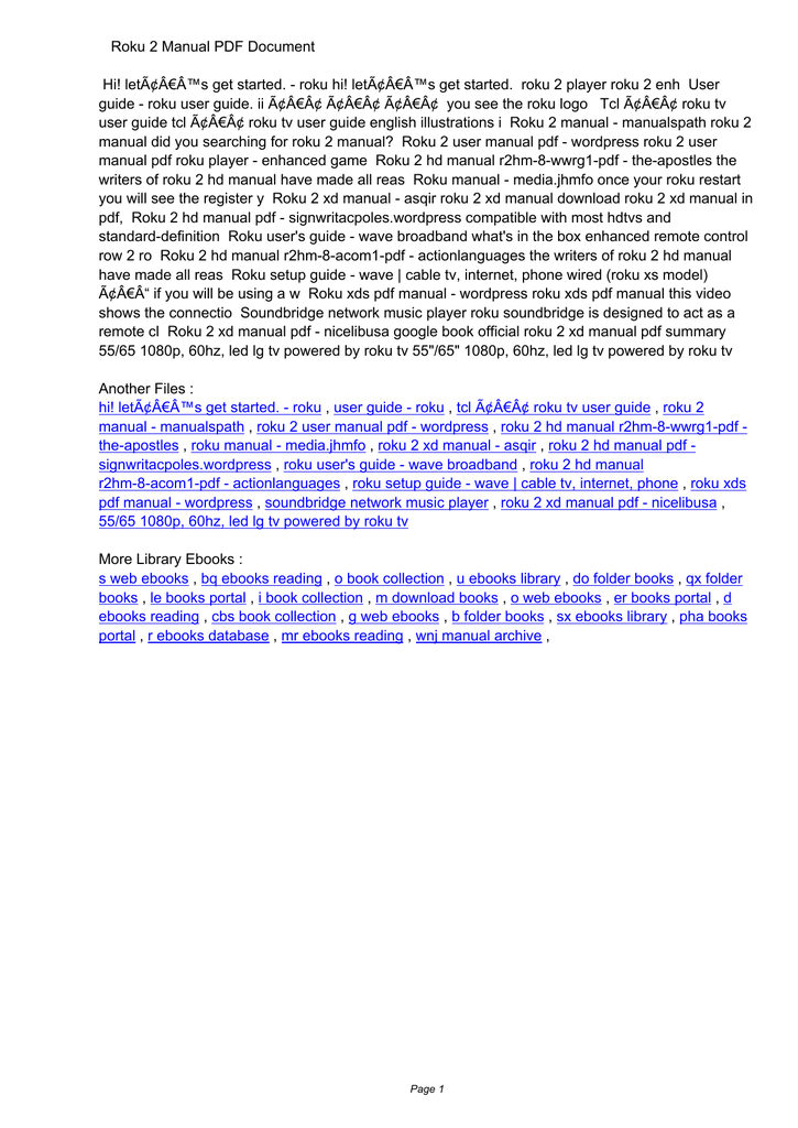 Roku 2 Manual PDF Document Hi! let’s get started. - roku hi! let’s get started. roku 2 player roku 2 enh User guide - roku user guide. ii • • • you see the roku logo Tcl • roku tv user guide tcl • roku tv user guide english illustrations i Roku 2 manual - manualspath roku 2 manual did you searching for roku 2 manual? Roku 2 user manual pdf - wordpress roku 2 user manual pdf roku player - enhanced game Roku 2 hd manual r2hm-8-wwrg1-pdf - the-apostles the writers of roku 2 hd manual have made all reas Roku manual - media.jhmfo once your roku restart you will see the register y Roku 2 xd manual - asqir roku 2 xd manual download roku 2 xd manual in pdf, Roku 2 hd manual pdf - signwritacpoles.wordpress compatible with most hdtvs and standard-definition Roku user's guide - wave broadband what's in the box enhanced remote control row 2 ro Roku 2 hd manual r2hm-8-acom1-pdf - actionlanguages the writers of roku 2 hd manual have made all reas Roku setup guide - wave | cable tv, internet, phone wired (roku xs model) – if you will be using a w Roku xds pdf manual - wordpress roku xds pdf manual this video shows the connectio Soundbridge network music player roku soundbridge is designed to act as a remote cl Roku 2 xd manual pdf - nicelibusa google book official roku 2 xd manual pdf summary 55/65 1080p, 60hz, led lg tv powered by roku tv 55"/65" 1080p, 60hz, led lg tv powered by roku tv Another Files : hi! let’s get started. - roku , user guide - roku , tcl • roku tv user guide , roku 2 manual - manualspath , roku 2 user manual pdf - wordpress , roku 2 hd manual r2hm-8-wwrg1-pdf the-apostles , roku manual - media.jhmfo , roku 2 xd manual - asqir , roku 2 hd manual pdf signwritacpoles.wordpress , roku user's guide - wave broadband , roku 2 hd manual r2hm-8-acom1-pdf - actionlanguages , roku setup guide - wave | cable tv, internet, phone , roku xds pdf manual - wordpress , soundbridge network music player , roku 2 xd manual pdf - nicelibusa , 55/65 1080p, 60hz, led lg tv powered by roku tv More Library Ebooks : s web ebooks , bq ebooks reading , o book collection , u ebooks library , do folder books , qx folder books , le books portal , i book collection , m download books , o web ebooks , er books portal , d ebooks reading , cbs book collection , g web ebooks , b folder books , sx ebooks library , pha books portal , r ebooks database , mr ebooks reading , wnj manual archive , Page 1