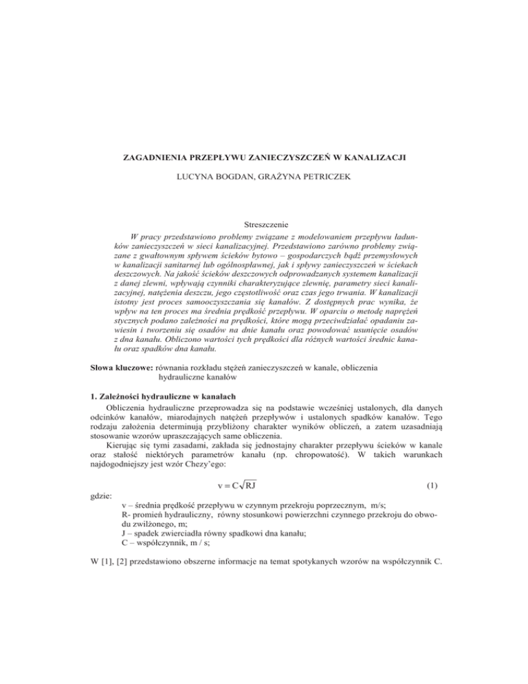 ZAGADNIENIA PRZEPŁYWU ZANIECZYSZCZEē W KANALIZACJI LUCYNA BOGDAN, GRAYNA PETRICZEK Streszczenie W pracy przedstawiono problemy związane z modelowaniem przepływu ładunków zanieczyszczeĔ w sieci kanalizacyjnej. Przedstawiono zarówno problemy związane z gwałtownym spływem Ğcieków bytowo – gospodarczych bądĨ przemysłowych w kanalizacji sanitarnej lub ogólnospławnej, jak i spływy zanieczyszczeĔ w Ğciekach deszczowych. Na jakoĞü Ğcieków deszczowych odprowadzanych systemem kanalizacji z danej zlewni, wpływają czynniki charakteryzujące zlewniĊ, parametry sieci kanalizacyjnej, natĊĪenia deszczu, jego czĊstotliwoĞü oraz czas jego trwania. W kanalizacji istotny jest proces samooczyszczania siĊ kanałów. Z dostĊpnych prac wynika, Īe wpływ na ten proces ma Ğrednia prĊdkoĞü przepływu. W oparciu o metodĊ naprĊĪeĔ stycznych podano zaleĪnoĞci na prĊdkoĞci, które mogą przeciwdziałaü opadaniu zawiesin i tworzeniu siĊ osadów na dnie kanału oraz powodowaü usuniĊcie osadów z dna kanału. Obliczono wartoĞci tych prĊdkoĞci dla róĪnych wartoĞci Ğrednic kanału oraz spadków dna kanału. Słowa kluczowe: równania rozkładu ste zanieczyszcze w kanale, obliczenia hydrauliczne kanałów 1. ZaleĪnoĞci hydrauliczne w kanałach Obliczenia hydrauliczne przeprowadza si na podstawie wczeniej ustalonych, dla danych odcinków kanałów, miarodajnych nate przepływów i ustalonych spadków kanałów. Tego rodzaju załoenia determinuj przybliony charakter wyników oblicze, a zatem uzasadniaj stosowanie wzorów upraszczajcych same obliczenia. Kierujc si tymi zasadami, zakłada si jednostajny charakter przepływu cieków w kanale oraz stało niektórych parametrów kanału (np. chropowato ). W takich warunkach najdogodniejszy jest wzór Chezy’ego: v = C RJ (1) gdzie: v – rednia prdko przepływu w czynnym przekroju poprzecznym, m/s; R- promie hydrauliczny, równy stosunkowi powierzchni czynnego przekroju do obwodu zwilonego, m; J – spadek zwierciadła równy spadkowi dna kanału; C – współczynnik, m / s; W [1], [2] przedstawiono obszerne informacje na temat spotykanych wzorów na współczynnik C. 5 Studies & Proceedings of Polish Association for Knowledge Management Nr 49, 2011 W Polsce rozpowszechniło si stosowanie do oblicze hydraulicznych kanałów ciekowych uproszczonego wzoru Kutnera: C= 100 R m + R (2) oraz wzoru Manninga w wersji podanej przez Flamanda: 1 C = 1n R 6 (3) Uwzgldniajc powysze zalenoci, rednia prdko w czynnym przekroju kanału ciekowego mona wyznaczy ze wzoru Kutnera dla J > 0,5 % : v= 100 ⋅ R (4) m+ R gdzie: m jest współczynnikiem szorstkoci (dla kanałów ciekowych m=0.35) oraz ze wzoru Manninga (najczciej stosowanego): 2 1 v = 1n R 3 ⋅ J 2 (5) gdzie n jest współczynnikiem szorstkoci. Dotychczas warto współczynnika szorstkoci przyjmowano jako stał (najczciej n = 0,013) dla całego zakresu wypełnie. Powodowało to due rozbienoci pomidzy wynikami oblicze, a pomiarami dokonywanymi w przypadku eksploatowanych kanałów. Przy projektowaniu nowych sieci kanalizacyjnych zaleca si korzystanie ze wzorów Darcyego i Colebrooka-Whitea: v= 1 λ 2g ⋅ J ⋅ d § 2,51 k · ¸¸ = −2 lg¨¨ + λ © Re λ 3,71d ¹ 1 (6) (7) gdzie: λ - współczynnik liniowy oporów tarcia; k – chropowato zastpcza odpowiadajca rednicy ziaren piasku jednorodnej warstewki pokrywajcej wewntrzn rednic przewodu, mm (dla rur PCV i PE przyjmuje si k=0,25, dla kamionki k=0,2-0,5 mm, a dla betonu k = 1,0-3,0 mm) d – rednica wewntrzna rurocigu, m ; Re - liczba Reynoldsa obliczana z zalenoci Re = v⋅d ν gdzie: ν - współczynnik lepkoci kinematycznej (m2/s) (8) 6 Lucyna Bogdan, GraĪyna Petriczek Zagadnienia przepływu zanieczyszczeĔ w kanalizacji Uwzgldniajc zaleno (7) i (8) w równaniu (6) otrzymujemy wzór na redni prdko przepływu w kanale przy całkowitym wypełnieniu: § § 2,51ν k ·¸ ·¸ v = ¨ − 2 lg¨ + ⋅ 2g ⋅ J ⋅ d ¨ d 2g ⋅ J ⋅ d 3,71 ⋅ d ¸ ¸ ¨ © ¹¹ © (9) Do oblicze hydraulicznych przy niepełnym wypełnieniu kanału stosuje si wzór: § § 2,51ν k ·¸ ·¸ v = ¨ − 2 lg¨ + ⋅ 2g ⋅ J ⋅ R ¨ R 2g ⋅ J ⋅ R 3,71 ⋅ R ¸ ¸ ¨ © ¹¹ © (10) w którym promie hydrauliczny R wylicza si w zalenoci od wartoci współczynnika napełnienia f okrelonego jako stosunek wysokoci napełnienia kanału h do rednicy kanału f = h d - przy współczynniku napełnienia f mniejszym lub równym 0,5: § · ¸ ¨ d 3 ¨ 1 sin (2arc cos(1 − 2f ) ) ¸ R= 1+ 2 arc cos(1 − 2f ) ¸ 4π ¨ 1− ¨ ¸ 180 © ¹ (11a) -przy współczynniku napełnienia 0,5< f ≤ 1 § · ¨ ¸ d ¨ 1 sin (2arc cos(2f − 1) ) ¸ R= 1+ 2 arc cos(2f − 1) ¸ 4π ¨ 1− ¨ ¸ 180 © ¹ 3 (11.b) Do oblicze hydraulicznych stosuje si take przybliony wzór Brettiga: q = 0,46 − 0,5 cos(π ⋅ f ) + 0,04 cos(2π ⋅ f ) Q (12) gdzie: q – natenie przepływu w kanale przy niepełnym napełnieniu Q - natenie przepływu przy pełnym wypełnieniu Analogicznie mona wyznaczy stosunek prdkoci przy czciowym wypełnieniu kanału do prdkoci przy całkowitym wypełnieniu. Zgodnie z zalenociami: v cz π ⋅ d 2 q = ⋅ V 4A Q gdzie: A – pole przekroju czynnego kanału postaci: (13.a) 7 Studies & Proceedings of Polish Association for Knowledge Management Nr 49, 2011 2 ( ) π arc cos(2f − 1) + 1 ⋅ sin (arc cos(2f − 1) ) A = d4 π − 360 2 (13.b) otrzymujemy: v cz = V π(0,46 − 0,5 cos( π ⋅ f ) + 0,04 cos( 2π ⋅ f ) ) π ⋅ arc cos( 2f − 1) 1 π− + 2 ⋅ sin (2 ⋅ arc cos( 2f − 1) ) 180 (13.c) Zalenoci te zostały przedstawione na Rysunku 1. 1,1 1 0,9 0,8 0,7 0,6 q/Q 0,5 v/V 0,4 0,3 0,2 0,1 0 0 0,1 0,2 0,3 0,4 0,5 0,6 0,7 0,8 0,9 1 1,1 h/d Rysunek 1. Wykresy zaleĪnoĞci przepływów i prĊdkoĞci od stopnia napełnienia kanału o przekroju kołowym W kanałach ciekowych systemu rozdzielczego przy całkowicie wypełnionym przekroju, prdkoci przepływu nie powinny by mniejsze ni 0,8 m /s. Przy mniejszych prdkociach naley przewidzie m