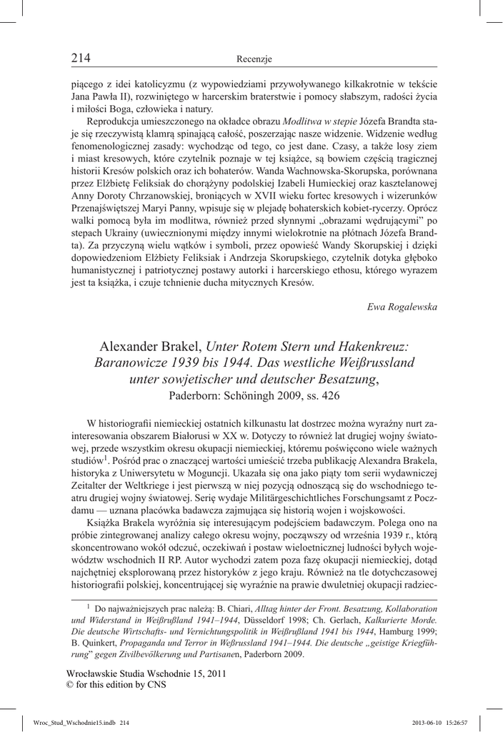 214 Recenzje piącego z idei katolicyzmu (z wypowiedziami przywoływanego kilkakrotnie w tekście Jana Pawła II), rozwiniętego w harcerskim braterstwie i pomocy słabszym, radości życia i miłości Boga, człowieka i natury. Reprodukcja umieszczonego na okładce obrazu Modlitwa w stepie Józefa Brandta staje się rzeczywistą klamrą spinającą całość, poszerzając nasze widzenie. Widzenie według fenomenologicznej zasady: wychodząc od tego, co jest dane. Czasy, a także losy ziem i miast kresowych, które czytelnik poznaje w tej książce, są bowiem częścią tragicznej historii Kresów polskich oraz ich bohaterów. Wanda Wachnowska-Skorupska, porównana przez Elżbietę Feliksiak do chorążyny podolskiej Izabeli Humieckiej oraz kasztelanowej Anny Doroty Chrzanowskiej, broniących w XVII wieku fortec kresowych i wizerunków Przenajświętszej Maryi Panny, wpisuje się w plejadę bohaterskich kobiet-rycerzy. Oprócz walki pomocą była im modlitwa, również przed słynnymi „obrazami wędrującymi” po stepach Ukrainy (uwiecznionymi między innymi wielokrotnie na płótnach Józefa Brandta). Za przyczyną wielu wątków i symboli, przez opowieść Wandy Skorupskiej i dzięki dopowiedzeniom Elżbiety Feliksiak i Andrzeja Skorupskiego, czytelnik dotyka głęboko humanistycznej i patriotycznej postawy autorki i harcerskiego ethosu, którego wyrazem jest ta książka, i czuje tchnienie ducha mitycznych Kresów. Ewa Rogalewska Alexander Brakel, Unter Rotem Stern und Hakenkreuz: Baranowicze 1939 bis 1944. Das westliche Weißrussland unter sowjetischer und deutscher Besatzung, Paderborn: Schöningh 2009, ss. 426 W historiografii niemieckiej ostatnich kilkunastu lat dostrzec można wyraźny nurt zainteresowania obszarem Białorusi w XX w. Dotyczy to również lat drugiej wojny światowej, przede wszystkim okresu okupacji niemieckiej, któremu poświęcono wiele ważnych studiów1. Pośród prac o znaczącej wartości umieścić trzeba publikację Alexandra Brakela, historyka z Uniwersytetu w Moguncji. Ukazała się ona jako piąty tom serii wydawniczej Zeitalter der Weltkriege i jest pierwszą w niej pozycją odnoszącą się do wschodniego teatru drugiej wojny światowej. Serię wydaje Militärgeschichtliches Forschungsamt z Poczdamu — uznana placówka badawcza zajmująca się historią wojen i wojskowości. Książka Brakela wyróżnia się interesującym podejściem badawczym. Polega ono na próbie zintegrowanej analizy całego okresu wojny, począwszy od września 1939 r., którą skoncentrowano wokół odczuć, oczekiwań i postaw wieloetnicznej ludności byłych województw wschodnich II RP. Autor wychodzi zatem poza fazę okupacji niemieckiej, dotąd najchętniej eksplorowaną przez historyków z jego kraju. Również na tle dotychczasowej historiografii polskiej, koncentrującej się wyraźnie na prawie dwuletniej okupacji radziec1 Do najważniejszych prac należą: B. Chiari, Alltag hinter der Front. Besatzung, Kollaboration und Widerstand in Weißrußland 1941–1944, Düsseldorf 1998; Ch. Gerlach, Kalkurierte Morde. Die deutsche Wirtschafts- und Vernichtungspolitik in Weißrußland 1941 bis 1944, Hamburg 1999; B. Quinkert, Propaganda und Terror in Weßrussland 1941–1944. Die deutsche „geistige Kriegführung” gegen Zivilbevölkerung und Partisanen, Paderborn 2009. Wrocławskie Studia Wschodnie 15, 2011 © for this edition by CNS Wroc_Stud_Wschodnie15.indb 214 2013-06-10 15:26:57 Recenzje 215 kiej tych ziem, praca Brakela oferuje interesującą, bo poszerzoną perspektywę badawczą. Jest bowiem pierwszą próbą całościowego ujęcia nie tyle polityki obu okupantów, choć i ona jest tu analizowana i porównywana, ile przede wszystkim różnorodnych reakcji na reżimy okupacyjne poddanej im ludności. Przy takich założeniach badawczych konieczne było przeprowadzenie bardzo rozległej kwerendy w archiwach i zbiorach polskich, niemieckich i białoruskich (materiały autobiograficzne, partyjne, wojskowe, administracji okupacyjnej, dokumentacja organizacji podziemnych). Autor zdecydował się przy tym na poddanie analizie wybranego fragmentu ziem wcielonych do BSRR. Jego uwagę przyciągnęły Baranowicze wraz z okolicami, centrum administracyjne podczas dwóch okupacji, teren mieszany etnicznie i konfesyjnie. Miały także istotne strategiczne położenie i były miejscem ożywionej aktywności zarówno nacjonalistów białoruskich, jak i polskiego i radzieckiego ruchu oporu. Do skupienia się na ziemi baranowickiej zachęciła Brakela również stosunkowo bogata i dobrze zachowana baza źródłowa dotycząca tego regionu. Powstaje jednak pytanie, czy możliwe są na podstawie, siłą rzeczy, lokalnych badań ogólne wnioski odnoszące się do całej zachodniej Białorusi, wymienionej w podtytule książki Brakela. Praca składa się z sześciu rozdziałów w układzie chronologiczno-problemowym. Autor badane zagadnienia przedstawia najpierw w aspekcie okresu okupacji radzieckiej, następnie niemieckiej, próbując w podsumowaniu rozdziałów dokonać porównania, wskazując na podobieństwa i różnice. Zasadniczą część książki tworzą trzy bardzo obszerne rozdziały. Poświęcono je trzem głównym aspektom. Pierwszy to reakcja ludności na politykę narodowościową okupantów oraz konflikty narodowościowe po 1939 r., drugi dotyczy form współpracy z władzami okupacyjnymi, a trzeci sprzeciwu i oporu ludności wobec okupantów. Autor zdecydował się też na zamieszczenie dwóch krótkich rozdziałów wstępnych. Pierwszy z nich, napisany na podstawie zdecydowanie zbyt skromnej literatury przedmiotu, relacjonuje w wielkim zarysie politykę Warszawy wobec mniejszości białoruskiej i żydowskiej. Dla autora ten fragment książki tworzy niezbędne tło do omówienia postaw przedstawicieli tych narodów w czasie okupacji. Listę wykorzystanej literatury z pewnością można byłoby zarówno poszerzyć, jak i zrezygnować z powoływania się na popularne