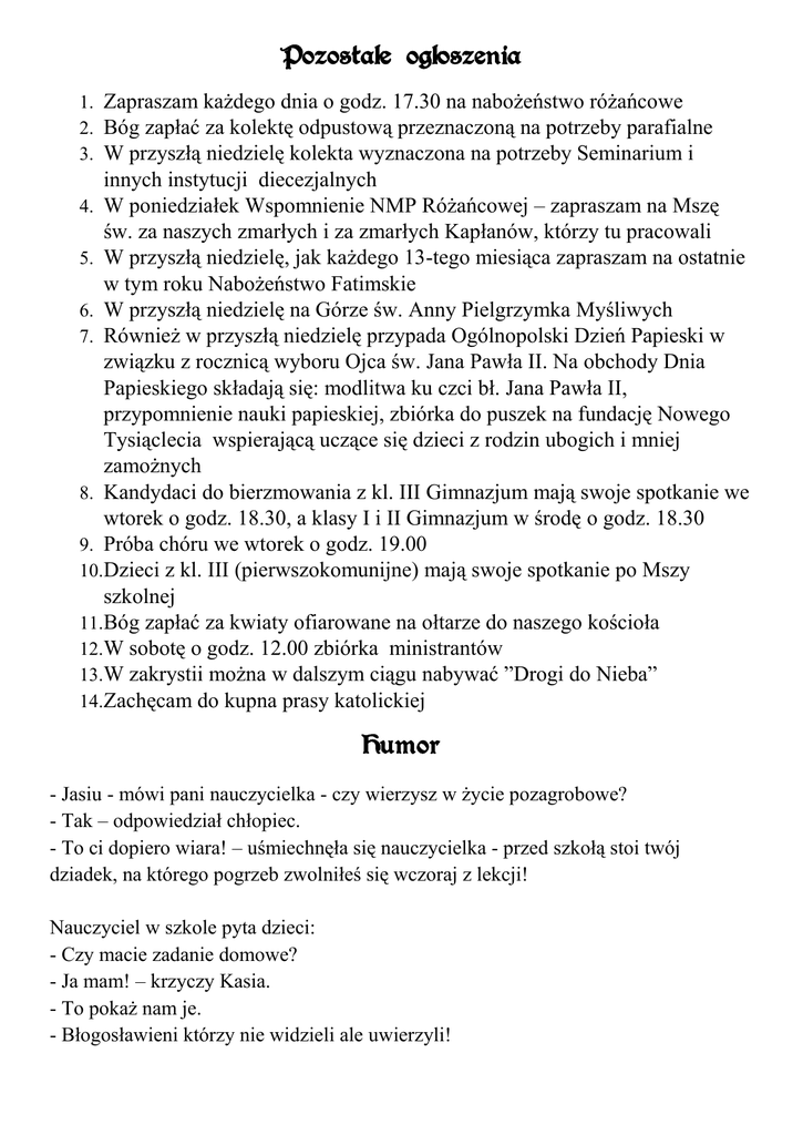 Pozostałe ogłoszenia 1. Zapraszam każdego dnia o godz. 17.30 na nabożeństwo różańcowe 2. Bóg zapłać za kolektę odpustową przeznaczoną na potrzeby parafialne 3. W przyszłą niedzielę kolekta wyznaczona na potrzeby Seminarium i innych instytucji diecezjalnych 4. W poniedziałek Wspomnienie NMP Różańcowej – zapraszam na Mszę św. za naszych zmarłych i za zmarłych Kapłanów, którzy tu pracowali 5. W przyszłą niedzielę, jak każdego 13-tego miesiąca zapraszam na ostatnie w tym roku Nabożeństwo Fatimskie 6. W przyszłą niedzielę na Górze św. Anny Pielgrzymka Myśliwych 7. Również w przyszłą niedzielę przypada Ogólnopolski Dzień Papieski w związku z rocznicą wyboru Ojca św. Jana Pawła II. Na obchody Dnia Papieskiego składają się: modlitwa ku czci bł. Jana Pawła II, przypomnienie nauki papieskiej, zbiórka do puszek na fundację Nowego Tysiąclecia wspierającą uczące się dzieci z rodzin ubogich i mniej zamożnych 8. Kandydaci do bierzmowania z kl. III Gimnazjum mają swoje spotkanie we wtorek o godz. 18.30, a klasy I i II Gimnazjum w środę o godz. 18.30 9. Próba chóru we wtorek o godz. 19.00 10.Dzieci z kl. III (pierwszokomunijne) mają swoje spotkanie po Mszy szkolnej 11.Bóg zapłać za kwiaty ofiarowane na ołtarze do naszego kościoła 12.W sobotę o godz. 12.00 zbiórka ministrantów 13.W zakrystii można w dalszym ciągu nabywać ”Drogi do Nieba” 14.Zachęcam do kupna prasy katolickiej Humor - Jasiu - mówi pani nauczycielka - czy wierzysz w życie pozagrobowe? - Tak – odpowiedział chłopiec. - To ci dopiero wiara! – uśmiechnęła się nauczycielka - przed szkołą stoi twój dziadek, na którego pogrzeb zwolniłeś się wczoraj z lekcji! Nauczyciel w szkole pyta dzieci: - Czy macie zadanie domowe? - Ja mam! – krzyczy Kasia. - To pokaż nam je. - Błogosławieni którzy nie widzieli ale uwierzyli! INFORMATOR PARAFIALNY Rzymsko-katolicka Parafia św. Katarzyny Aleksandryjskiej ul. ks. Jerzego Popiełuszki 13 45-602 Opole-Groszowice Tel. (77) 456 27 96 www.parafiagroszowice.pl 07. – 13. 10. 2013 r. XXVII Niedziela Zwykła – Odpust Parafialny „Gdybyście mieli wiarę jak ziarnko gorczycy, powiedzielibyście tej morwie: Wyrwij się z korzeniem i przesadź się w morze, a byłaby wam posłuszna”. W sakramencie chrztu świętego każdy z nas otrzymał „ogromny skarb”, czy może inaczej – „dobre ziarno” wiary. To „ziarno”, jeśli trafi na właściwy grunt żywej wiary rodziców, najbliższych, zacznie rosnąć i już w dzieciństwie wyda pierwsze owoce. Autentyczne środowisko wiary w domu rodzinnym łagodzi „kryzys wiary” w wieku młodzieńczym. Bywa jednak (i to coraz częściej), że „skarb” otrzymany na chrzcie świętym zostaje zakopany na długie lata, bo tzw. „nowocześni” rodzice dają dziecku wolność licząc, że samo określi swoje miejsce w życiu i samo znajdzie drogę do Boga. W rezultacie jest całe mnóstwo młodych „ubogich” – spragnionych Boga (choć nawet nie potrafią określić swojej tęsknoty), którzy nie wiedzą, że posiadają „ogromny skarb!” To właśnie ci młodzi – „biedni” potrzebują modlitwy apostołów: „Przymnóż nam wiary!” Potrzebują też świadków, którzy pokażą, jak z „martwego ziarenka” wykrzesać życie, jak dotrzeć do „skarbu”. Który przypomina o wielkiej godności człowieka, otwiera na Boga, daje zupełnie nowy sens całej doczesności. „Przymnóż nam wiary” – może być modlitwą nieustanną i na pewno Bogu miłą, bo żeby więcej kochać, trzeba więcej rozumieć, a by lepiej rozumieć Boże drogi, trzeba wciąż większej wiary.