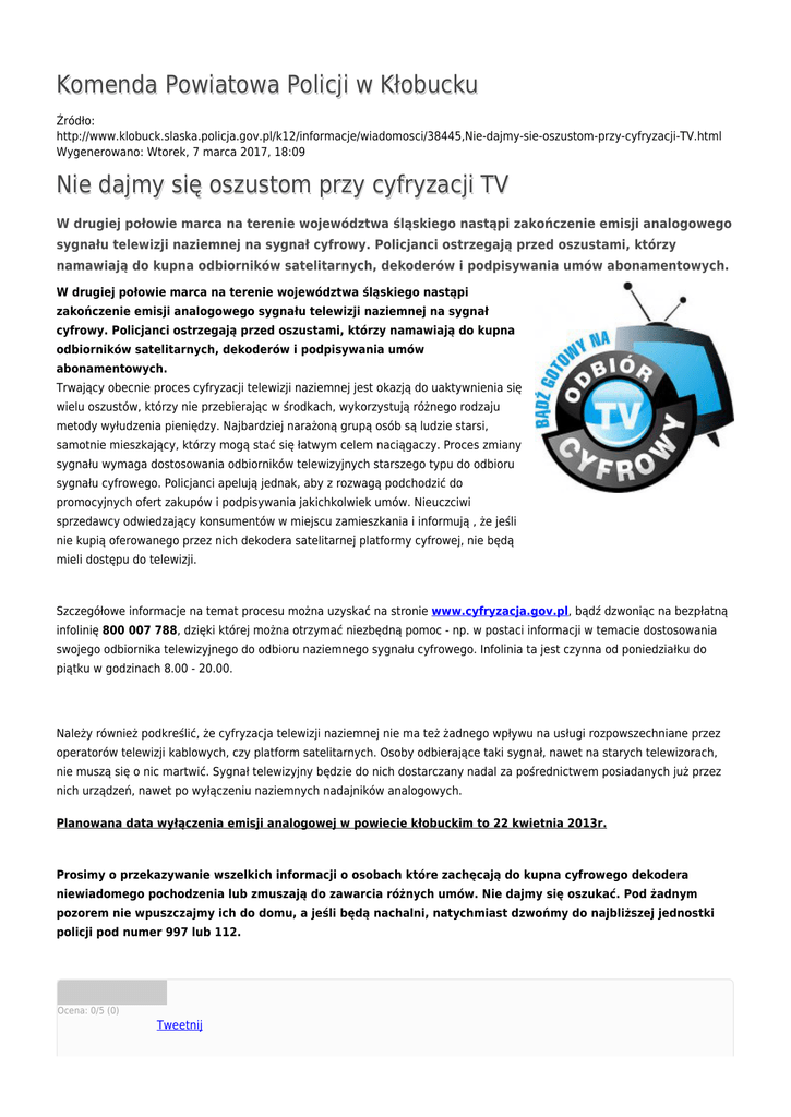 Komenda Powiatowa Policji w Kłobucku Źródło: http://www.klobuck.slaska.policja.gov.pl/k12/informacje/wiadomosci/38445,Nie-dajmy-sie-oszustom-przy-cyfryzacji-TV.html Wygenerowano: Wtorek, 7 marca 2017, 18:09 Nie dajmy się oszustom przy cyfryzacji TV W drugiej połowie marca na terenie województwa śląskiego nastąpi zakończenie emisji analogowego sygnału telewizji naziemnej na sygnał cyfrowy. Policjanci ostrzegają przed oszustami, którzy namawiają do kupna odbiorników satelitarnych, dekoderów i podpisywania umów abonamentowych. W drugiej połowie marca na terenie województwa śląskiego nastąpi zakończenie emisji analogowego sygnału telewizji naziemnej na sygnał cyfrowy. Policjanci ostrzegają przed oszustami, którzy namawiają do kupna odbiorników satelitarnych, dekoderów i podpisywania umów abonamentowych. Trwający obecnie proces cyfryzacji telewizji naziemnej jest okazją do uaktywnienia się wielu oszustów, którzy nie przebierając w środkach, wykorzystują różnego rodzaju metody wyłudzenia pieniędzy. Najbardziej narażoną grupą osób są ludzie starsi, samotnie mieszkający, którzy mogą stać się łatwym celem naciągaczy. Proces zmiany sygnału wymaga dostosowania odbiorników telewizyjnych starszego typu do odbioru sygnału cyfrowego. Policjanci apelują jednak, aby z rozwagą podchodzić do promocyjnych ofert zakupów i podpisywania jakichkolwiek umów. Nieuczciwi sprzedawcy odwiedzający konsumentów w miejscu zamieszkania i informują , że jeśli nie kupią oferowanego przez nich dekodera satelitarnej platformy cyfrowej, nie będą mieli dostępu do telewizji. Szczegółowe informacje na temat procesu można uzyskać na stronie www.cyfryzacja.gov.pl, bądź dzwoniąc na bezpłatną infolinię 800 007 788, dzięki której można otrzymać niezbędną pomoc - np. w postaci informacji w temacie dostosowania swojego odbiornika telewizyjnego do odbioru naziemnego sygnału cyfrowego. Infolinia ta jest czynna od poniedziałku do piątku w godzinach 8.00 - 20.00. Należy również podkreślić, że cyfryzacja telewizji naziemnej nie ma też żadnego wpływu na usługi rozpowszechniane przez operatorów telewizji kablowych, czy platform satelitarnych. Osoby odbierające taki sygnał, nawet na starych telewizorach, nie muszą się o nic martwić. Sygnał telewizyjny będzie do nich dostarczany nadal za pośrednictwem posiadanych już przez nich urządzeń, nawet po wyłączeniu naziemnych nadajników analogowych. Planowana data wyłączenia emisji analogowej w powiecie kłobuckim to 22 kwietnia 2013r. Prosimy o przekazywanie wszelkich informacji o osobach które zachęcają do kupna cyfrowego dekodera niewiadomego pochodzenia lub zmuszają do zawarcia różnych umów. Nie dajmy się oszukać. Pod żadnym pozorem nie wpuszczajmy ich do domu, a jeśli będą nachalni, natychmiast dzwońmy do najbliższej jednostki policji pod numer 997 lub 112. Ocena: 0/5 (0) Tweetnij