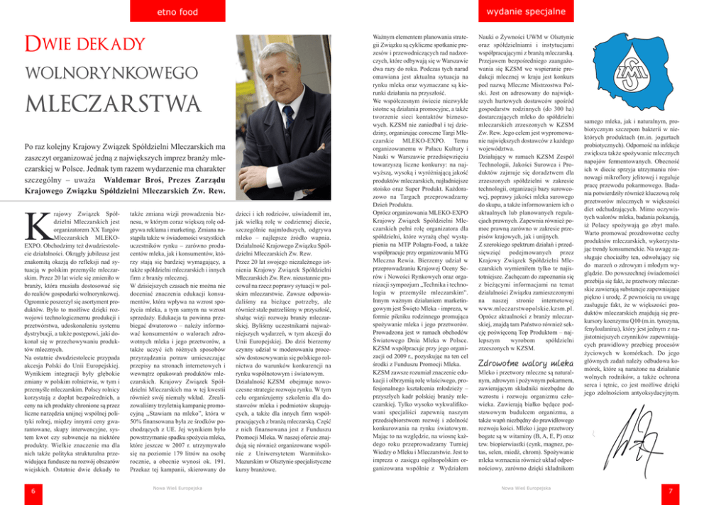 wydanie specjalne etno food Dwie dekady Po raz kolejny Krajowy Związek Spółdzielni Mleczarskich ma zaszczyt organizować jedną z największych imprez branży mleczarskiej w Polsce. Jednak tym razem wydarzenie ma charakter szczególny – uważa Waldemar Broś, Prezes Zarządu Krajowego Związku Spółdzielni Mleczarskich Zw. Rew. K rajowy Związek Spółdzielni Mleczarskich jest organizatorem XX Targów Mleczarskich MLEKOEXPO. Obchodzimy też dwudziestolecie działalności. Okrągły jubileusz jest znakomitą okazją do refleksji nad sytuacją w polskim przemyśle mleczarskim. Przez 20 lat wiele się zmieniło w branży, która musiała dostosować się do realiów gospodarki wolnorynkowej. Ogromnie poszerzył się asortyment produktów. Było to możliwe dzięki rozwojowi technologicznemu produkcji i przetwórstwa, udoskonaleniu systemu dystrybucji, a także postępowi, jaki dokonał się w przechowywaniu produktów mlecznych. Na ostatnie dwudziestolecie przypada akcesja Polski do Unii Europejskiej. Wynikiem integracji były głębokie zmiany w polskim rolnictwie, w tym i przemyśle mleczarskim. Polscy rolnicy korzystają z dopłat bezpośrednich, a ceny na ich produkty chronione są przez liczne narzędzia unijnej wspólnej polityki rolnej, między innymi ceny gwarantowane, skupy interwencyjne, system kwot czy subwencje na niektóre produkty. Wielkie znaczenie ma dla nich także polityka strukturalna przewidująca fundusze na rozwój obszarów wiejskich. Ostatnie dwie dekady to 6 także zmiana wizji prowadzenia biznesu, w którym coraz większą rolę odgrywa reklama i marketing. Zmiana nastąpiła także w świadomości wszystkich uczestników rynku – zarówno producentów mleka, jak i konsumentów, którzy stają się bardziej wymagający, a także spółdzielni mleczarskich i innych firm z branży mlecznej. W dzisiejszych czasach nie można nie doceniać znaczenia edukacji konsumentów, która wpływa na wzrost spożycia mleka, a tym samym na wzrost sprzedaży. Edukacja ta powinna przebiegać dwutorowo – należy informować konsumentów o walorach zdrowotnych mleka i jego przetworów, a także uczyć ich różnych sposobów przyrządzania potraw umieszczając przepisy na stronach internetowych i wewnątrz opakowań produktów mleczarskich. Krajowy Związek Spółdzielni Mleczarskich ma w tej kwestii również swój niemały wkład. Zrealizowaliśmy trzyletnią kampanię promocyjną ,,Stawiam na mleko”, która w 50% finansowana była ze środków pochodzących z UE. Jej wynikiem było powstrzymanie spadku spożycia mleka, które jeszcze w 2007 r. utrzymywało się na poziomie 179 litrów na osobę rocznie, a obecnie wynosi ok. 191. Przekaz tej kampanii, skierowany do Nowa Wieś Europejska dzieci i ich rodziców, uświadomił im, jak wielką rolę w codziennej diecie, szczególnie najmłodszych, odgrywa mleko – najlepsze źródło wapnia. Działalność Krajowego Związku Spółdzielni Mleczarskich Zw. Rew. Przez 20 lat swojego niezależnego istnienia Krajowy Związek Spółdzielni Mleczarskich Zw. Rew. nieustannie pracował na rzecz poprawy sytuacji w polskim mleczarstwie. Zawsze odpowiadaliśmy na bieżące potrzeby, ale również stale patrzeliśmy w przyszłość, służąc wizji rozwoju branży mleczarskiej. Byliśmy uczestnikami najważniejszych wydarzeń, w tym akcesji do Unii Europejskiej. Do dziś bierzemy czynny udział w moderowaniu procesów dostosowywania się polskiego rolnictwa do warunków konkurencji na rynku wspólnotowym i światowym. Działalność KZSM obejmuje nowoczesne strategie rozwoju rynku. W tym celu organizujemy szkolenia dla dostawców mleka i podmiotów skupujących, a także dla innych firm współpracujących z branżą mleczarską. Część z nich finansowana jest z Funduszu Promocji Mleka. W naszej ofercie znajdują się również organizowane wspólnie z Uniwersytetem WarmińskoMazurskim w Olsztynie specjalistyczne kursy branżowe. Ważnym elementem planowania strategii Związku są cykliczne spotkanie prezesów i przewodniczących rad nadzorczych, które odbywają się w Warszawie dwa razy do roku. Podczas tych narad omawiana jest aktualna sytuacja na rynku mleka oraz wyznaczane są kierunki działania na przyszłość. We współczesnym świecie niezwykle istotne są działania promocyjne, a także tworzenie sieci kontaktów biznesowych. KZSM nie zaniedbał i tej dziedziny, organizując coroczne Targi Mleczarskie MLEKO-EXPO. Temu organizowanemu w Pałacu Kultury i Nauki w Warszawie przedsięwzięciu towarzyszą liczne konkursy: na najwyższą, wysoką i wyróżniającą jakość produktów mleczarskich, najładniejsze stoisko oraz Super Produkt. Każdorazowo na Targach przeprowadzamy Dzień Produktu. Oprócz organizowania MLEKO-EXPO Krajowy Związek Spółdzielni Mleczarskich pełni rolę organizatora dla spółdzielni, które wyrażą chęć wystąpienia na MTP Polagra-Food, a także współpracuje przy organizowaniu MTG Mleczna Rewia. Bierzemy udział w przeprowadzaniu Krajowej Oceny Serów i Nowości Rynkowych oraz organizacji sympozjum „Technika i technologia w przemyśle mleczarskim”. Innym ważnym działaniem marketingowym jest Święto Mleka - impreza, w formie pikniku rodzinnego promująca spożywanie mleka i jego przetworów. Prowadzona jest w ramach obchodów Światowego Dnia Mleka w Polsce. KZSM współpracuje przy jego organizacji od 2009 r., pozyskując na ten cel środki z Funduszu Promocji Mleka. KZSM zawsze rozumiał znaczenie edukacji i olbrzymią rolę właściwego, profesjonalnego kształcenia młodzieży – przyszłych kadr polskiej branży mleczarskiej. Tylko wysoko wykwalifikowani specjaliści zapewnią naszym przedsiębiorstwom rozwój i zdolność konkurowania na rynku światowym. Mając to na względzie, na wiosnę każdego roku przeprowadzamy Turniej Wiedzy o Mleku i Mleczarstwie. Jest to impreza o zasięgu ogólnopolskim organizowana wspólnie z Wydziałem Nauki o Żywności UWM w Olsztynie oraz spółdz