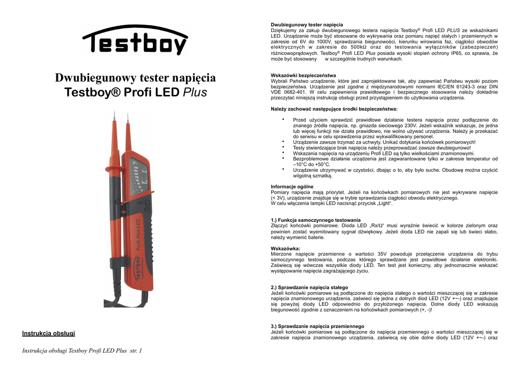 Dwubiegunowy tester napięcia Dziękujemy za zakup dwubiegunowego testera napięcia Testboy® Profi LED PLUS ze wskaźnikami LED. Urządzenie może być stosowane do wykrywania oraz pomiaru napięć stałych i przemiennych w zakresie od 6V do 1000V, sprawdzania biegunowości, kierunku wirowania faz, ciągłości obwodów elektrycznych w zakresie do 500kΩ oraz do testowania wyłączników (zabezpieczeń) różnicowoprądowych. Testboy® Profi LED Plus posiada wysoki stopień ochrony IP65, co sprawia, że może być stosowany w szczególnie trudnych warunkach. Dwubiegunowy tester napięcia Testboy® Profi LED Plus Wskazówki bezpieczeństwa Wybrali Państwo urządzenie, które jest zaprojektowane tak, aby zapewniać Państwu wysoki poziom bezpieczeństwa. Urządzenie jest zgodne z międzynarodowymi normami IEC/EN 61243-3 oraz DIN VDE 0682-401. W celu zapewnienia prawidłowego i bezpiecznego stosowania należy dokładnie przeczytać niniejszą instrukcję obsługi przed przystąpieniem do użytkowania urządzenia. Należy zachować następujące środki bezpieczeństwa: • • • • • • Przed użyciem sprawdzić prawidłowe działanie testera napięcia przez podłączenie do znanego źródła napięcia, np. gniazda sieciowego 230V. Jeżeli wskaźnik wskazuje, że jedna lub więcej funkcji nie działa prawidłowo, nie wolno używać urządzenia. Należy je przekazać do serwisu w celu sprawdzenia przez wykwalifikowany personel. Urządzenie zawsze trzymać za uchwyty. Unikać dotykania końcówek pomiarowych! Testy stwierdzające brak napięcia należy przeprowadzać zawsze dwubiegunowo! Wskazania napięcia na urządzeniu Profi LED są tylko wielkościami znamionowymi. Bezproblemowe działanie urządzenia jest zagwarantowane tylko w zakresie temperatur od –10°C do +50°C. Urządzenie utrzymywać w czystości, dbając o to, aby było suche. Obudowę można czyścić wilgotną szmatką. Informacje ogólne Pomiary napięcia mają priorytet. Jeżeli na końcówkach pomiarowych nie jest wykrywane napięcie (< 3V), urządzenie znajduje się w trybie sprawdzania ciągłości obwodu elektrycznego. W celu włączenia lampki LED nacisnąć przycisk „Light“. 1.) Funkcja samoczynnego testowania Złączyć końcówki pomiarowe. Dioda LED „Rx/Ω“ musi wyraźnie świecić w kolorze zielonym oraz powinien zostać wyemitowany sygnał dźwiękowy. Jeżeli dioda LED nie zapali się lub świeci słabo, należy wymienić baterie. Wskazówka: Mierzone napięcie przemienne o wartości 35V powoduje przełączenie urządzenia do trybu samoczynnego testowania, podczas którego sprawdzane jest prawidłowe działanie elektroniki. Zaświecą się wówczas wszystkie diody LED. Ten test jest konieczny, aby jednoznacznie wskazać występowanie napięcia zagrażającego życiu. 2.) Sprawdzanie napięcia stałego Jeżeli końcówki pomiarowe są podłączone do napięcia stałego o wartości mieszczącej się w zakresie napięcia znamionowego urządzenia, zaświeci się jedna z dolnych diod LED (12V +~-) oraz znajdujące się powyżej diody LED odpowiednio do przyłożonego napięcia. Dolne diody LED wskazują biegunowość zgodnie z oznaczeniem na końcówkach pomiarowych (+, -)! Instrukcja obsługi Instrukcja obsługi Testboy Profi LED Plus str. 1 3.) Sprawdzanie napięcia przemiennego Jeżeli końcówki pomiarowe są podłączone do napięcia przemiennego o wartości mieszczącej się w zakresie napięcia znamionowego urządzenia, zaświecą się obie dolne diody LED (12V +~-) oraz znajdujące się powyżej diody LED odpowiednio do przyłożonego napięcia. Równoczesne zaświecenie się dolnych diod LED wskazuje na obecność napięcia przemiennego (~). Przy przekroczeniu wartości progowej 35V emitowany jest sygnał dźwiękowy. Dane techniczne Wskaźniki: Sygnał dźwiękowy sygnalizuje obecność napięcia zagrażającego życiu! 4.) Sprawdzanie faz Jedną końcówkę pomiarową przyłożyć do testowanego przewodu, jednocześnie dotykając palcem elektrodę dotykową. Jeżeli do testowanego przewodu podłączone jest napięcie fazowe o wartości min. 100V~, zaświeci się dioda LED „<L“! 5.) Sprawdzanie kierunku wirowania faz Należy wykryć przewody fazowe w sposób opisany w punkcie 4. Następnie przyłożyć końcówki pomiarowe do dwóch przewodów fazowych, dotykając jednocześnie elektrodę dotykową. Jeżeli faza przyłożona do końcówki pomiarowej L2 jest opóźniona względem fazy przyłożonej do końcówki pomiarowej L1, kierunek wirowania faz jest prawoskrętny. Wówczas zaświeci się dioda LED „R>“. W przeciwnym razie kierunek wirowania faz jest lewoskrętny i zaświeci się dioda LED „<L“. Wskaźniki napięcia powinny wskazywać napięcie 400V. Jeżeli wskazywane będzie tylko napięcie o wartości 230V, oznacza to, że do końcówek pomiarowych przyłożony jest tylko jeden przewód fazowy! 6.) Sprawdzanie ciągłości obwodu i test diodowy Przyłożyć końcówki pomiarowe do testowanego przewodu, bezpiecznika itp. Przy rezystancji o wartości 0 - 500 kΩ lub w przypadku półprzewodników w kierunku przewodzenia (anoda przyłożona do końcówki pomiarowej +!) zaświeci się dioda LED „Rx/Ω“ i wyemitowany zostanie sygnał akustyczny. 7.) Test wyłączników różnicowoprądowych (Test przewodu ochronnego PE) Urządzenie Profi LED PLUS posiada obciążenie, które umożliwia wyzwolenie wyłącznika różnicowoprądowego za pomocą dwóch przycisków. Testowany jest wyłącznik różnicowoprądowy między przewodem fazowym a przewodem ochronnym. Zakres napięcia znamionowego: Zakres częstotliwości: Prąd probierczy wyłączników różnicowoprądowych: Czas włączenia: Badanie ciągłości obwodu: Stopień ochrony: Kategoria przepięciowa: Dopuszczenie TÜV/GS: Zasilanie: 12 diod LED dla napięć (12, 24, 48, 120, 230, 400 i 690 V), biegunowości (+~-), ciągłości obwodu (Rx/Ω) oraz fazy/ kierunku wirowania fazy (R/L) 6...1000V AC/DC 0...400Hz ~30mA 10s 0...