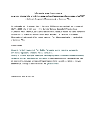 Informacja o wynikach naboru na wolne stanowisko urzędnicze przy realizacji programu pilotaŜowego „KAWKA” w Zakładzie Gospodarki Mieszkaniowej w Gorzowie Wlkp. Na podstawie art. 15 ustawy z dnia 21 listopada 2008 roku o pracownikach samorządowych (Dz.U. z 2008 roku Nr 223 poz. 1458 ) Dyrektor Zakładu Gospodarki Mieszkaniowej w Gorzowie Wlkp. informuje, Ŝe w wyniku zakończenia procedury naboru na wolne stanowisko urzędnicze przy realizacji programu pilotaŜowego „KAWKA” w Zakładzie Gospodarki Mieszkaniowej w Gorzowie Wlkp. została wybrana Pani Słabisz Agnieszka - zamieszkała w Gorzowie Wlkp. Uzasadnienie: W ocenie Komisji rekrutacyjnej Pani Słabisz Agnieszka spełnia wszystkie wymagania określone w ogłoszeniu o naborze na w/w stanowisko. Dotyczy to zarówno wymagań formalnych jak i merytorycznych. Posiada umiejętności i wiedzę niezbędną do pracy na wskazanym stanowisku. Ponadto predyspozycje osobowościowe takie jak opanowanie, rozwaga, umiejętność logicznego myślenia i sposób podejścia do nowych zadań rokują nadzieję na sprawdzenie się na tym stanowisku. Gorzów Wlkp., dnia 04.08.2015r.