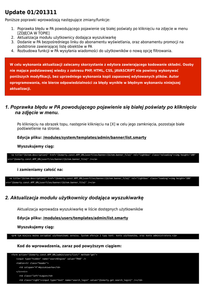 W celu wykonania aktualizacji zalecamy skorzystanie z edytora zawierającego kodowanie składni. Osoby