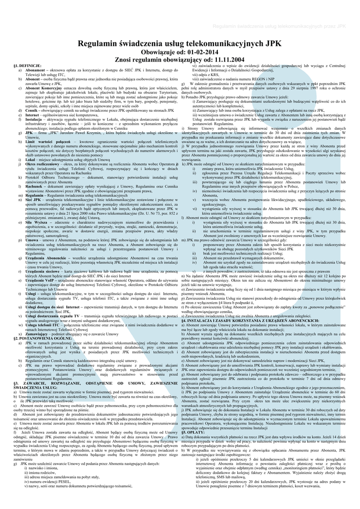 Regulamin świadczenia usług telekomunikacyjnych przez JPK Regulamin świadczenia usług telekomunikacyjnych JPK Obowiązuje od: 01-02-2014 Znosi regulamin obowiązujący od: 11.11.2004 §1. DEFINICJE: a) Abonament – okresowa opłata za korzystanie z dostępu do SIEĆ JPK i Internetu, dostęp do Telewizji lub usługę ITC, b) Abonent – osoba fizyczna bądź prawna oraz jednostka nie posiadająca osobowości prawnej, która zawarła Umowę z JPK, c) Abonent Komercyjny oznacza dowolną osobę fizyczną lub prawną, która jest właścicielem, zajmuje lub eksploatuje jakiekolwiek lokale, placówki lub budynki na obszarze Terytorium, zawierające pokoje lub inne pomieszczenia, które są lub mogą zostać udostępnione jako pokoje hotelowe, gościnne itp. lub też jako biura lub siedziby firm, w tym bary, gospody, pensjonaty, szpitale, domy opieki, szkoły i inne miejsca zajmowane przez wiele osób d) Cennik – obowiązujący cennik na usługi świadczone przez JPK opublikowany na stronach JPK e) Internet – ogólnoświatowa sieć komputerowa, f) Instalacja – aktywacja sygnału telefonicznego w Lokalu, obejmująca dostarczenie niezbędnej infrastruktury i zasobów, łącznie – jeśli to konieczne – z uprzednim wykonaniem przyłącza abonenckiego; instalacja podlega opłatom określonym w Cenniku g) JPK – firma „JPK” Jarosław Paweł Krzymin, , która będzie świadczyła usługi określone w Umowie, h) Limit wartości połączeń – kwotowe ograniczenie wartości połączeń telefonicznych wykonywanych z danego numeru abonenckiego, stosowane opcjonalnie jako mechanizm kontroli kosztów połączeń; nie dotyczy bezpłatnych połączeń wychodzących do numerów alarmowych i służb ustawowo powołanych do niesienia pomocy i) Lokal – miejsce udostępnienia usług objętych Umową j) Okres rozliczeniowy – okres, za który dokonywane są rozliczenia Abonenta wobec Operatora j) z tytułu świadczenia usługi Telefonii Cyfrowej, rozpoczynający się i kończący w dniach wskazanych przez Operatora na Rachunku k) Protokół Odbioru Technicznego – dokument, stanowiący potwierdzenie instalacji usług zamówionych przez Abonenta l) Rachunek – dokument zawierający opłaty wynikającej z Umowy, Regulaminu oraz Cennika wystawione Abonentowi przez JPK zgodnie z obowiązującymi przepisami prawa, m) Regulamin – Regulamin świadczenia usług telekomunikacyjnych n) Sieć JPK – urządzenia telekomunikacyjne i linie telekomunikacyjne zestawione i połączone w sposób umożliwiający przekazywanie sygnałów pomiędzy określonymi zakończeniami sieci, za pomocą przewodów, fal radiowych bądź optycznych lub innych, eksploatowane przez JPK w rozumieniu ustawy z dnia 21 lipca 2000 roku Prawo telekomunikacyjne (Dz. U. Nr 73, poz. 852 z późniejszymi. zmianami.), zwanej dalej Ustawą, o) Siła Wyższa – zdarzenie o charakterze nadzwyczajnym niemożliwe do przewidzenia i zapobieżenia, a w szczególności: działanie sił przyrody, wojna, strajki, zamieszki, demonstracje, niepokoje społeczne, awarie w dostawie energii, zmiana przepisów prawa, akty władzy państwowej, samorządowej. p) Umowa – umowa z Abonentem, na podstawie której JPK zobowiązuje się do udostępniania lub świadczenia usług telekomunikacyjnych na rzecz Abonenta, a Abonent zobowiązuje się do terminowego regulowania należności za usługi i przestrzegania postanowień Umowy i Regulaminu, q) Urządzenia Abonenckie – wszelkie urządzenia udostępnione Abonentowi na czas trwania Umowy w celu jej realizacji, które pozostają własnością JPK niezależnie od miejsca ich instalacji i czasu trwania Umowy, r) Urządzenia sieciowe – karta sieciowe kablowa lub radiowa bądź inne urządzenia, za pomocą których Abonent będzie miał dostęp do SIEĆ JPK i do sieci Internet s) Urządzenie VoIP – urządzenie abonenckie stanowiące własność Operatora, oddane do używania i zapewniające dostęp do usług Internetowej Telefonii Cyfrowej, określone w Protokole Odbioru Technicznego lub Umowie t) Usługi – usługa telekomunikacyjne, w tym w szczególności usługa dostępu do sieci Internetu, usługa dostarczania sygnału TV, usługa telefonii ITC, a także związane z nimi inne usługi dodatkowe, u) Usługi dostępu do sieci Internet – zapewnienie transmisji danych, w tym dostępu do Internetu za pośrednictwem Sieć JPK, v) Usługi dostarczania sygnalu TV – transmisja sygnału telewizyjnego lub radiowego w postaci sygnału analogowego wraz z innymi usługami dodatkowymi, w) Usługa telefonii ITC – połączenia telefoniczne oraz związane z nimi świadczenia dodatkowe w ramach Internetowej Telefonii Cyfrowej x) Zamawiający – podmiot ubiegający się o zawarcie Umowy §2. POSTANOWIENIA OGÓLNE: a) JPK w ramach prowadzonej przez siebie działalności telekomunikacyjnej oferuje Abonentom możliwość korzystania z Usług na terenie prowadzonej działalności, przy czym zakres oferowanych usług jest wynika z posiadanych przez JPK możliwości technicznych i organizacyjnych. b) Regulamin oraz Cennik stanowią każdorazowo integralną część umowy. c) JPK ma prawo wprowadzać dodatkowe regulaminy związane z prowadzonymi akcjami promocyjnymi. Postanowienia Umowy oraz dodatkowych regulaminów związanych z wprowadzonymi akcjami promocyjnymi mają pierwszeństwo w stosowaniu przed postanowieniami Regulaminu. §3. ZAWARCIE, ROZWIĄZANIE, ODSTĄPIENIE OD UMOWY, ZAWIESZENIE ŚWIADCZENIA USŁUG: a) Umowa może zostać zawarta wyłącznie w formie pisemnej, pod rygorem nieważności. b) Umowa zawierana jest na czas nieokreślony. Umowa może być zawarta na również na czas określony, o ile JPK przewidzi taką możliwość. c) Abonent może zawrzeć Umowę osobiście bądź przez pełnomocnika, przy czym pełnomocnictwo dla osoby trzeciej winno być sporządzone na piśmie. d) Abonent jest zobowiązany do przedstawienia dokumentów jednoznacznie potwierdzających jego tożsamość oraz umocowanie do