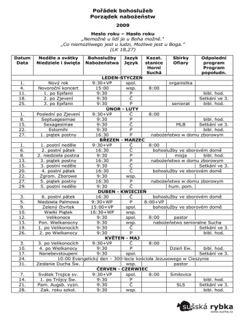 Pořádek bohoslužeb Porządek naboŜeństw 2009 Heslo roku – Hasło roku „Nemožné u lidí je u Boha možné.“ „Co niemoŜliwego jest u ludzi, MoŜliwe jest u Boga.” (LK 18,27) Datum Data 1. 4. 11. 18. 25. 1. 8. 15. 22. 27. 1. 6. 8. 13. 15. 20. 22. 27. 29. 3. 5. 9. 10. 12. 13. 19. 26. 3. 10. 17. 24. 31. 7. 14. 21. 28. Neděle a svátky Niedziele i święta Bohoslužby NaboŜeństwa Jazyk Język Kazat. stanice Horní Suchá Sbírky Ofiary Odpolední program Program popołudn. LEDEN-STYCZEŃ 9:30+VP spol. organistka 15:00 wsp. 8:00 9:30 P bibl. hod. 9:30 Č Setkání ve 3. 9:30 P seniorat bibl. hod. ÚNOR - LUTY Poslední po Zjevení 9:30+VP Č 8:00 Septuagesimae 9:30 P bibl. hod. Sexagesimae 9:30 Č MLB Setkání ve 3. Estomihi 9:30 P bibl. hod. 1. piątek postny 16:30 P naboŜeństwo w domu zborowym BŘEZEN - MARZEC 1. postní neděle 9:30+VP Č 8:00 2. postní pátek 16:30 Č bohoslužby ve sborovém domě 2. niedziela postna 9:30 P misja bibl. hod. 3. piątek postny 16:30 P naboŜeństwo w domu zborowym 3. postní neděle 9:30 Č Setkání ve 3. 4. postní pátek 16:30 Č bohoslužby ve sborovém domě Zgrom. Zborowe 9:30 wsp. 5. piątek postny 16:30 P naboŜeństwo w domu zborowym 5. postní neděle 9:30 Č hum. pom. DUBEN - KWIECIEŃ 6. postní pátek 16:30 Č bohoslužby ve sborovém domě Niedziela Palmowa 9:30+WP P 8:00+VP Zelený čtvrtek 15:00+VP spol. bohoslužby ve sborovém domě Wielki Piątek 16:30+WP wsp. Velikonoce 9:30 spol. 8:00 pastor Pon. Wielkanocny 9:30 wsp. naboŜeństwo senioralne Sucha 1. po Velikonocích 9:30 Č Setkání ve 3. 2. po Wielkanocy 9:30 P bibl. hod. KVĚTEN - MAJ 3. po Velikonocích 9:30+VP Č 8:00 4. po Wielkanocy 9:30 P Dzień Ew. bibl. hod. Nanebevstoupení 9:30 spol. Setkání ve 3. 10:00 Evangelický den – 300-lecie kościoła Jezusowego w Cieszynie Zesłanie Ducha Św. wsp. pastor ČERVEN - CZERWIEC Svátek Trojice sv. 9:30+VP spol. 8:00 Smilovice 1. po Trójcy Św. 9:30 P bibl. hod. Pam. Augsb. vyzn. 9:30 Č SLS Setkání ve 3. Zak. roku szkol. 9:30 wsp. bibl. hod. Nový rok Novoroční koncert 1. po Epifanii 2. po Zjevení 3. po Epifanii Datum Data Neděle a svátky Niedziele i święta 5. 12. 19. 26. Cyril, Metoděj, Hus 5. po Trójcy Św. 6. po Trojici sv. 7. po Trójcy Św. 2. 9. 16. 23. 30. Pamiątka załoŜenia 9. po Trojici sv. 10. po Trójcy Św. 11. po Trojici sv. Rozp. roku szkol. 6. 13. 20. 27. 13. po Trójcy Św. 14. po Trojici sv. 15. po Trójcy Św. 16. po Trojici sv. 4. 11. 18. 25. Święto śniw 18. po Trójcy Św. 19. po Trojici sv. Památka reformace 1. 8. 15. 22. 29. Święto zmarłych 3. p. k. círk. roku Den pokání Niedz. Wieczności 1. adventní 6. 13. 20. 24. 25. 26. 27. 31. 2. adwentowa 3. adventní 4. adwentowa Štědrý večer BoŜe Narodzenie Sv. Štěpána 1. po BoŜym Nar. Starý rok Bohoslužby NaboŜeństwa Jazyk Język Kazat. Sbírky Odpolední stanice Ofiary program Horní Program Suchá popołudn. ČERVENEC - LIPIEC 9:30+VP spol. 8:00 GAW 9:30 P bibl. hod. 9:30 Č Misijní den 9:30 P seniorat bibl. hod. SRPEN - SIERPIEŃ 9:30+WP wsp. 9:30 Č 8:00 bibl. hod. 9:30 P misja 9:30 Č bibl. hod. 15:00 Rozloučení s prázdninama ZÁŘÍ - WRZESIEŃ 9:30+WP P 8:00 diakonia 9:30 Č bibl. hod. 9:30 P Setkání ve 3. 9:30 Č bibl. hod. ŘÍJEN - PAŹDZIERNIK 9:30+WP wsp. 8:00 pastor VP pro starší 9:30 P bibl. hod. 9:30 Č Setkání ve 3. 9:30 spol. publikace bibl. hod. LISTOPAD 9:30 wsp. 8:00 9:30 Č bibl. hod. 9:30+VP spol. sl. v nem. Setkání ve 3. 9:30 P bibl. hod. 9:30 Č PROSINEC - GRUDZIEŃ 9:30+WP P 8:00+VP dzieci 9:30 Č VP pro starší 9:30 P Setkání ve 3. 22:00 spol. 9:30 wsp. 8:00 pastor 9:00 spol. seniorátní bohoslužby Albrechtice 15:00 Wigilijka Zborowa 16:30 spol. vzdělávání Szkółka niedzielna dla dzieci – podczas naboŜeństw w kościele Modlitební skupinka – pondělí 16:00h Próby chóru kościelnego – poniedziałek godz. 17:00 Dětský klub Paprsek – úterý 15:00h Spotkania Koła Niewiast – 3. środa miesiąca godz. 16:30 DRY club pro mladé – čtvrtek 16:00h NaboŜeństwa w szpitalu – sobota godz. 10:00 (III p., Chir. B) Setkání ve tři (mladší střední generace) – 3. neděle v měsíci 15:00h Godziny biblijne – 2. i 4. niedziela miesiąca godz. 15:00 Úřední hodiny farní a seniorátní kanceláře: pondělí, středa, pátek 15:00 – 18:00 Úřední hodiny hřbitovní správy: 1. pondělí v měsíci 16:00 – 18:00 Farní sbor Slezské církve evangelické a. v. v Havířově-Suché ul. Budovatelů 772/3, Havířov-Prostřední Suchá, 735 64 e-mail: [email protected] (+420) 731 102 364 http://www.sucha.cz