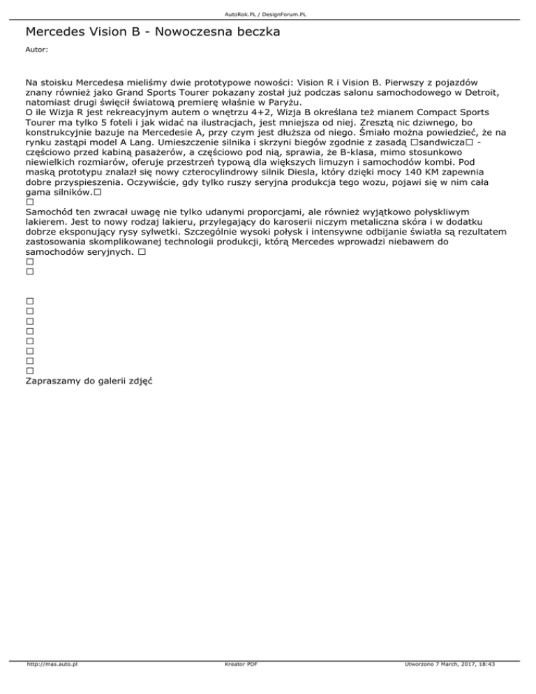 AutoRok.PL / DesignForum.PL Mercedes Vision B - Nowoczesna beczka Autor: Na stoisku Mercedesa mieliśmy dwie prototypowe nowości: Vision R i Vision B. Pierwszy z pojazdów znany również jako Grand Sports Tourer pokazany został już podczas salonu samochodowego w Detroit, natomiast drugi święcił światową premierę właśnie w Paryżu. O ile Wizja R jest rekreacyjnym autem o wnętrzu 4+2, Wizja B określana też mianem Compact Sports Tourer ma tylko 5 foteli i jak widać na ilustracjach, jest mniejsza od niej. Zresztą nic dziwnego, bo konstrukcyjnie bazuje na Mercedesie A, przy czym jest dłuższa od niego. Śmiało można powiedzieć, że na rynku zastąpi model A Lang. Umieszczenie silnika i skrzyni biegów zgodnie z zasadą sandwicza częściowo przed kabiną pasażerów, a częściowo pod nią, sprawia, że B-klasa, mimo stosunkowo niewielkich rozmiarów, oferuje przestrzeń typową dla większych limuzyn i samochodów kombi. Pod maską prototypu znalazł się nowy czterocylindrowy silnik Diesla, który dzięki mocy 140 KM zapewnia dobre przyspieszenia. Oczywiście, gdy tylko ruszy seryjna produkcja tego wozu, pojawi się w nim cała gama silników. Samochód ten zwracał uwagę nie tylko udanymi proporcjami, ale również wyjątkowo połyskliwym lakierem. Jest to nowy rodzaj lakieru, przylegający do karoserii niczym metaliczna skóra i w dodatku dobrze eksponujący rysy sylwetki. Szczególnie wysoki połysk i intensywne odbijanie światła są rezultatem zastosowania skomplikowanej technologii produkcji, którą Mercedes wprowadzi niebawem do samochodów seryjnych. Zapraszamy do galerii zdjęć http://mas.auto.pl Kreator PDF Utworzono 7 March, 2017, 18:43