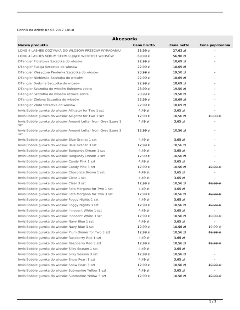 Cennik na dzień: 07-03-2017 18:18 Akcesoria Nazwa produktu Cena brutto Cena netto Cena poprzednia LONG 4 LASHES ODŻYWKA DO WŁOSÓW PRZECIW WYPADANIU 33,99 zł 27,63 zł - LONG 4 LASHES SERUM STYMULUJĄCE WZRTOST WŁOSÓW 69,99 zł 56,90 zł - DTangler Fioletowa Szczotka do włosów 22,99 zł 18,69 zł - DTangler Fuksja Szczotka do włosów 22,99 zł 18,69 zł - DTangler Klasyczna Panterka Szczotka do włosów 23,99 zł 19,50 zł - DTangler Niebieska Szczotka do włosów 22,99 zł 18,69 zł - DTangler Srebrna Szczotka do włosów 22,99 zł 18,69 zł - DTangler Szczotka do włosów fioletowa zebra 23,99 zł 19,50 zł - DTangler Szczotka do włosów różowa zebra 23,99 zł 19,50 zł - DTangler Zielona Szczotka do włosów 22,99 zł 18,69 zł - DTangler Złota Szczotka do włosów 22,99 zł 18,69 zł - InvisiBobble gumka do wlosów Alligator for Two 1 szt 4,49 zł 3,65 zł - InvisiBobble gumka do wlosów Alligator for Two 3 szt 12,99 zł 10,56 zł 19,99 zł InvisiBobble gumka do wlosów Around Letter from Grey Szare 1 szt 4,49 zł 3,65 zł - InvisiBobble gumka do wlosów Around Letter from Grey Szare 3 szt 12,99 zł 10,56 zł - InvisiBobble gumka do wlosów Blue Granat 1 szt 4,49 zł 3,65 zł - InvisiBobble gumka do wlosów Blue Granat 3 szt 12,99 zł 10,56 zł - InvisiBobble gumka do wlosów Burgundy Dream 1 szt 4,49 zł 3,65 zł - InvisiBobble gumka do wlosów Burgundy Dream 3 szt 12,99 zł 10,56 zł - InvisiBobble gumka do wlosów Candy Pink 1 szt 4,49 zł 3,65 zł - InvisiBobble gumka do wlosów Candy Pink 3 szt 12,99 zł 10,56 zł 19,99 zł InvisiBobble gumka do wlosów Chocolate Brown 1 szt 4,49 zł 3,65 zł - InvisiBobble gumka do wlosów Clear 1 szt 4,49 zł 3,65 zł - InvisiBobble gumka do wlosów Clear 3 szt 12,99 zł 10,56 zł 19,99 zł InvisiBobble gumka do wlosów Fata Morgana for Two 1 szt 4,49 zł 3,65 zł - InvisiBobble gumka do wlosów Fata Morgana for Two 3 szt 12,99 zł 10,56 zł 19,99 zł InvisiBobble gumka do wlosów Foggy Nights 1 szt 4,49 zł 3,65 zł - InvisiBobble gumka do wlosów Foggy Nights 3 szt 12,99 zł 10,56 zł 19,99 zł InvisiBobble gumka do wlosów Innocent White 1 szt 4,49 zł 3,65 zł - InvisiBobble gumka do wlosów Innocent White 3 szt 12,99 zł 10,56 zł 19,99 zł InvisiBobble gumka do wlosów Navy Blue 1 szt 4,49 zł 3,65 zł - InvisiBobble gumka do wlosów Navy Blue 3 szt 12,99 zł 10,56 zł 19,99 zł InvisiBobble gumka do wlosów Plum Dinner for Two 3 szt 12,99 zł 10,56 zł 19,99 zł InvisiBobble gumka do wlosów Raspberry Red 1 szt 4,49 zł 3,65 zł - InvisiBobble gumka do wlosów Raspberry Red 3 szt 12,99 zł 10,56 zł 19,99 zł InvisiBobble gumka do wlosów Silky Season 1 szt 4,49 zł 3,65 zł - InvisiBobble gumka do wlosów Silky Season 3 szt 12,99 zł 10,56 zł - InvisiBobble gumka do wlosów Snow Pearl 1 szt 4,49 zł 3,65 zł - InvisiBobble gumka do wlosów Snow Pearl 3 szt 12,99 zł 10,56 zł 19,99 zł InvisiBobble gumka do wlosów Submarine Yellow 1 szt 4,49 zł 3,65 zł - InvisiBobble gumka do wlosów Submarine Yellow 3 szt 12,99 zł 10,56 zł 19,99 zł 1/2 InvisiBobble gumka do wlosów True Black 1 szt 4,49 zł 3,65 zł - InvisiBobble gumka do wlosów True Black 3 szt 12,99 zł 10,56 zł 19,99 zł InvisiBobble gumka do wlosów Winter Punch 1 szt 4,49 zł 3,65 zł - InvisiBobble gumka do wlosów Winter Punch 3 szt 12,99 zł 10,56 zł 19,99 zł Tangle Teezer Blow Styling Full Paddle Szczotka 54,99 zł 44,71 zł - Tangle Teezer Compact Styler Piesek 39,99 zł 32,51 zł - Tangle Teezer Compact Styler Pink Leopard Szczotka 46,99 zł 38,20 zł - Tangle Teezer Magic Flowerpot Szczotka Dla Dzieci 39,99 zł 32,51 zł - Tangle Teezer Szczotka Salon Elite Midnight Black 32,99 zł 26,82 zł - Tangle Teezer Szczotka Salon Elite Blue Blush 32,99 zł 26,82 zł - Tangle Teezer Szczotka Salon Elite Dolly Pink 34,99 zł 28,45 zł - Tangle Teezer Szczotka Salon Elite Purple Crush 32,99 zł 26,82 zł - Tangle Teezer Szczotka The Original Blueberry Pop 32,99 zł 26,82 zł - Tangle Teezer Szczotka The Original Kolekcja Specjalna Biało Czerwona 32,99 zł 26,82 zł - Tangle Teezer Szczotka The Original Pink Fizz 32,99 zł 26,82 zł - Tangle Teezer Szczotka The Original Plum Delicious 32,99 zł 26,82 zł - Tangle Teezer Szczotka The Original Yellow 29,99 zł 24,38 zł - Tangle Teezer Ultimate Różowa Szczotka do włosów 36,99 zł 30,07 zł - 2/2 Powered by TCPDF (www.tcpdf.org)