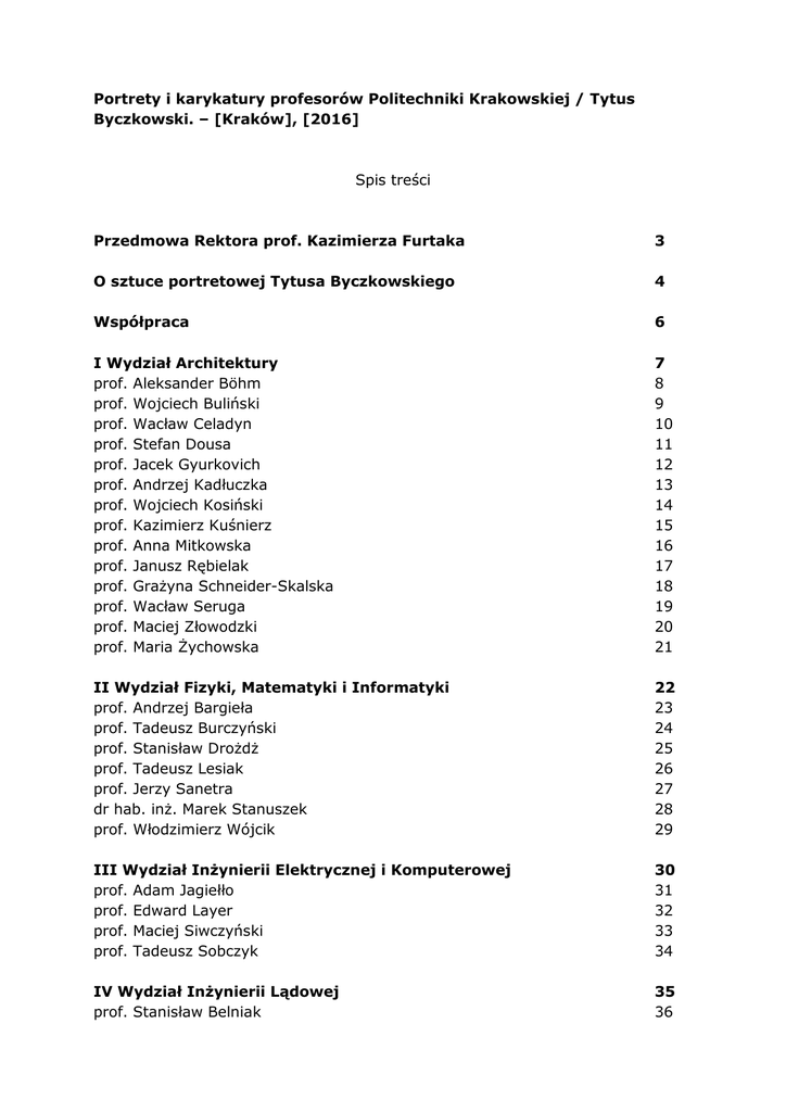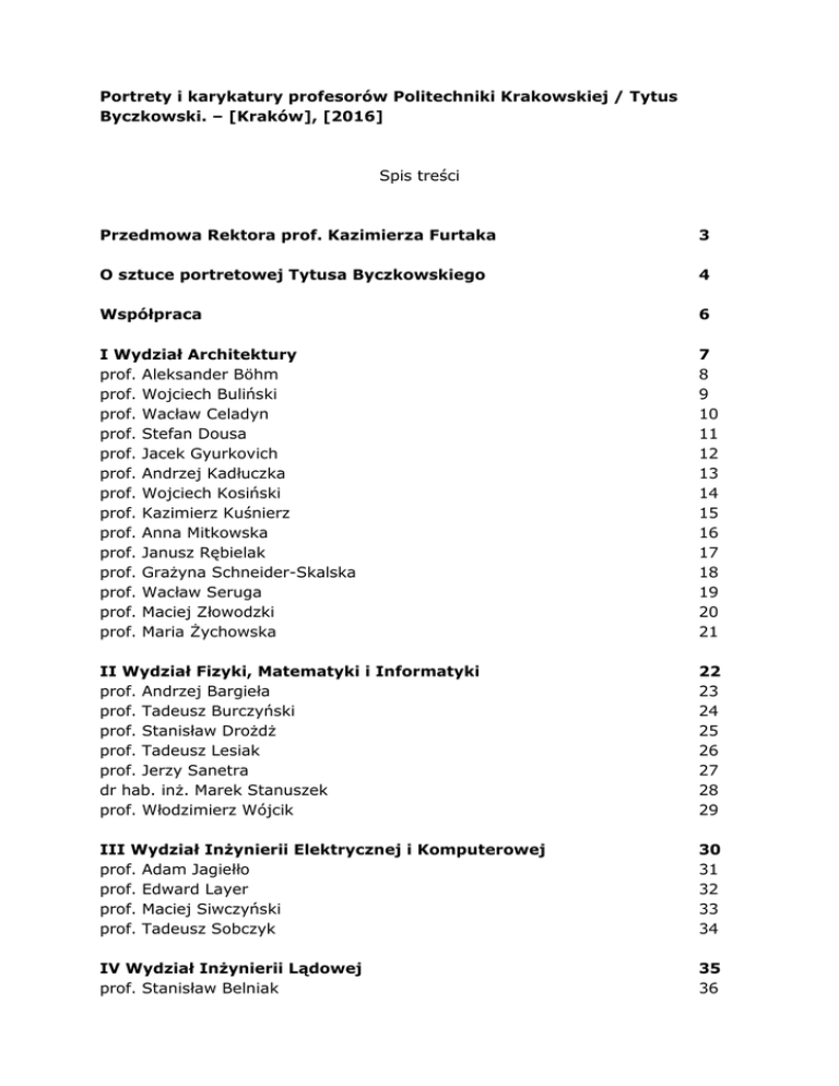 Portrety i karykatury profesorów Politechniki Krakowskiej / Tytus Byczkowski. – [Kraków], [2016] Spis treści Przedmowa Rektora prof. Kazimierza Furtaka 3 O sztuce portretowej Tytusa Byczkowskiego 4 Współpraca 6 I Wydział Architektury prof. Aleksander Böhm prof. Wojciech Buliński prof. Wacław Celadyn prof. Stefan Dousa prof. Jacek Gyurkovich prof. Andrzej Kadłuczka prof. Wojciech Kosiński prof. Kazimierz Kuśnierz prof. Anna Mitkowska prof. Janusz Rębielak prof. Grażyna Schneider-Skalska prof. Wacław Seruga prof. Maciej Złowodzki prof. Maria Żychowska 7 8 9 10 11 12 13 14 15 16 17 18 19 20 21 II Wydział Fizyki, Matematyki i Informatyki prof. Andrzej Bargieła prof. Tadeusz Burczyński prof. Stanisław Drożdż prof. Tadeusz Lesiak prof. Jerzy Sanetra dr hab. inż. Marek Stanuszek prof. Włodzimierz Wójcik 22 23 24 25 26 27 28 29 III Wydział Inżynierii Elektrycznej i Komputerowej prof. Adam Jagiełło prof. Edward Layer prof. Maciej Siwczyński prof. Tadeusz Sobczyk 30 31 32 33 34 IV Wydział Inżynierii Lądowej prof. Stanisław Belniak 35 36 prof. prof. prof. prof. prof. prof. prof. prof. prof. prof. prof. prof. prof. Witold Cecot Włodzimierz Czyczuła Joanna Dulińska Andrzej Flaga Kazimierz Flaga Kazimierz Furtak Stanisław Gaca Janusz Kawecki Andrzej Machowski Leszek Mikulski Krzysztof Stypuła Tadeusz Tatara Bogumił Wrana 37 38 39 40 41 42 43 44 45 46 47 48 49 V Wydział Inżynierii Środowiska prof. Anna Anielak prof. Stanisław Kandefer prof. Renata Kocwa-Haluch prof. Elżbieta Nachlik prof. Zbigniew Piasek prof. Jerzy Ratomski prof. Jacek Schnotale prof. Stanisław Węglarczyk 50 51 52 53 54 55 56 57 58 VI Wydział Inżynierii i Technologii Chemicznej prof. Dariusz Bogdał prof. Henryk Kołoczek prof. Piotr Kowalski prof. Zygmunt Kowalski prof. Jan Ogonowski prof. Krzysztof Pielichowski prof. Andrzej Stokłosa 59 60 61 62 63 64 65 66 VII Wydział Mechaniczny prof. Piotr Cyklis prof. Artur Ganczarski prof. Józef Gawlik prof. Witold Grzegożek prof. Jan Kazior prof. Marek Książek prof. Edward Lisowski prof. Aleksander Muc prof. Józef Nizioł prof. Czesław Niżankowski prof. Adam Ruszaj prof. Błażej Skoczeń 67 68 69 70 71 72 73 74 75 76 77 78 79 prof. prof. prof. prof. prof. prof. Jerzy Sładek Jolanta Stacharska-Targosz Krzysztof Szuwalski Jan Taler Leszek Wojnar Wojciech Zębala Dodatek - karykatury wybranych profesorów 80 81 82 83 84 85 86 oprac. BPK