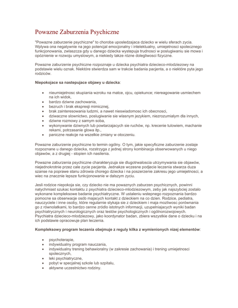 Powazne Zaburzenia Psychiczne "Powazne zaburzenie psychiczne" to choroba uposledzajaca dziecko w wielu sferach zycia. Wplywa ona negatywnie na jego potencjal emocjonalny i intelektualny, umiejetnosci spolecznego funkcjonowania, zwlaszcza gdy u danego dziecka wystepuja trudnosci w poslugiwaniu sie mowa i opóznienie w rozwoju umyslowym, a niekiedy takze rózne dolegliwosci fizyczne. Powazne zaburzenie psychiczne rozpoznaje u dziecka psychiatra dziecieco-mlodziezowy na podstawie wielu oznak. Niektóre stwierdza sam w trakcie badania pacjenta, a o niektóre pyta jego rodziców. Niepokojace sa nastepujace objawy u dziecka: • • • • • • • • nieumiejetnosc skupiania wzroku na matce, ojcu, opiekunce; niereagowanie usmiechem na ich widok, bardzo dziwne zachowania, bezruch i brak ekspresji mimicznej, brak zainteresowania ludzmi, a nawet nieswiadomosc ich obecnosci, dziwaczne slownictwo, poslugiwanie sie wlasnym jezykiem, niezrozumialym dla innych, dziwne rozmowy z samym soba, wykonywanie dziwnych lub powtarzajacych sie ruchów, np. krecenie tulowiem, machanie rekami, potrzasanie glowa itp., paniczne reakcje na wszelkie zmiany w otoczeniu. Powazne zaburzenie psychiczne to termin ogólny. O tym, jakie specyficzne zaburzenie zostaje rozpoznane u danego dziecka, rozstrzyga z jednej strony kombinacja obserwowanych u niego objawów, a z drugiej - stopien ich nasilenia. Powazne zaburzenia psychiczne charakteryzuja sie dlugotrwaloscia utrzymywania sie objawów, niejednokrotnie przez cale zycie pacjenta. Jednakze wczesne podjecie leczenia stwarza duza szanse na poprawe stanu zdrowia chorego dziecka i na poszerzenie zakresu jego umiejetnosci, a wiec na znacznie lepsze funkcjonowanie w dalszym zyciu. Jesli rodzice niepokoja sie, czy dziecko nie ma powaznych zaburzen psychicznych, powinni natychmiast szukac kontaktu z psychiatra dziecieco-mlodziezowym, zeby jak najszybciej zostalo wykonane kompleksowe badanie psychiatryczne. W ustaleniu wstepnego rozpoznania bardzo pomocne sa obserwacje osób majacych kontakt z dzieckiem na co dzien. Rodzice, pediatra, nauczyciele i inne osoby, które regularnie stykaja sie z dzieckiem i maja mozliwosc porównania go z równolatkami, to bardzo cenne zródlo istotnych informacji, uzupelniajacych wyniki badan psychiatrycznych i neurologicznych oraz testów psychologicznych i ogólnorozwojowych. Psychiatra dziecieco-mlodziezowy, jako koordynator badan, zbiera wszystkie dane o dziecku i na ich podstawie opracowuje plan leczenia. Kompleksowy program leczenia obejmuje z reguly kilka z wymienionych nizej elementów: • • • • • • psychoterapie, indywidualny program nauczania, indywidualny trening behawioralny (w zakresie zachowania) i trening umiejetnosci spolecznych, leki psychiatryczne, pobyt w specjalnej szkole lub szpitalu, aktywne uczestnictwo rodziny. Z uwagi na szybkie zmiany rozwojowe u dzieci rozpoznanie u nich powaznych zaburzen psychicznych to jedno z najtrudniejszych zadan w medycynie. Dlatego bardzo wazne jest, by pomocy dzieciom z takimi dolegliwosciami udzielali lekarze z odpowiednia specjalizacja i doswiadczeniem oraz by rodzice zglaszali sie do nich natychmiast po zaobserwowaniu pierwszych objawów.