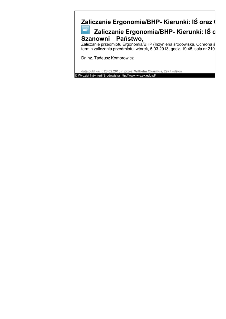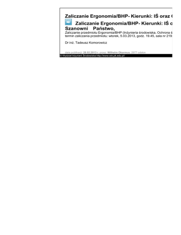 Zaliczanie Ergonomia/BHP- Kierunki: IŚ oraz OŚ Zaliczanie Ergonomia/BHP- Kierunki: IŚ oraz Szanowni Państwo, Zaliczanie przedmiotu Ergonomia/BHP (Inżynieria środowiska, Ochrona środow termin zaliczania przedmiotu: wtorek, 5.03.2013, godz. 19.45, sala nr 219. Dr inż. Tadeusz Komorowicz data publikacji: 28.02.2013 r. przez: Wilhelm Okarmus, 2977 odsłon © Wydział Inżynierii Środowiska http://www.wis.pk.edu.pl/