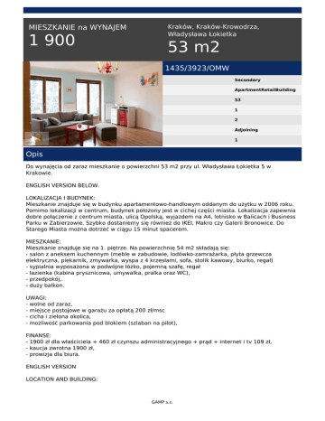 MIESZKANIE na WYNAJEM 1 900 Kraków, Kraków-Krowodrza, Władysława Łokietka 53 m2 1435/3923/OMW Secondary ApartmentRetailBuilding 53 1 2 Adjoining 1 Opis Do wynajęcia od zaraz mieszkanie o powierzchni 53 m2 przy ul. Władysława Łokietka 5 w Krakowie. ENGLISH VERSION BELOW. LOKALIZACJA I BUDYNEK: Mieszkanie znajduje się w budynku apartamentowo-handlowym oddanym do użytku w 2006 roku. Pomimo lokalizacji w centrum, budynek położony jest w cichej części miasta. Lokalizacja zapewnia dobre połączenie z centrum miasta, ulicą Opolską, wyjazdem na A4, lotnisko w Balicach i Business Parku w Zabierzowie. Szybko dostaniemy się również do IKEI, Makro czy Galerii Bronowice. Do Starego Miasta można dotrzeć w ciągu 15 minut spacerem. MIESZKANIE: Mieszkanie znajduje się na 1. piętrze. Na powierzchnię 54 m2 składają się: - salon z aneksem kuchennym (meble w zabudowie, lodówko-zamrażarka, płyta grzewcza elektryczna, piekarnik, zmywarka, wyspa z 4 krzesłami, sofa, stolik kawowy, biurko, regał) - sypialnia wyposażona w podwójne łóżko, pojemną szafę, regał - łazienka (kabina prysznicowa, umywalka, pralka oraz WC), - przedpokój, - duży balkon. UWAGI: - wolne od zaraz, - miejsce postojowe w garażu za opłatą 200 zł/msc - cicha i zielona okolica, - możliwość parkowania pod blokiem (szlaban na pilot), FINANSE: - 1900 zł dla właściciela + 460 zł czynszu administracyjnego + prąd + internet i tv 109 zł, - kaucja zwrotna 1900 zł, - prowizja dla biura. ENGLISH VERSION LOCATION AND BUILDING: GAMP s.c. The apartment is located in a residential-commercial building which was built in 2006. Despite location in the city centre, the building is located in a quiet part of town. The location provides good connection to the city center, to the A4, Balice Airport and Business Park in Zabierzów. Quickly we get also to IKEA, Makro or Bronowice Mall. The Old Town can be reached within 15 minutes walk. FLAT: The apartment is located on the 1st floor. On the surface of 54 m2 comprises: - Living room with kitchenette (furniture in the building, fridge-freezer, hob, oven, dishwasher, island with 4 chairs, sofa, coffee table, desk, bookcase) - Bedroom with a double bed, a spacious wardrobe, bookcase - Bathroom (shower, sink, washing machine and toilet) - Hall, - big balcony. COMMENTS: - Free immediately, - Parking space in the garage for a fee of 200 zł / msc - Quiet and green surroundings, - The possibility of parking at the block (gate on the remote control) FINANCES: - 1900 zł for the owner + 460 zł administrative rent + electricity + internet and tv 109 zł, - Refundable deposit of 1,900 zł. - Commission for the office. Serdecznie polecam! Bardzo proszę o kontakt lub o wypełnienie formularza na stronie: http://www.gamp-krakow.pl/zglos-poszukiwanie/ na pewno znajdziemy idealne mieszkanie, spełniające Państwa preferencje. Zachęcamy również do odwiedzenia naszej strony internetowej: www.gamp-krakow.pl KONTAKT DO AGENTA: Gabriela Bąk Tel: + 48 884 979 766 Email: [email protected] GAMP Nieruchomości. Nowa jakość. Gabriela Bąk tel. +48 884 979 766 email: [email protected] GAMP s.c. Powered by TCPDF (www.tcpdf.org)