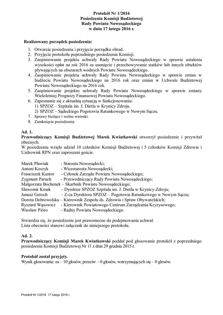 Protokół Nr 1/2016 Posiedzenia Komisji Budżetowej Rady Powiatu