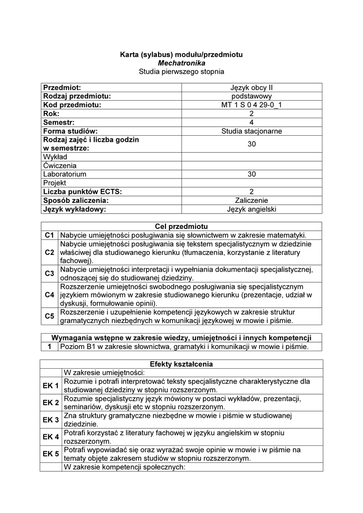 Karta (sylabus) modułu/przedmiotu Mechatronika Studia pierwszego stopnia Język obcy II podstawowy MT 1 S 0 4 29-0_1 2 4 Studia stacjonarne Przedmiot: Rodzaj przedmiotu: Kod przedmiotu: Rok: Semestr: Forma studiów: Rodzaj zajęć i liczba godzin w semestrze: Wykład Ćwiczenia Laboratorium Projekt Liczba punktów ECTS: Sposób zaliczenia: Język wykładowy: 30 30 2 Zaliczenie Język angielski Cel przedmiotu C1 Nabycie umiejętności posługiwania się słownictwem w zakresie matematyki. Nabycie umiejętności posługiwania się tekstem specjalistycznym w dziedzinie C2 właściwej dla studiowanego kierunku (tłumaczenia, korzystanie z literatury fachowej). Nabycie umiejętności interpretacji i wypełniania dokumentacji specjalistycznej, C3 odnoszącej się do studiowanej dziedziny. Rozszerzenie umiejętności swobodnego posługiwania się specjalistycznym C4 językiem mówionym w zakresie studiowanego kierunku (prezentacje, udział w dyskusji, formułowanie opinii). Rozszerzenie i uzupełnienie kompetencji językowych w zakresie struktur C5 gramatycznych niezbędnych w komunikacji językowej w mowie i piśmie. Wymagania wstępne w zakresie wiedzy, umiejętności i innych kompetencji 1 Poziom B1 w zakresie słownictwa, gramatyki i komunikacji w mowie i piśmie. Efekty kształcenia EK 1 EK 2 EK 3 EK 4 EK 5 W zakresie umiejętności: Rozumie i potrafi interpretować teksty specjalistyczne charakterystyczne dla studiowanej dziedziny w stopniu rozszerzonym. Rozumie specjalistyczny język mówiony w postaci wykładów, prezentacji, seminariów, dyskusji etc w stopniu rozszerzonym. Zna struktury gramatyczne niezbędne w mowie i piśmie w studiowanej dziedzinie. Potrafi korzystać z literatury fachowej w języku angielskim w stopniu rozszerzonym. Potrafi wypowiadać się oraz wyrażać swoje opinie w mowie i w piśmie na tematy objęte zakresem studiów w stopniu rozszerzonym. W zakresie kompetencji społecznych: Potrafi samodzielnie posługiwać się językiem angielskim w obszarze studiowanej dziedziny. Potrafi samodzielnie wyszukiwać informacje w literaturze specjalistycznej w EK 7 języku angielskim. EK 6 L1 L2 L3 L4 L5 L6 L7 L8 L9 L10 L11 L12 L13 L14 L15 1 Treści programowe przedmiotu Forma zajęć – laboratoria Innowacyjność – dobry pomysł a kopiowanie, rozwijanie i udoskonalanie prototypów w dobie XXI wieku. Idealne zebranie biznesowe – rola przewodniczącego – opinie, sugestie, komentarze, zmiana tematów. Czasy przeszłe (Past Simple, Past Continuous). Analiza przypadku – prowadzenie zebrań w praktyce z uwzględnieniem procedur pisania sprawozdań. Telewizja wysokiej rozdzielczości – historia i rozwój. Odczytywanie i interpretacja danych technicznych. Stres w miejscu pracy i sposoby radzenia sobie z nim. Efektywne zarządzanie czasem. Czynne uczestniczenie w dyskusji biznesowej, wyrażanie własnych opinii, popieranie i odrzucanie propozycji z logicznym jej uzasadnieniem. Czasy Past Simple i Present Perfect. Analiza przypadku firmy GVM – omawianie przyczyn trudnej sytuacji firmy na tle problemów pracowniczych. Powtórzenie i utrwalenie wiadomości z U5 oraz języka specjalistycznego. Kolokwium sprawdzające. Podtrzymywanie kontaktów towarzyskich w sytuacjach zawodowych. Utrzymywanie stałych a pozyskiwanie nowych klientów. Użycie czasowników złożonych tzw. phrasal verbs. Analiza przypadku – organizacja konferencji biznesowej z uwzględnieniem stawianych priorytetów. Rola gościa i gospodarza. Kariera w elektronice, awionice, informatyce, obronności, przemyśle elektronicznym, telekomunikacyjnym i linii medycznej. Czujniki i testy wypadkowe, opisy działania i wykorzystania urządzeń technicznych. Telefon komórkowy – zarys historii, zastosowanie i użycie. Kolokwium sprawdzające znajomość słownictwa biznesowego oraz specjalistycznego. Podsumowanie wyników nauczania w IV semestrze. Testowanie. Metody dydaktyczne Ćwiczenie audytoryjne – analiza tekstów, dyskusja, praca w grupach i w parach, praca ze słownikiem, słuchanie nagrań CD, oglądanie wybranych materiałów DVD, ćwiczenia gramatyczne, prezentacje multimedialne, gry symulacyjne, analiza przypadków Obciążenie pracą studenta Średnia liczba godzin na zrealizowanie Forma aktywności aktywności Godziny kontaktowe z wykładowcą, 32 w tym: 30 2 18 18 50 udział w zajęciach konsultacje Praca własna studenta, w tym: przygotowanie do zajęć. Łączny czas pracy studenta Sumaryczna liczba punktów ECTS dla przedmiotu: Liczba punktów ECTS w ramach zajęć o charakterze praktycznym (ćwiczenia, laboratoria, projekty) 1 2 1 2 3 4 2 2 Literatura podstawowa Market Leader pre-intermediate Business English Coursebook, Pearson Longman Market Leader pre-intermediate Business English Practice File, Pearson Longman Literatura uzupełniająca M. Ibbotson, Cambridge English for Engineering R. Murphy, English Grammar in Use, Cambridge University Press M. Ibbotson, Professional English in Use P. Emmerson, Business Grammar Builder Macierz efektów kształcenia Efekt kształcenia EK1 EK2 EK3 EK4 EK5 Odniesienie danego efektu kształcenia do efektów zdefiniowanych dla całego programu (PEK) MT1A_U01+ MT1A_U04+ MT1A_U05++ MT1A_U19+ MT1A_U01+ MT1A_U04+ MT1A_U05++ MT1A_U19+ MT1A_U01+ MT1A_U04+ MT1A_U05++ MT1A_U19+ MT1A_U01+ MT1A_U04+ MT1A_U05++ MT1A_U19+ MT1A_U01+ MT1A_U04+ MT1A_U05++ Cele przedmiotu Treści programowe Metody dydaktyczne Metody oceny C1, C2, C3, C5 L1-L15 1 O1, O2 C1, C4, C5 L1-L15 1 O1, O2 C2, C3, C5 L1-L15 1 O1, O2 C1, C2, C3, C5 L1-L15 1 O1, O2 C1, C4, C5 L1-L15 1 O1, O2 EK6 EK7 MT1A_U19+ MT1A_K01+ MT1A_K05+ MT1A_K01+ MT1A_K05+ C1, C2, C3, C4, C5 C1, C2, C3, C5 L1-L15 1 O1, O2 L1-L15 1 O1, O2 Metody i kryteria oceny Symbol metody oceny O1 O2 Opis metody oceny Kolokwium sprawdzające wiedzę z określonej partii materiału (pisemne lub ustne). Zaliczenie semestru Autor Mgr Irmina Krzyżanowska-Stelmach programu: Adres e-mail: [email protected] Jednostka Studium Języków Obcych org