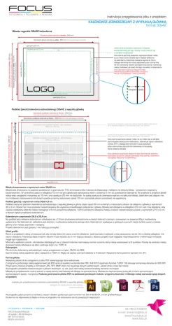 instrukcja przygotowania pliku z projektem KALENDARZ JEDNODZIELNY Z wypukłĄ GłÓWKĄ format 30x42 Główka wypukła 30x20 kalendarza Szerokość główki kalendarza brutto - 340 mm Szerokość główki kalendarza netto - 300 mm format gotowego produktu spad górny 20 mm spad do prawej 20 mm margines prawy 10 mm spad do lewej 20 mm otwór do powieszenia margines lewy 10 mm Wysokosc główki kalendarza netto - 200 mm format gotowego produktu Wysokość główki kalendarza brutto - 240 mm format brutto jest sumą spadów i formatu netto margines górny 10 mm zielona linia przerywana wyznacza margines, ważne elementy jak logo i teksty muszą mieścić się w obrębie marginesów linia czarna jest liną zawijania i wyznacza obszar netto, to co mieści się w obrębie tej linii będzie widoczne na kalendarzu, tolerancja zawijania wynosi ok 3mm, dlatego elementy tła muszą wystawać poza czarną linię do linii czerwonej, obszar pomiędzy linią czarną i czerwoną należy traktowac jak spad, którego nie widać na kalendarzu linia czerwona wyznacza obszar brutto elementy tła powinny dochodzić do tej linii tak jak na przykładzie - szary prostokąt margines spady margines dolny 10 mm spad dolny 20 mm Podkład (plecki) kalendarza jednodzielnego 30x42 z wypukłą główką Szerokość podkładu kalendarza Brutto - 310 mm format brutto jest sumą spadów i formatu netto szara linia przerywana wyznacza obszar klejenia główki kalendarza tło w obszarze klejenia musi pozostać białe - bez zadruku ZAKŁADKA NA KLEJENIE GŁÓWKI - BEZ ZADRUKU 300 mm x 30 mm linia składania szara linia przerywana wyznacza obszar przyklejania kalendarium; tło w obszarze klejenia musi pozostać białe - bez zadruku OBSZAR KLEJENIA KALENDARIUM - BEZ ZADRUKU 275 mm x 20 mm linia czarna wyznacza obszar netto, to co mieści się w obrębie tej linii będzie widoczne na kalendarzu, tolerancja cięcia i skladania wynosi 2mm, dlatego elementy tła muszą wystawać poza czarną linię cięcia do linii czerwonej, to są spady, które zostaną obcięte MIEJSCE NA KALENDARIUM wymiar kalendarium 285 mm x 204 mm KALENDARIUM linia czerwona wyznacza obszar brutto elementy tła powinny dochodzić do tej linii, obszar pomiedzy linią czarną a czerwona nie będzie widoczny na kalendarzu spad do prawej 5 mm spad do lewej 5 mm wysokośc posdkładu 219 mm Netto wysokość podkładu kalendarza Brutto - 259 mm format brutto jest sumą spadów i formatu netto spad 35 mm Szerokość podkladu kalendarza Netto - 300 mm format gotowego produktu spady spad dolny 5 mm Główka kaszerowana o wymiarach netto 30x20 cm. Główka jest drukowana na papierze powlekanym o gramaturze 170, laminowana folia matową lub błyszczącą i naklejana na tekturę falistą – proces ten nazywamy kaszerowaniem. W centralnej części w odległości 10 mm od góry główki jest wykonywany otwór o średnicy 5 mm do powieszenia kalendarza. W projekcie w projekcie główki należy więc uwzględnić marginesy po 10 mm, oraz spady po 20 mm na każdy bok - te spady posłużą do zawinięcia wydruku na tekturze falistej. Jeżeli tłem jest zdjęcie i nie ma możliwości zastosowania tak dużych spadów prosimy zastosować spady 10 mm i pozostały obszar pozostawić nie wypełniony. Podkład (plecki) o wymiarach netto 30x21,9 cm. Podkład zwany też pleckami kalendarza jednodzielnego z wypukłą główką w górnej części spad 35 mm w którym umieszczamy obszar do sklejenia z główką o wymiarach 30 x 3 cm, Obszar ten musi pozostać niezadrukowany dla uzyskania prawidłowego połączenia z główką. Główka jest doklejana w odległości 2,5 mm nad linią składania i aby uzyskać estetyczny efekt tło należy rozciągnąć o 5 mm ponad linię składania. 12mm poniżej linii składania należy umieścić niezadrukowany pasek o wymiarach 27,5 x 2 cm, w którym będzie przyklejone kalendarium. Kalendarium o wymiarach 28,5 x 20,4 cm. Na podkład jest naklejane kalendarium składające się z 12 kart drukowane jednostronnie w dwóch kolorach czarnym i czerwonym na papierze 80g z możliwością wydzierania. Na kalendarium zakładane jest okienko z możliwością wskazanie jednego dnia. Kalendarium występuje w gotowych wzorach, każda kartka zawiera miesiąc główny oraz miesiąc poprzedni i następny. Projekt kalendarium jest gotowy i nie należy go przesyłać. Układ grafiki. Ramki w projektach należy umieszczać tak aby nie były blisko linii ciecia oraz linii składania - jeżeli jest taka możliwość unikaj stosowania ramek i linii w bliskiej odległości linii cięcia i składania. Tolerancja błędu krajarki i falcerki może wynieść do 2 mm stąd po obcięciu i złożeniu projekt może wyglądać nieprofesjonalnie a reklamacja nie będzie mogła być rozpatrzona. Minimalna wielkość czcionki - dla tekstów składających się z czterech kolorów najmniejszy rozmiar czcionki, który należy zastosować to 8 punktów. Poniżej tej wartości należy stosować teksty składające się tylko z jednego koloru np. 100% K. Kolorystyka. Plik do druku kalendarzy jednodzielnych należy przygotować w trybie - CMYK lub RGB. Czarne teksty należy wypełniać tylko i wyłącznie w 100% K. Nigdy nie zapisuj czarnych tekstów w 4 kolorach. Nasycenie barw powinno wynosić min. 8%. Format plików. Najwyższą jakość druku osiągniemy z pliku PDF zawierającego dane wektorowe. Z programu graficznego należy wygenerować plik PDF wraz ze spadami w standardzie PDF/X-4:2010 zgodność Acrobat 7 (PDF 1.6) stosując kompresję obrazów do 300 DPI Przyjmujemy również projekty w formatach JPG, TIFF, BMP, które nie zawierają danych wektorowych - jakość druku może być niższa. W przypadku projektów dostarczonych w plikach otwartych : ai, cdr, psd, indd należy koniecznie teksty zamienić na krzywe. Makiety do projektowania można pobrać z naszej strony internetowej lub klikając na poniższe ikony. Makieta to zwymiarowany pusty plik z liniami pomocniczymi wyznaczając
