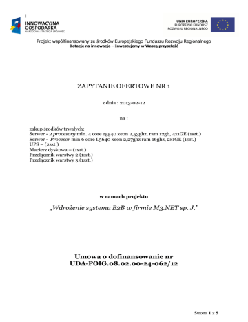 Projekt współfinansowany ze środków Europejskiego Funduszu Rozwoju Regionalnego Dotacje na innowacje – Inwestujemy w Waszą przyszłość ZAPYTANIE OFERTOWE NR 1 z dnia : 2013-02-12 na : zakup środków trwałych: Serwer - 2 procesory min. 4 core e5540 xeon 2,53ghz, ram 12gb, 4x1GE (1szt.) Serwer - Procesor min 6 core L5640 xeon 2,27ghz ram 16ghz, 2x1GE (1szt.) UPS – (2szt.) Macierz dyskowa – (1szt.) Przełącznik warstwy 2 (1szt.) Przełącznik warstwy 3 (1szt.) w ramach projektu „Wdrożenie systemu B2B w firmie M3.NET sp. J.” Umowa o dofinansowanie nr UDA-POIG.08.02.00-24-062/12 Strona 1 z 5 Projekt współfinansowany ze środków Europejskiego Funduszu Rozwoju Regionalnego Dotacje na innowacje – Inwestujemy w Waszą przyszłość Firma M3.NET R.Niesyt M.Uczniak W.Wardas Sp. J. stosując zasadę konkurencyjności zaprasza do złożenia oferty cenowej, której celem będzie wyłonienie dostawcy: środków trwałych. Szczegółowy opis: pkt.3. w ramach realizowanego projektu: Wdrożenie systemu B2B w firmie M3.NET Sp. J. 1. TRYB POSTĘPOWANIA Zamawiający wybierze najkorzystniejszą spośród złożonych ofert w oparciu o ustalone w zapytaniu ofertowym kryteria oceny, patrz punkt 6. 2. INFORMACJE O ZAMAWIAJĄCYM M3.NET R.Niesyt M.Uczniak W.Wardas spółka jawna ul. Międzyrzecka 183 43-382 Bielsko-Biała NIP: 5472085147 REGON: 240857950 KRS: 0000299512 Osoba do kontaktu: Wojciech Wardas Tel: 608 648 210 3. PRZEDMIOT ZAMÓWIENIA Przedmiotem zamówienia jest: zakup środków trwałych, szczegółowy opis: pkt.4 Strona 2 z 5 Projekt współfinansowany ze środków Europejskiego Funduszu Rozwoju Regionalnego Dotacje na innowacje – Inwestujemy w Waszą przyszłość 4. SZCZEGÓŁOWY OPIS PRZEDMIOTU ZAMÓWIENIA 1. 1szt. Serwer: 2 procesory min. 4 core e5540 xeon 2,53ghz, ram 12gb, 4x1GE, iDrac, Kontroler RAID, Windows server enterprise, Dyski 8x 146gb sas 10k, 4x300gb sas 10k 2. 1szt. Serwer: Procesor min 6 core L5640 xeon 2,27ghz ram 16ghz, 2x1GE, Kontroler Raid, Redundantne zasilacze, Dyski 2x 147GB SAS 15k, 2x 1TB SATA windows server enterprise 3. 2szt. UPS (lub 1szt. O sumarycznych parametrach nie gorszych niż 2szt.): 2500VA 2U + bateria zewnętrzna, UPS 5000VA 4. Macierz dyskowa: Kontrolery: Dwie pary redundantnych kontrolerów (zapewniające wysoką dostępność) posiadające łącznie minimum 4złącz GigabitEthernet iSCSI. Wymagane poziomy RAID co najmniej 5, 6, 10, 50. Łączna pamięć cache: 4GB pamięci podręcznej (dla obu kontrolerów łącznie) z nieograniczonym czasowo zabezpieczeniem w razie awarii zasilania. Zamawiający nie dopuszcza rozwiązań wykorzystujących moduły bateryjne. Dyski: Zainstalowane min. 14x 500GB hot plug SAS 7.2k RPM, możliwość rozbudowy dodatkowymi modułami macierzy do pojemności minimum 100TB Bezpieczeństwo danych: Hot Spare, Technologia SMART, Automatyczne zastępowanie wadliwych sektorów, Automatyczny system monitorowania dysków nadzorujący poprawność zapisu danych na dyskach, Redundancja zasilania Funkcjonalność: Zmiana wielkości dysków logicznych bez przerywania dostępu do danych. Oprogramowanie: Zamawiający wymaga zapewnienia bez dodatkowych opłat następujących funkcjonalności oprogramowania zarządzającego: • Klonowanie (minimum 128 klonów na wolumen) i kopie migawkowe (snapshot – minimum 128 na wolumen), • Automatyczna replikacja, • Zapisywalne i odzyskiwalne snapshoty, kopie migawkowe ze wsparciem dla MS SQL, MS Exchange, VMware ESX • Oprogramowanie do zarządzania snapshotami od strony serwera, • Wielościeżkowy dostęp do danych, • Oprogramowanie zarządzające wieloma macierzami, • Harmonogram migawek i automatycznej replikacji, • Elastyczną rezerwację potrzebnej ilości pamięci dokładnie wtedy, gdy jest ona potrzebna (ang. thin provisioning), • Funkcja E-mail Home (wysyłanie wiadomości o problemach do producenta macierzy), • Administrowanie oparte na rolach, • Centralny monitoring wydajności modułów macierzy (w tym raportowanie również na podstawie historycznych danych) oraz monitoring zdarzeń w obrębie macierzy, Strona 3 z 5 Projekt współfinansowany ze środków Europejskiego Funduszu Rozwoju Regionalnego Dotacje na innowacje – Inwestujemy w Waszą przyszłość Interfejsy administracyjne: SNMP, telnet, SSH, HTTP, interfejs oparty na sieci Web (SSL), Konsola szeregowa Metody powiadamiania: SNMP, e-mail, dziennik systemowy Warunki gwarancji dla macierzy: Przynajmniej trzy lata gwarancji z czasem reakcji do 4 godzin od zgłoszenia, przyjmowanie zgłoszeń 24 godziny na dobę, 7 dni w tygodniu. 5. Przełącznik sieciowy 2 warstwy: 48portów, Stakowanie urządzeń "FlexStack", Power over Ethernet Plus (PoE+), QoS, 4 x 1 GbE (SFP) ports 6. Przełącznik sieciowy 3 warstwy: 48portów, 10/100/1000T, 4 SFP, Standard Multilayer Image 5. PRZYGOTOWANIE OFERTY Dostawca, który posiada możliwość dostarczenia sprzętu zgodnie z powyższą specyfikacją i jest zainteresowany realizacją zamówienia, powinien przygotować i złożyć do zamawiającego ofertę wg formularza ofertowego stanowiącego załącznik do niniejszego zapytania. Oferta powinna zawierać: Cenę netto, kwotę VAT i cenę brutto przedmiotu zamówienia; Okres realizacji; Wykonawca będzie związany ofertą przez 30 dni od daty zamknięcia terminu składania ofert. Planowany termin wykonania zamówienia 2013-03-31 6. KRYTERIUM OCENY OFERT Kryterium Cena Waga (%) 100% Oferta, która otrzyma największą ilość punktów zostanie wybrana jako najkorzystniejsza. Strona 4 z 5 Projekt współfinansowany ze środków Europejskiego Funduszu Rozwoju Regionalnego Dotacje na innowacje – Inwestujemy w Waszą przyszłość 7. TERMIN I MIEJSCE SKŁADANIA OFERT Oferty można składać: Ofertę należy złożyć w terminie do dnia 2013-02-25 osobiście lub pisemnie drogą pocztową na adres firmy: ul. Międzyrzecka 183 43-382 Bielsko-Biała Oferty można również przesyłać drogą mailową na adres: [email prot