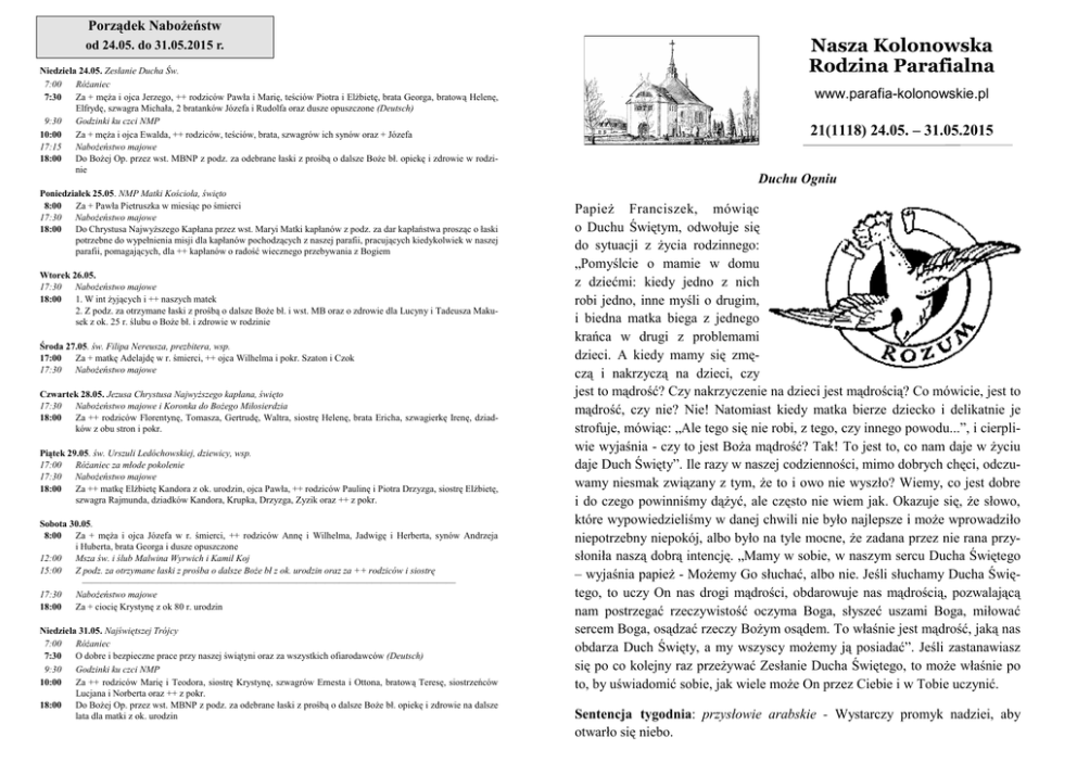 Porządek Nabożeństw od 24.05. do 31.05.2015 r. Niedziela 24.05. Zesłanie Ducha Św. 7:00 Różaniec 7:30 Za + męża i ojca Jerzego, ++ rodziców Pawła i Marię, teściów Piotra i Elżbietę, brata Georga, bratową Helenę, Elfrydę, szwagra Michała, 2 bratanków Józefa i Rudolfa oraz dusze opuszczone (Deutsch) 9:30 Godzinki ku czci NMP 10:00 Za + męża i ojca Ewalda, ++ rodziców, teściów, brata, szwagrów ich synów oraz + Józefa 17:15 Nabożeństwo majowe 18:00 Do Bożej Op. przez wst. MBNP z podz. za odebrane łaski z prośbą o dalsze Boże bł. opiekę i zdrowie w rodzinie Poniedziałek 25.05. NMP Matki Kościoła, święto 8:00 Za + Pawła Pietruszka w miesiąc po śmierci 17:30 Nabożeństwo majowe 18:00 Do Chrystusa Najwyższego Kapłana przez wst. Maryi Matki kapłanów z podz. za dar kapłaństwa prosząc o łaski potrzebne do wypełnienia misji dla kapłanów pochodzących z naszej parafii, pracujących kiedykolwiek w naszej parafii, pomagających, dla ++ kapłanów o radość wiecznego przebywania z Bogiem Wtorek 26.05. 17:30 Nabożeństwo majowe 18:00 1. W int żyjących i ++ naszych matek 2. Z podz. za otrzymane łaski z prośbą o dalsze Boże bł. i wst. MB oraz o zdrowie dla Lucyny i Tadeusza Makusek z ok. 25 r. ślubu o Boże bł. i zdrowie w rodzinie Środa 27.05. św. Filipa Nereusza, prezbitera, wsp. 17:00 Za + matkę Adelajdę w r. śmierci, ++ ojca Wilhelma i pokr. Szaton i Czok 17:30 Nabożeństwo majowe Czwartek 28.05. Jezusa Chrystusa Najwyższego kapłana, święto 17:30 Nabożeństwo majowe i Koronka do Bożego Miłosierdzia 18:00 Za ++ rodziców Florentynę, Tomasza, Gertrudę, Waltra, siostrę Helenę, brata Ericha, szwagierkę Irenę, dziadków z obu stron i pokr. Piątek 29.05. św. Urszuli Ledóchowskiej, dziewicy, wsp. 17:00 Różaniec za młode pokolenie 17:30 Nabożeństwo majowe 18:00 Za ++ matkę Elżbietę Kandora z ok. urodzin, ojca Pawła, ++ rodziców Paulinę i Piotra Drzyzga, siostrę Elżbietę, szwagra Rajmunda, dziadków Kandora, Krupka, Drzyzga, Zyzik oraz ++ z pokr. Sobota 30.05. 8:00 Za + męża i ojca Józefa w r. śmierci, ++ rodziców Annę i Wilhelma, Jadwigę i Herberta, synów Andrzeja i Huberta, brata Georga i dusze opuszczone 12:00 Msza św. i ślub Malwina Wyrwich i Kamil Koj 15:00 Z podz. za otrzymane łaski z prośba o dalsze Boże bł z ok. urodzin oraz za ++ rodziców i siostrę ————————–—–——–——–————————————–———–————————— 17:30 Nabożeństwo majowe 18:00 Za + ciocię Krystynę z ok 80 r. urodzin Niedziela 31.05. Najświętszej Trójcy 7:00 Różaniec 7:30 O dobre i bezpieczne prace przy naszej świątyni oraz za wszystkich ofiarodawców (Deutsch) 9:30 Godzinki ku czci NMP 10:00 Za ++ rodziców Marię i Teodora, siostrę Krystynę, szwagrów Ernesta i Ottona, bratową Teresę, siostrzeńców Lucjana i Norberta oraz ++ z pokr. 18:00 Do Bożej Op. przez wst. MBNP z podz. za odebrane łaski z prośbą o dalsze Boże bł. opiekę i zdrowie na dalsze lata dla matki z ok. urodzin Nasza Kolonowska Rodzina Parafialna www.parafia-kolonowskie.pl 21(1118) 24.05. – 31.05.2015 Duchu Ogniu Papież Franciszek, mówiąc o Duchu Świętym, odwołuje się do sytuacji z życia rodzinnego: „Pomyślcie o mamie w domu z dziećmi: kiedy jedno z nich robi jedno, inne myśli o drugim, i biedna matka biega z jednego krańca w drugi z problemami dzieci. A kiedy mamy się zmęczą i nakrzyczą na dzieci, czy jest to mądrość? Czy nakrzyczenie na dzieci jest mądrością? Co mówicie, jest to mądrość, czy nie? Nie! Natomiast kiedy matka bierze dziecko i delikatnie je strofuje, mówiąc: „Ale tego się nie robi, z tego, czy innego powodu...”, i cierpliwie wyjaśnia - czy to jest Boża mądrość? Tak! To jest to, co nam daje w życiu daje Duch Święty”. Ile razy w naszej codzienności, mimo dobrych chęci, odczuwamy niesmak związany z tym, że to i owo nie wyszło? Wiemy, co jest dobre i do czego powinniśmy dążyć, ale często nie wiem jak. Okazuje się, że słowo, które wypowiedzieliśmy w danej chwili nie było najlepsze i może wprowadziło niepotrzebny niepokój, albo było na tyle mocne, że zadana przez nie rana przysłoniła naszą dobrą intencję. „Mamy w sobie, w naszym sercu Ducha Świętego – wyjaśnia papież - Możemy Go słuchać, albo nie. Jeśli słuchamy Ducha Świętego, to uczy On nas drogi mądrości, obdarowuje nas mądrością, pozwalającą nam postrzegać rzeczywistość oczyma Boga, słyszeć uszami Boga, miłować sercem Boga, osądzać rzeczy Bożym osądem. To właśnie jest mądrość, jaką nas obdarza Duch Święty, a my wszyscy możemy ją posiadać”. Jeśli zastanawiasz się po co kolejny raz przeżywać Zesłanie Ducha Świętego, to może właśnie po to, by uświadomić sobie, jak wiele może On przez Ciebie i w Tobie uczynić. Sentencja tygodnia: przysłowie arabskie - Wystarczy promyk nadziei, aby otwarło się niebo. 21/2015 W 2015 roku w naszej parafii 17 dzieci przyjęło I Komunię św. 17 młodych osób przyjęło sakrament Bierzmowania. Dotychczas odbyło się: 6 Chrztów, 3 śluby, 9 pogrzebów. W ostatnim czasie odbyły się pogrzeby: śp. Stefania Steinert l. l. 78; śp. Andrzej Gomoła l. 65; śp. Joachim Gawlik l. 54; śp. Jerzy Krupok l. 64. ———–————————————-—–————–—–———————– Zapowiedzi przedślubne: 1. Dawid Dyla zam. Staniszcze Wielkie i Paulina Makusek zam. Kolonowskie; 1. Mariusz Firuta zam. Strzelce Opolskie i Aleksandra Morawiec zam. Kolonowskie; 1. Paweł Mandla zam. Borycz i Dominika Żyłka zam. Kolonowskie. ———–————————————-—–————–—–———————– Rozpoczęto malowanie naszej świątyni. Polecajmy te prace w naszej modlitwie. Oby wszystko się udało i wszystko przebiegało bezpiecznie. Modlimy się podczas Mszy św. oraz indywidualnie za darczyńc