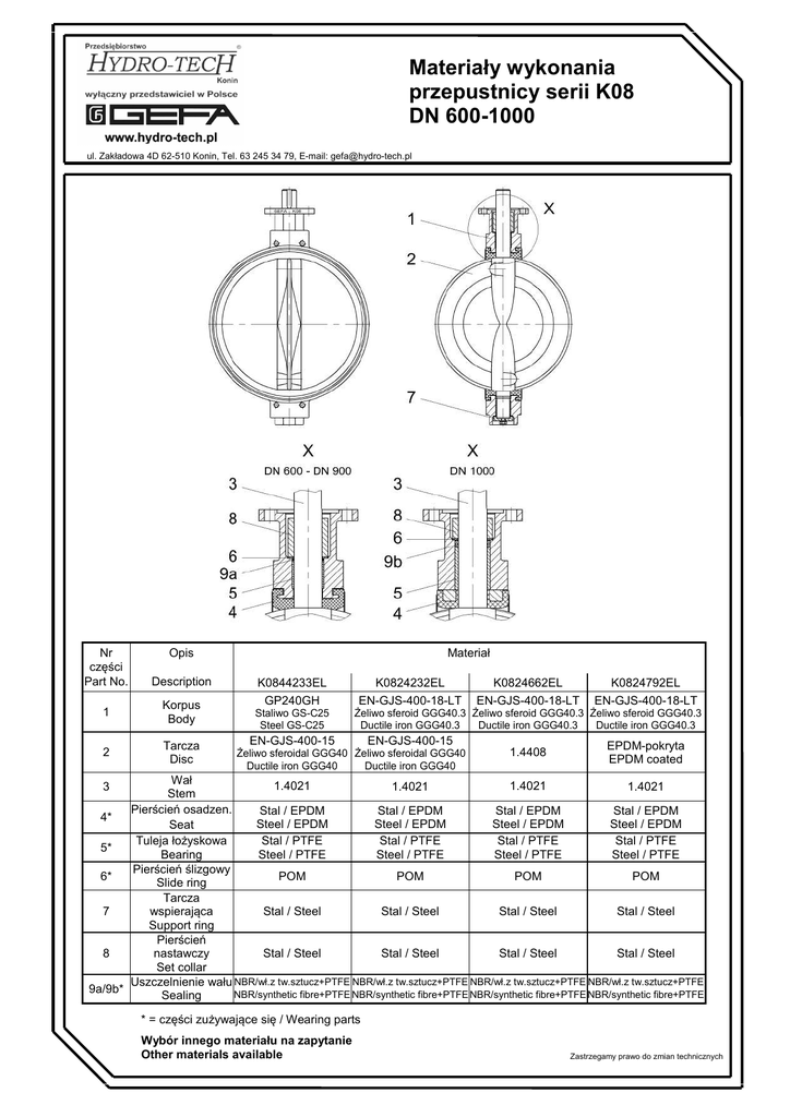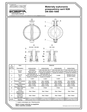 Materiały wykonania przepustnicy serii K08 DN 600-1000 ul. Zakładowa 4D 62-510 Konin, Tel. 63 245 34 79, E-mail: [email protected] Nr części Part No. Opis Description 1 Korpus Body 2 Tarcza Disc Materiał K0844233EL GP240GH Staliwo GS-C25 Steel GS-C25 K0824232EL EN-GJS-400-18-LT K0824662EL EN-GJS-400-18-LT K0824792EL EN-GJS-400-18-LT Żeliwo sferoid GGG40.3 Żeliwo sferoid GGG40.3 Żeliwo sferoid GGG40.3 Ductile iron GGG40.3 Ductile iron GGG40.3 Ductile iron GGG40.3 EN-GJS-400-15 EN-GJS-400-15 Żeliwo sferoidal GGG40 Żeliwo sferoidal GGG40 Ductile iron GGG40 Ductile iron GGG40 1.4408 EPDM-pokryta EPDM coated Wał 1.4021 1.4021 1.4021 1.4021 Stem Pierścień osadzen. Stal / EPDM Stal / EPDM Stal / EPDM Stal / EPDM 4* Steel / EPDM Steel / EPDM Steel / EPDM Steel / EPDM Seat Tuleja łożyskowa Stal / PTFE Stal / PTFE Stal / PTFE Stal / PTFE 5* Bearing Steel / PTFE Steel / PTFE Steel / PTFE Steel / PTFE Pierścień ślizgowy 6* POM POM POM POM Slide ring Tarcza 7 wspierająca Stal / Steel Stal / Steel Stal / Steel Stal / Steel Support ring Pierścień 8 nastawczy Stal / Steel Stal / Steel Stal / Steel Stal / Steel Set collar Uszczelnienie wału NBR/wł.z tw.sztucz+PTFE NBR/wł.z tw.sztucz+PTFE NBR/wł.z tw.sztucz+PTFE NBR/wł.z tw.sztucz+PTFE 9a/9b* NBR/synthetic fibre+PTFE NBR/synthetic fibre+PTFE NBR/synthetic fibre+PTFE NBR/synthetic fibre+PTFE Sealing 3 * = części zużywające się / Wearing parts Wybór innego materiału na zapytanie Other materials available Zastrzegamy prawo do zmian technicznych