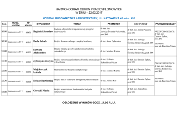 HARMONOGRAM OBRON PRAC DYPLOMOWYCH W DNIU – 22.02.2017 WYDZIAŁ BUDOWNICTWA i ARCHITEKTURY, UL. KATOWICKA 48 sala : K-2 Godz. RODZ. studiów Nr albumu DYPLOMANT TEMAT PROMOTOR dr hab. inż. 10.00 Budownictwo ST I° 83470 Bagiński Jarosław Badanie odpowiedzi temperaturowej przegród budowlanych 10.30 Budownictwo ST I° 86363 Duda Jakub Projekt domu weselnego z częścią hotelową dr inż. Anna Dębowska 11.00 Budownictwo ST I° Serwata 86353 Aleksandra Projekt zmiany sposobu użytkowania budynku mieszkalnego dr inż. Mariusz Kupina 11.30 Budownictwo ST I° 86343 Jędrusyna Justyna w Raciborzu 12.00 Budownictwo ST I° 86341 Majcherczyk Izabela 12.30 Budownictwo ST I° Kołacz Bartłomiej Projekt hali ze stalowym dźwigarem pełnościennym dr inż. Juliusz Kuś 80838 13.00 Budownictwo ST I° 86448 Górecki Maria Jadwiga Świrska-Perkowska, prof. PO RECENZENT dr hab. inż. Janina Pieczara, prof. PO dr hab. inż. Jadwiga dr hab. inż. Jadwiga Świrska-Perkowska, prof. PO dr hab. inż. Damian Bęben, prof. PO Stan techniczny budynku zabytkowego dr hab. inż. Damian Bęben, prof. PO Projekt wzmocnienia fundamentów budynku zabytkowego dr hab. inż. Damian Bęben, prof. PO dr inż. Elżbieta dr hab. inż. Adam Rak, Kokocińska-Pakiet prof. PO OGŁOSZENIE WYNIKÓW GODZ. 14.00 AULA PRZEWODNICZĄCY: dr hab. inż. Damian Bęben, prof. PO Świrska-Perkowska, prof. PO Sekretarz : mgr inż. Karolina Tatara Projekt zabezpieczenia skarpy zbiornika retencyjnego dr inż. Elżbieta Kokocińska-Pakiet dr inż. Mariusz Kupina PRZEWODNICZĄCY PRZEWODNICZĄCY: dr hab. inż. Jadwiga Świrska-Perkowska, prof. PO Sekretarz : mgr inż. Karolina Tatara HARMONOGRAM OBRON PRAC DYPLOMOWYCH W DNIU – 22.02.2017 WYDZIAŁ BUDOWNICTWA i ARCHITEKTURY, UL. KATOWICKA 48 sala : K-110 Godz. RODZ. studiów Nr albumu 10.00 Budownictwo ST I° 86467 10.30 Budownictwo ST I° 80832 DYPLOMANT Babicki Patryk Klimczak Iwona 11.00 Budownictwo ST I° 84894 Michalczuk Karolina 11.30 Budownictwo ST I° 86381 Kaliciak Agnieszka TEMAT Wpływ temperatury na wytrzymałość zapraw cementowych z dodatkiem domieszek chemicznych dr hab. inż. Elżbieta Janowska-Renkas, prof. PO Wpływ dodatków mineralnych oraz mączek granitowej, dolomitowej i wapiennej na właściwości dr hab. inż. Elżbieta fizyczne i wytrzymałościowe zapraw cementowych Janowska-Renkas, prof. PO Wpływ domieszek chemicznych na właściwości betonów stosowanych przy budowie dróg i mostów dr hab. inż. Elżbieta Janowska-Renkas, prof. PO Wpływ popiołów lotnych z fluidalnego spalania na odporność korozyjną zapraw cementowych dr hab. inż. Elżbieta Janowska-Renkas, prof. PO 12.00 Budownictwo ST I° 83799 Kurpiers Klaudia Projekt galerii wystawienniczej z przekryciem 12.30 Budownictwo NSI° 70999 Polak Rafał Geosyntetyki w geotechnice - projekt wzmocnienia nasypu drogowego Beśka Mieszko Projekt hali na potrzeby produkcji rolniczej o konstrukcji stalowej 13.00 Budownictwo ST I° 83432 PROMOTOR drewnianym dr inż. Andrzej Marynowicz dr inż. Elżbieta Kokocińska-Pakiet dr inż. Mariusz Kupina OGŁOSZENIE WYNIKÓW GODZ. 14.00 AULA RECENZENT PRZEWODNICZĄCY dr inż. Aneta Matuszek-Chmurowska dr inż. Aneta PRZEWODNICZĄCY: dr hab. inż. Zbigniew Perkowski, prof. PO Matuszek-Chmurowska dr inż. Aneta Matuszek-Chmurowska Sekretarz : mgr inż. K.arolina Drozdowska prof. dr hab. Stefania Grzeszczyk dr hab. inż. PRZEWODNICZĄCY: Zbigniew Perkowski, prof. PO dr hab. inż. Elżbieta Janowska-Renkas, prof. PO dr hab. inż. Wojciech Anigacz, prof. PO Sekretarz : dr hab. inż. Zbigniew Perkowski, prof. PO mgr inż. Karolina Drozdowska HARMONOGRAM OBRON PRAC DYPLOMOWYCH W DNIU – 22.02.2017 WYDZIAŁ BUDOWNICTWA i ARCHITEKTURY, UL. KATOWICKA 48 sala : K-3 RODZ. studiów Godz. Nr albumu 10.00 Budownictwo ST I° 86349 10.30 Budownictwo ST I° 86345 11.00 Budownictwo ST I° 84895 DYPLOMANT Vogel Wioleta Jagieła Piotr Młynarczyk Iwona TEMAT Projekt centrum kongresowego z garażem podziemnym Porównanie właściwości cieplnych i wilgotnościowych przegród w konstrukcjach drewnianych z bali i konstrukcjach drewnianych szkieletowych PROMOTOR dr inż. Andrzej Marynowicz Jerzy Wyrwał dr inż. Andrzej Marynowicz dr inż. Przemysław Jakiel dr hab. inż. Piotr Górski, prof. PO Porównanie zapotrzebowania na energię cieplną w projektowanym budynku jednorodzinnym na przykładzie kilku różnych grubości izolacji cieplnej prof. dr hab. inż. dr inż. Aneta Jerzy Wyrwał Matuszek-Chmurowska dr inż. Anna Dębowska 12.00 Budownictwo ST I° 86396 Białas Damian Projekt budynku jednorodzinnego przystosowanego do potrzeb osoby niepełnosprawnej 12.30 Budownictwo ST I° 80866 Kuraś Michał Modernizacja instalacji ogrzewania budynku dr hab. inż. Adam Rak, mieszkalnego z zastosowaniem odnawialnych źródeł prof. PO energii 13.00 Budownictwo ST I° 86452 Turek Andrzej Projekt żelbetowego szkieletu budynku restauracji. 13.30 Budownictwo ST Balsam Mateusz Hala stalowa z ramami pełnościennymi o zmiennych dr inż. Juliusz Kuś przekrojach poprzecznych II° prof. PO Inwentaryzacja i ocena nośności zabytkowego kratownicowego wiaduktu w Srebnej Górze Kotula Sebastian dr inż. Dominika Pilarska OGŁOSZENIE WYNIKÓW GODZ. 14.00 AULA PRZEWODNICZĄCY dr hab. inż. Piotr Górski, prof. dr hab. inż. 11.30 Budownictwo ST I° 86369 77807 RECENZENT PRZEWODNICZĄCY: Dr hab. inż. Adam Rak, prof. PO Sekretarz : mgr inż. Joanna Nowacka dr hab. inż. Adam Rak, prof. PO PRZEWODNICZĄCY: dr inż. Dariusz Fabianowski Prof. dr hab. inż. Jerzy Wyrwał dr hab. inż. Piotr Górski, Sekretarz : mgr inż. Joanna Nowacka prof. PO dr hab. inż. Adam Rak, prof. PO