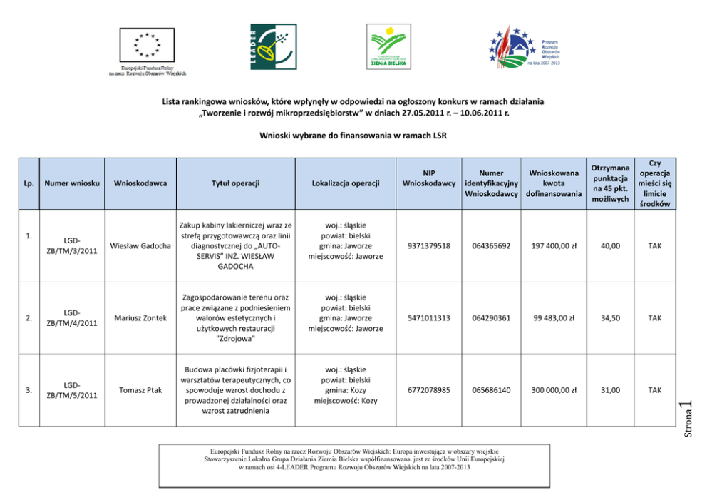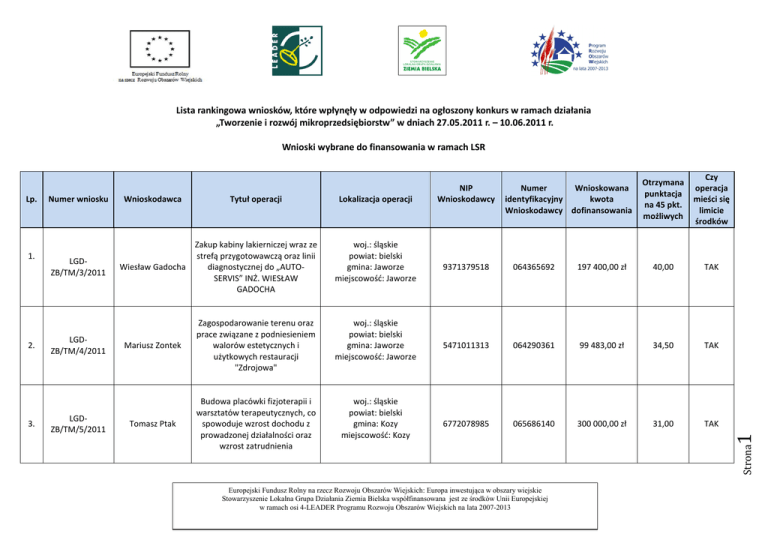 Lista rankingowa wniosków, które wpłynęły w odpowiedzi na ogłoszony konkurs w ramach działania „Tworzenie i rozwój mikroprzedsiębiorstw” w dniach 27.05.2011 r. – 10.06.2011 r. 1. 2. 3. Numer wniosku LGDZB/TM/3/2011 LGDZB/TM/4/2011 LGDZB/TM/5/2011 Wnioskodawca Tytuł operacji Lokalizacja operacji Wiesław Gadocha Zakup kabiny lakierniczej wraz ze strefą przygotowawczą oraz linii diagnostycznej do „AUTOSERVIS” INŻ. WIESŁAW GADOCHA woj.: śląskie powiat: bielski gmina: Jaworze miejscowość: Jaworze Mariusz Zontek Zagospodarowanie terenu oraz prace związane z podniesieniem walorów estetycznych i użytkowych restauracji "Zdrojowa" woj.: śląskie powiat: bielski gmina: Jaworze miejscowość: Jaworze Tomasz Ptak Budowa placówki fizjoterapii i warsztatów terapeutycznych, co spowoduje wzrost dochodu z prowadzonej działalności oraz wzrost zatrudnienia woj.: śląskie powiat: bielski gmina: Kozy miejscowość: Kozy Numer Wnioskowana identyfikacyjny kwota Wnioskodawcy dofinansowania Otrzymana punktacja na 45 pkt. możliwych Czy operacja mieści się limicie środków 9371379518 064365692 197 400,00 zł 40,00 TAK 5471011313 064290361 99 483,00 zł 34,50 TAK 6772078985 065686140 300 000,00 zł 31,00 TAK Europejski Fundusz Rolny na rzecz Rozwoju Obszarów Wiejskich: Europa inwestująca w obszary wiejskie Stowarzyszenie Lokalna Grupa Działania Ziemia Bielska współfinansowana jest ze środków Unii Europejskiej w ramach osi 4-LEADER Programu Rozwoju Obszarów Wiejskich na lata 2007-2013 Strona Lp. NIP Wnioskodawcy 1 Wnioski wybrane do finansowania w ramach LSR LGDZB/TM/2/2011 Emanuel Barzycki Adaptacja garażu na warsztat naprawy samochodów oraz zakup wyposażenia warsztatu woj.: śląskie powiat: bielski gmina: Jaworze miejscowość: Jaworze 9371020757 065407094 56 546,50 zł 30,50 TAK 9371396103 065394376 100 000,00 zł 28,63 TAK 2 5. LGDZB/TM/1/11 woj.: śląskie powiat: bielski gmina: Kozy miejscowość: Kozy Strona 4. P&P AUTO DUET S.C. PAWEŁ GLEINDEK, PAWEŁ FILAS Zakup nowoczesnego wyposażenia warsztatu samochodowego, biura i pomieszczeń socjalnych inwestycją umożliwiającą rozwój prowadzonej działalności gospodarczej Europejski Fundusz Rolny na rzecz Rozwoju Obszarów Wiejskich: Europa inwestująca w obszary wiejskie Stowarzyszenie Lokalna Grupa Działania Ziemia Bielska współfinansowana jest ze środków Unii Europejskiej w ramach osi 4-LEADER Programu Rozwoju Obszarów Wiejskich na lata 2007-2013
