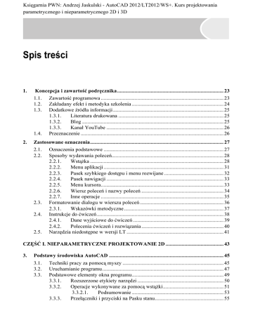 Księgarnia PWN: Andrzej Jaskulski - AutoCAD 2012/LT2012/WS+. Kurs projektowania parametrycznego i nieparametrycznego 2D i 3D Spis treści 1. Koncepcja i zawartość podręcznika............................................................................... 23 1.1. Zawartość programowa ........................................................................................... 23 1.2. Zakładany efekt i metodyka szkolenia .................................................................... 24 1.3. Dodatkowe źródła informacji .................................................................................. 25 1.3.1. Literatura drukowana .............................................................................. 25 1.3.2. Blog ......................................................................................................... 25 1.3.3. Kanał YouTube ....................................................................................... 26 1.4. Przeznaczenie .......................................................................................................... 26 2. Zastosowane oznaczenia................................................................................................... 27 2.1. Oznaczenia podstawowe ......................................................................................... 27 2.2. Sposoby wydawania poleceń................................................................................... 28 2.2.1. Wstążka ................................................................................................... 28 2.2.2. Menu aplikacji ......................................................................................... 31 2.2.3. Pasek szybkiego dostępu i menu rozwijane ............................................ 32 2.2.4. Pasek nawigacji ....................................................................................... 33 2.2.5. Menu kursora........................................................................................... 33 2.2.6. Wiersz poleceń i nazwy poleceń ............................................................. 34 2.2.7. Inne operacje ........................................................................................... 35 2.3. Formatowanie dialogu w wierszu poleceń .............................................................. 36 2.3.1. Wskazówki metodyczne.......................................................................... 37 2.4. Instrukcje do ćwiczeń .............................................................................................. 38 2.4.1. Dane wyjściowe do ćwiczeń ................................................................... 39 2.4.2. Polecenia ćwiczeń i rozwiązania ............................................................. 40 2.5. Narzędzia niedostępne w wersji LT ........................................................................ 41 CZĘŚĆ I. NIEPARAMETRYCZNE PROJEKTOWANIE 2D ........................................... 43 3. Podstawy środowiska AutoCAD ..................................................................................... 45 3.1. 3.2. 3.3. Techniki pracy za pomocą myszy ........................................................................... 45 Uruchamianie programu.......................................................................................... 47 Podstawowe elementy okna programu.................................................................... 49 3.3.1. Rozszerzone etykiety narzędzi ................................................................ 50 3.3.2. Operacje wykonywane za pomocą wstążki............................................. 51 3.3.2.1. Podsumowanie .................................................................... 53 3.3.3. Przełączniki i przyciski na Pasku stanu................................................... 55 6 AutoCAD 2012/LT2012/WS+. Kurs projektowania parametrycznego i nieparametrycznego 2D i 3D 3.4. 3.5. 3.6. 3.7. 3.8. 3.9. 3.10. 3.11. 3.12. 3.13. 3.14. 3.15. 3.16. 3.17. 3.18. 3.19. 3.20. 3.21. 3.22. 3.23. 3.3.3.1. Wyświetlanie przełączników i przycisków na pasku.......... 55 3.3.3.2. Przełączanie przełączników ................................................ 57 3.3.4. Karta modelu i karty arkuszy (układów)................................................. 58 Metody wydawania poleceń .................................................................................... 59 Wydawanie polecenia za pomocą panelu wstążki .................................................. 59 3.5.1. Ćwiczenia ................................................................................................ 59 Podstawowe kształty kursora .................................................................................. 61 3.6.1. Kursor graficzny...................................................................................... 61 3.6.2. Wskaźnik zbioru wskazań ....................................................................... 62 3.6.3. Kursor graficzny ze wskaźnikiem zbioru wskazań ................................. 62 Cofanie i ponawianie polecenia – ćwiczenia .......................................................... 63 Wyszukiwanie polecenia za pomocą Menu aplikacji.............................................. 64 3.8.1. Ćwiczenia ................................................................................................ 64 Wydawanie polecenia za pomocą klawiatury ......................................................... 65 3.9.1. Okno poleceń i wiersz poleceń................................................................ 65 3.9.2. Autouzupełnianie (Autocomplete) .......................................................... 67 3.9.3. Rysowanie odcinków za pomocą klawiatury – ćwiczenia ...................... 68 Opcje poleceń .......................................................................................................... 69 3.10.1. Opcja domyślna ..............