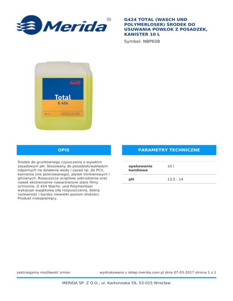 G424 TOTAL (WASCH UND POLYMERLOSER) ŚRODEK DO USUWANIA POWŁOK Z POSADZEK, KANISTER 10 L Symbol: NBP608 OPIS PARAMETRY TECHNICZNE Środek do gruntownego czyszczenia o wysokim zasadowym pH. Stosowany do posadzek/wykładzin odpornych na działanie wody i zasad np. do PCV, kamienia (nie polerowanego), płytek klinkierowych i glinianych. Rozpuszcza uciążliwe zabrudzenia oraz nawet ekstremalnie nawarstwione stare filmy ochronne. G 424 Wachs- und Polymerlöser wykazuje wyjątkową siłę rozpuszczania, dobrą rozlewność i bardzo niewielki poziom śliskości. Produkt niskopieniący. zastrzegamy możliwość zmian opakowanie handlowe 10 l pH 13,5 - 14 wydrukowano z sklep.merida.com.pl dnia 07-03-2017 strona 1 z 1 MERIDA SP. Z O.O., ul. Karkonoska 59, 53-015 Wrocław