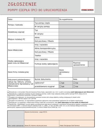 Data: Do wypełnienia: Typ pompy ciepła Pompa / kaskada: Nr seryjny pompy Typ Dodatkowy osprzęt Nr seryjny Miejsce instalacji PC Adres Kod pocztowy / Miasto Imię i nazwisko Adres korespondencyjny Dane Właściciela Kod pocztowy / Miasto Telefon Osoba zgłaszająca jeżeli inna niż Właściciel Imię i nazwisko Pisemne upoważnienie Funkcja osoby zgłaszającej Dane firmy instalacyjnej Numer dokumentu Dokument potwierdzający zakup (np. faktura, umowa, zapłacona? oświadczenie Sprzedawcy lub Właściciela) przedstawiono oryginał Dane sprzedawcy PC Data tak nie tak nie Oświadczam, iż otrzymałem Warunki Gwarancji Pomp Ciepła, zapoznałem się z nimi i w pełni je akceptuję (jeśli Zgłaszającym jest Właściciel) Oświadczam, iż zgłaszana instalacja nie jest instalacją autorską i wedle mojej najlepszej wiedzy spełnia wymogi STE-PL (Wytyczne do Projektowania i Wykonywana Systemów z Pompami Ciepła) Przyjąłem do wiadomości, że nieuzasadnione wezwanie serwisu jest usługą odpłatną, według następujących stawek netto: 1 roboczogodzina - 90 PLN, dojazd 1 km 1,64 PLN Przyjąłem do wiadomości, że nieprawidłowo wypełnione zgłoszenie może spowodować opóźnienia lub nie będzie rozpatrywane Oświadczam, że uzgodniłem z Właścicielem Pompy Ciepła fakt uruchomienia i daty (jeśli Zgłaszający to inna osoba niż Właściciel) WŁAŚCICIEL / ZGŁASZAJĄCY wyraża zgodę na przetwarzanie jego danych osobowych i przesyłanie korespondencji zgodnie z przepisami ustawy z dnia 29 sierpnia 1997 r. o ochronie danych osobowych (Dz. U. z 2002 r. nr 101, poz.926 z późn. zm.) w celu realizacji obsługi technicznej, gwarancyjnej i pogwarancyjnej prowadzonej przez i w imieniu Stiebel Eltron Polska Sp. z o.o. Zlecenie Uruchomienia - uwagi STE-PL: Data / podpis zgłszającego Nazwa ZS, któremu zlecona jest praca Podpis Zlecającego (Szef Serwisu)