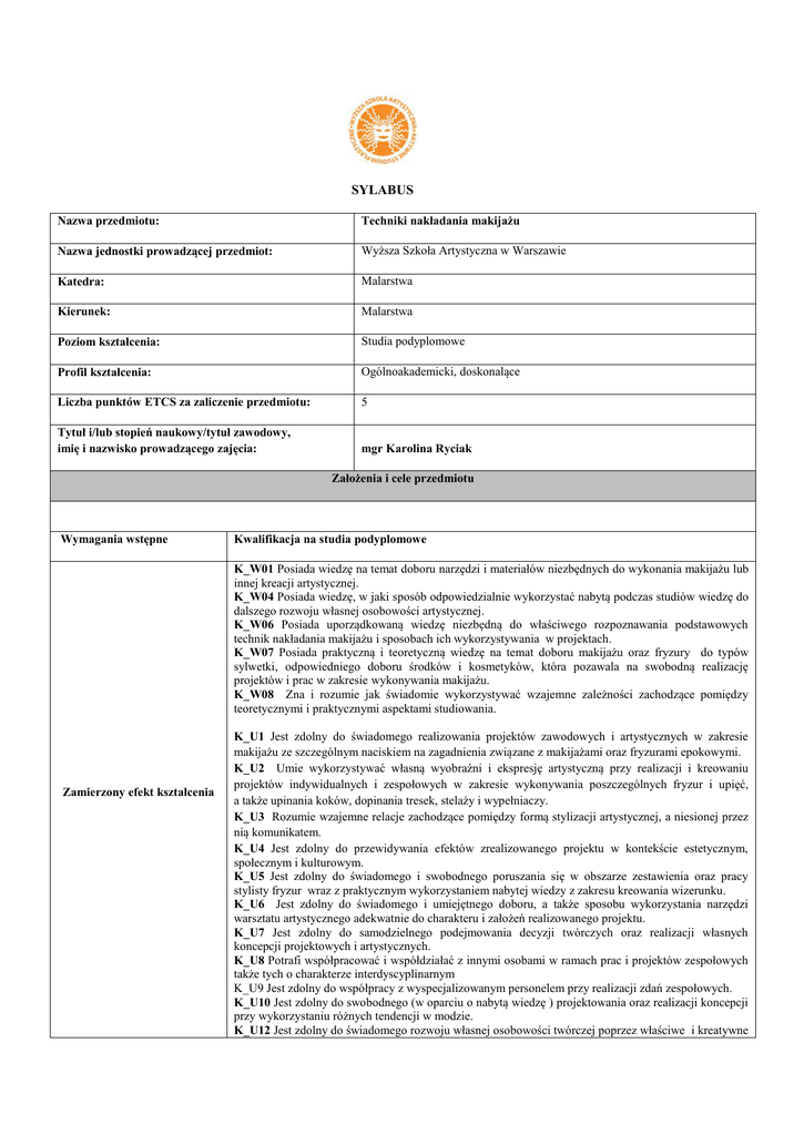 SYLABUS Nazwa przedmiotu: Techniki nakładania makijażu Nazwa jednostki prowadzącej przedmiot: Wyższa Szkoła Artystyczna w Warszawie Katedra: Malarstwa Kierunek: Malarstwa Poziom kształcenia: Studia podyplomowe Profil kształcenia: Ogólnoakademicki, doskonalące Liczba punktów ETCS za zaliczenie przedmiotu: 5 Tytuł i/lub stopień naukowy/tytuł zawodowy, imię i nazwisko prowadzącego zajęcia: mgr Karolina Ryciak Założenia i cele przedmiotu Wymagania wstępne Kwalifikacja na studia podyplomowe K_W01 Posiada wiedzę na temat doboru narzędzi i materiałów niezbędnych do wykonania makijażu lub innej kreacji artystycznej. K_W04 Posiada wiedzę, w jaki sposób odpowiedzialnie wykorzystać nabytą podczas studiów wiedzę do dalszego rozwoju własnej osobowości artystycznej. K_W06 Posiada uporządkowaną wiedzę niezbędną do właściwego rozpoznawania podstawowych technik nakładania makijażu i sposobach ich wykorzystywania w projektach. K_W07 Posiada praktyczną i teoretyczną wiedzę na temat doboru makijażu oraz fryzury do typów sylwetki, odpowiedniego doboru środków i kosmetyków, która pozawala na swobodną realizację projektów i prac w zakresie wykonywania makijażu. K_W08 Zna i rozumie jak świadomie wykorzystywać wzajemne zależności zachodzące pomiędzy teoretycznymi i praktycznymi aspektami studiowania. Zamierzony efekt kształcenia K_U1 Jest zdolny do świadomego realizowania projektów zawodowych i artystycznych w zakresie makijażu ze szczególnym naciskiem na zagadnienia związane z makijażami oraz fryzurami epokowymi. K_U2 Umie wykorzystywać własną wyobraźni i ekspresję artystyczną przy realizacji i kreowaniu projektów indywidualnych i zespołowych w zakresie wykonywania poszczególnych fryzur i upięć, a także upinania koków, dopinania tresek, stelaży i wypełniaczy. K_U3 Rozumie wzajemne relacje zachodzące pomiędzy formą stylizacji artystycznej, a niesionej przez nią komunikatem. K_U4 Jest zdolny do przewidywania efektów zrealizowanego projektu w kontekście estetycznym, społecznym i kulturowym. K_U5 Jest zdolny do świadomego i swobodnego poruszania się w obszarze zestawienia oraz pracy stylisty fryzur wraz z praktycznym wykorzystaniem nabytej wiedzy z zakresu kreowania wizerunku. K_U6 Jest zdolny do świadomego i umiejętnego doboru, a także sposobu wykorzystania narzędzi warsztatu artystycznego adekwatnie do charakteru i założeń realizowanego projektu. K_U7 Jest zdolny do samodzielnego podejmowania decyzji twórczych oraz realizacji własnych koncepcji projektowych i artystycznych. K_U8 Potrafi współpracować i współdziałać z innymi osobami w ramach prac i projektów zespołowych także tych o charakterze interdyscyplinarnym K_U9 Jest zdolny do współpracy z wyspecjalizowanym personelem przy realizacji zdań zespołowych. K_U10 Jest zdolny do swobodnego (w oparciu o nabytą wiedzę ) projektowania oraz realizacji koncepcji przy wykorzystaniu różnych tendencji w modzie. K_U12 Jest zdolny do świadomego rozwoju własnej osobowości twórczej poprzez właściwe i kreatywne wykorzystanie indywidualnych umiejętności warsztatowych. Umie przewidzieć efekty zrealizowanych projektów. K_U13 Umie świadomie wykorzystać swoją wiedzę i umiejętności do realizowania zadań związanych z doborem trendów do typów sylwetki. K_K01 Jest zdolny do zorganizowania planu i warsztatu pracy w ramach realizacji projektów zespołowych i interdyscyplinarnych pogłębiania swojej wiedzy i rozwijania warsztatu pracy i umiejętności i rozumie, że musi je nabywać na bieżąco. K_K02 Jest zdolny do gromadzenia i przetwarzania informacji, które mogą być twórczo wykorzystane przy realizacji różnorodnych projektów makijażowych. K_K03 Jest zdolny do rozumienia potrzeby uczenia się przez całe życie i świadomego wykorzystywania nabytej wiedzy i umiejętności. K_K04 Jest zdolny do efektywnego wykorzystania wyobraźni, intuicji, twórczej postawy i samodzielnego myślenia w celu rozwiązywania problemów projektowych i twórczych. K_K05 Jest zdolny do konstruktywnej krytyki w stosunku do działań innych osób. K_K06 Jest zdolny do podejmowania działań i realizowania projektów w ramach współpracy zespołowej. K_K07 Jest zdolny do efektywnego komunikowania się i życia w społeczeństwie w szczególności: pracy zespołowej w ramach wspólnych projektów i działań oraz prezentacji zadań w sposób komunikatywny i przekonujący Liczba godzin dydaktycznych i formy zajęć i punkty ECTS: Liczba godzin dydaktycznych i kontaktowych (w tym): Przedmiot I semestr Forma zajęć: (W - wykład, Ć - ćwiczenia, K -konwersatorium) Razem 20 Techniki nakładania makijażu W Ć 20 K Godziny kontaktowe 20 W, Ć R – rygor (egzamin, - E, zaliczenie z oceną –Zo, zaliczenie – Z) Treści programowe nauczania [ treść zajęć] Wykład1 Wprowadzenie do zajęć, Zapoznanie się z „materiałami do makijażu”, Rodzaje makijażu, Wykład2 Teoria korygowania, Kształt twarzy. Ćwiczenia1: Korygowanie kształtu twarzy, Wykład 3 Teoria korygowania poszczególnych elementów twarzy: Samodzielna praca słuchacza Rygor ECTS 130h E 5 Kształty oczu, Kształty ust, Kształty brwi. Ćwiczenia: Korygowanie: oczy, usta, brwi. Egzamin Przegląd teczek: teoria makijażu. Kształty twarzy – wycinki Kształty oczu – wycinki Kształty brwi – wycinki Kształty ust – wycinki Zagadnienia programowe nauczania: Narzędzie/ metody dydaktyczne: Forma i sposób zaliczenia oraz wymagania egzaminacyjne: Metody i kryteria oceny: Wymagania końcowe: Większość zajęć ma charakter konwersatorium, uzupełniany dyskusją ze studentami, pracą grupową. Pozytywny wynik pracy pisemnej Frekwencja oraz pozytywny wynik zaliczenia pracy pisemnej. W skład oceny zaliczeniowej wchodzą: - podsumowanie obecności – dopuszczalne 2 nieobecności w semestrze, - wykonane i ocenione pozytywne projekty w trakcie semestru. Formy weryfikacji osiągnięcia Zaliczenie p