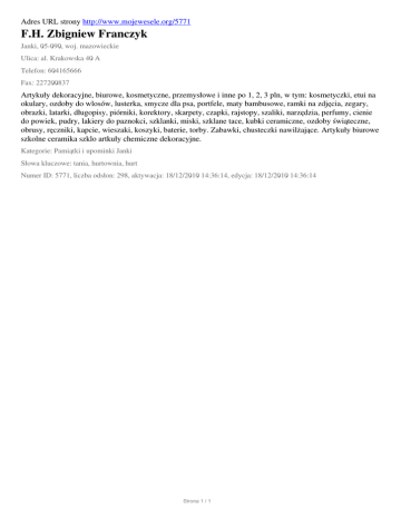Adres URL strony http://www.mojewesele.org/5771 F.H. Zbigniew Franczyk Janki, 05-090, woj. mazowieckie Ulica: al. Krakowska 40 A Telefon: 604165666 Fax: 227200837 Artykuły dekoracyjne, biurowe, kosmetyczne, przemysłowe i inne po 1, 2, 3 pln, w tym: kosmetyczki, etui na okulary, ozdoby do wlosów, lusterka, smycze dla psa, portfele, maty bambusowe, ramki na zdjęcia, zegary, obrazki, latarki, długopisy, piórniki, korektory, skarpety, czapki, rajstopy, szaliki, narzędzia, perfumy, cienie do powiek, pudry, lakiery do paznokci, szklanki, miski, szklane tace, kubki ceramiczne, ozdoby świąteczne, obrusy, ręczniki, kapcie, wieszaki, koszyki, baterie, torby. Zabawki, chusteczki nawilżające. Artykuły biurowe szkolne ceramika szklo artkuły chemiczne dekoracyjne. Kategorie: Pamiątki i upominki Janki Słowa kluczowe: tania, hurtownia, hurt Numer ID: 5771, liczba odsłon: 298, aktywacja: 18/12/2010 14:36:14, edycja: 18/12/2010 14:36:14 Strona 1 / 1