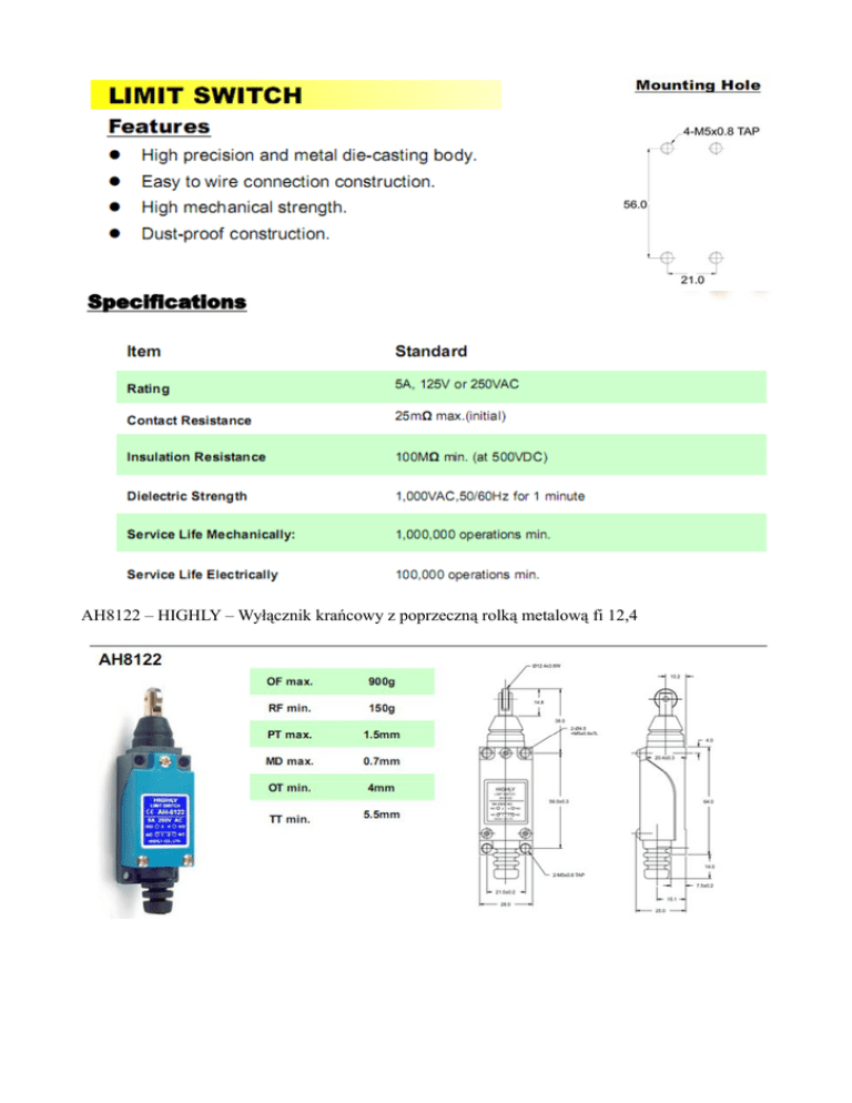 AH8122 – HIGHLY – Wyłącznik krańcowy z poprzeczną rolką metalową fi 12,4