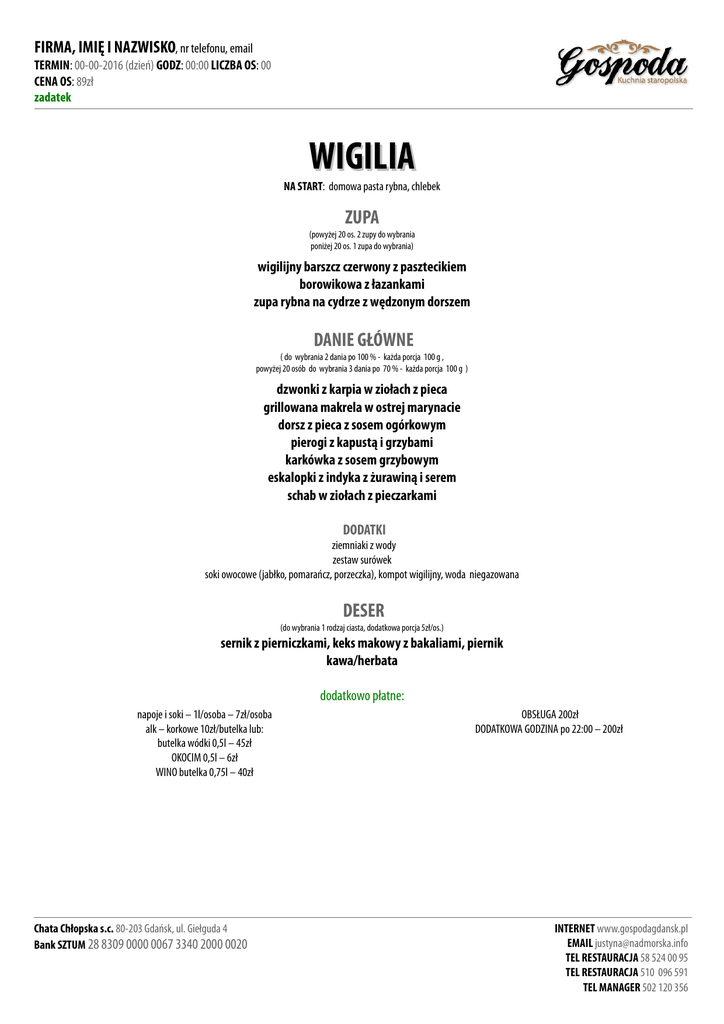 FIRMA, IMIĘ I NAZWISKO, nr telefonu, email TERMIN: 00-00-2016 (dzień) GODZ: 00:00 LICZBA OS: 00 CENA OS: 89zł zadatek WIGILIA NA START: domowa pasta rybna, chlebek ZUPA (powyżej 20 os. 2 zupy do wybrania poniżej 20 os. 1 zupa do wybrania) wigilijny barszcz czerwony z pasztecikiem borowikowa z łazankami zupa rybna na cydrze z wędzonym dorszem DANIE GŁÓWNE ( do wybrania 2 dania po 100 % - każda porcja 100 g , powyżej 20 osób do wybrania 3 dania po 70 % - każda porcja 100 g ) dzwonki z karpia w ziołach z pieca grillowana makrela w ostrej marynacie dorsz z pieca z sosem ogórkowym pierogi z kapustą i grzybami karkówka z sosem grzybowym eskalopki z indyka z żurawiną i serem schab w ziołach z pieczarkami DODATKI ziemniaki z wody zestaw surówek soki owocowe (jabłko, pomarańcz, porzeczka), kompot wigilijny, woda niegazowana DESER (do wybrania 1 rodzaj ciasta, dodatkowa porcja 5zł/os.) sernik z pierniczkami, keks makowy z bakaliami, piernik kawa/herbata dodatkowo płatne: napoje i soki – 1l/osoba – 7zł/osoba alk – korkowe 10zł/butelka lub: butelka wódki 0,5l – 45zł OKOCIM 0,5l – 6zł WINO butelka 0,75l – 40zł Chata Chłopska s.c. 80-203 Gdańsk, ul. Giełguda 4 Bank SZTUM 28 8309 0000 0067 3340 2000 0020 OBSŁUGA 200zł DODATKOWA GODZINA po 22:00 – 200zł INTERNET www.gospodagdansk.pl EMAIL [email protected] TEL RESTAURACJA 58 524 00 95 TEL RESTAURACJA 510 096 591 TEL MANAGER 502 120 356