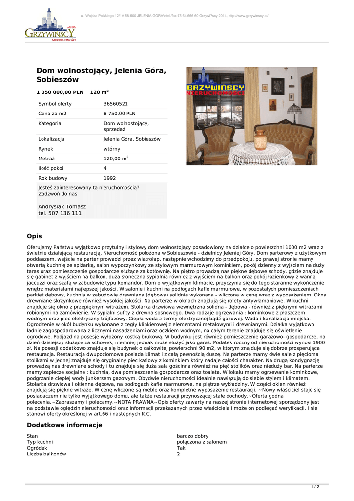 ul. Wojska Polskiego 12/1A 58-500 JELENIA GÓRA\ntel./fax:75 64 666 60 Grzywi?scy 2014, http://www.grzywinscy.pl/ Dom wolnostojący, Jelenia Góra, Sobieszów 1 050 000,00 PLN 120 m2 Symbol oferty 36560521 Cena za m2 8 750,00 PLN Kategoria Dom wolnostojący, sprzedaż Lokalizacja Jelenia Góra, Sobieszów Rynek wtórny Metraż 120,00 m2 Ilość pokoi 4 Rok budowy 1992 Jesteś zainteresowany tą nieruchomością? Zadzwoń do nas Andrysiak Tomasz tel. 507 136 111 Opis Oferujemy Państwu wyjątkowo przytulny i stylowy dom wolnostojący posadowiony na działce o powierzchni 1000 m2 wraz z świetnie działającą restauracją. Nieruchomość położona w Sobieszowie - dzielnicy Jeleniej Góry. Dom parterowy z użytkowym poddaszem, wejście na parter prowadzi przez wiatrołap, następnie wchodzimy do przedpokoju, po prawej stronie mamy otwartą kuchnię ze spiżarką, salon wypoczynkowy ze stylowym marmurowym kominkiem, pokój dzienny z wyjściem na duży taras oraz pomieszczenie gospodarcze służące za kotłownię. Na piętro prowadzą nas piękne dębowe schody, gdzie znajduje się gabinet z wyjściem na balkon, duża słoneczna sypialnia również z wyjściem na balkon oraz pokój łazienkowy z wanną jaccuzzi oraz szafą w zabudowie typu komandor. Dom o wyjątkowym klimacie, przyczynia się do tego staranne wykończenie wnętrz materiałami najlepszej jakości. W salonie i kuchni na podłogach kafle marmurowe, w pozostałych pomieszczeniach parkiet dębowy, kuchnia w zabudowie drewniana (dębowa) solidnie wykonana - wliczona w cenę wraz z wyposażeniem. Okna drewniane skrzynkowe również wysokiej jakości. Na parterze w oknach znajdują się rolety antywłamaniowe. W kuchni znajduje się okno z przepięknym witrażem. Stolarka drzwiowa wewnętrzna solidna - dębowa - również z pięknymi witrażami robionymi na zamówienie. W sypialni sufity z drewna sosnowego. Dwa rodzaje ogrzewania : kominkowe z płaszczem wodnym oraz piec elektryczny trójfazowy. Ciepła woda z termy elektrycznej bądź gazowej. Woda i kanalizacja miejska. Ogrodzenie w okół budynku wykonane z cegły klinkierowej z elementami metalowymi i drewnianymi. Działka wyjątkowo ładnie zagospodarowana z licznymi nasadzeniami oraz oczkiem wodnym, na całym terenie znajduje się oświetlenie ogrodowe. Podjazd na posesje wyłożony kostką brukową. W budynku jest również pomieszczenie garażowo- gospodarcze, na dzień dzisiejszy służące za schowek, niemniej jednak może służyć jako garaż. Podatek roczny od nieruchomości wynosi 1900 zł. Na posesji dodatkowo znajduje się budynek o całkowitej powierzchni 90 m2, w którym znajduje się dobrze prosperująca restauracja. Restauracja dwupoziomowa posiada klimat i z całą pewnością duszę. Na parterze mamy dwie sale z pięcioma stolikami w jednej znajduje się oryginalny piec kaflowy z kominkiem który nadaje całości charakter. Na drugą kondygnację prowadzą nas drewniane schody i tu znajduje się duża sala gościnna również na pięć stolików oraz nieduży bar. Na parterze mamy zaplecze socjalne : kuchnia, dwa pomieszczenia gospodarcze oraz toaleta. W lokalu mamy ogrzewanie kominkowe, podgrzanie ciepłej wody junkersem gazowym. Obydwie nieruchomości idealnie nawiązują do siebie stylem i klimatem. Stolarka drzwiowa i okienna dębowa, na podłogach kafle marmurowe, na piętrze wykładziny. W części okien również znajdują się piękne witraże. W cenę wliczone są meble oraz kompletne wyposażenie restauracji. ~Nowy właściciel staje się posiadaczem nie tylko wyjątkowego domu, ale także restauracji przynoszącej stałe dochody.~Oferta godna polecenia.~Zapraszamy i polecamy.~NOTA PRAWNA~Opis oferty zawarty na naszej stronie internetowej sporządzony jest na podstawie oględzin nieruchomości oraz informacji przekazanych przez właściciela i może on podlegać weryfikacji, i nie stanowi oferty określonej w art.66 i następnych K.C. Dodatkowe informacje Stan Typ kuchni Ogródek Liczba balkonów bardzo dobry połączona z salonem Tak 2 1/2 ul. Wojska Polskiego 12/1A 58-500 JELENIA GÓRA\ntel./fax:75 64 666 60 Grzywi?scy 2014, http://www.grzywinscy.pl/ Pow. użytkowa domu Technologia budowlana Krycie dachu Rok budowy Ogrzewanie Powierzchnia działki (m2) 0 tradycyjna dach. beto 1992 6 1000 2/2 Powered by TCPDF (www.tcpdf.org)