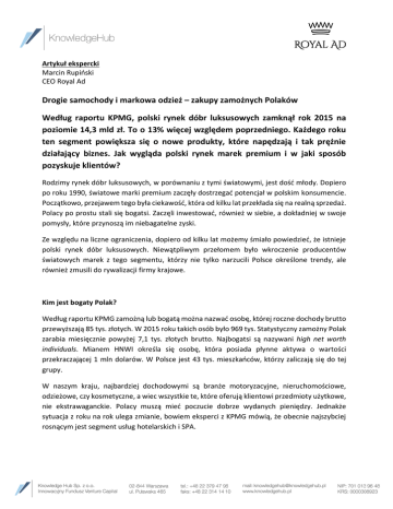 Artykuł ekspercki Marcin Rupiński CEO Royal Ad Drogie samochody i markowa odzież – zakupy zamożnych Polaków Według raportu KPMG, polski rynek dóbr luksusowych zamknął rok 2015 na poziomie 14,3 mld zł. To o 13% więcej względem poprzedniego. Każdego roku ten segment powiększa się o nowe produkty, które napędzają i tak prężnie działający biznes. Jak wygląda polski rynek marek premium i w jaki sposób pozyskuje klientów? Rodzimy rynek dóbr luksusowych, w porównaniu z tymi światowymi, jest dość młody. Dopiero po roku 1990, światowe marki premium zaczęły dostrzegać potencjał w polskim konsumencie. Początkowo, przejawem tego była ciekawość, która od kilku lat przekłada się na realną sprzedaż. Polacy po prostu stali się bogatsi. Zaczęli inwestować, również w siebie, a dokładniej w swoje pomysły, które przynoszą im niebagatelne zyski. Ze względu na liczne ograniczenia, dopiero od kilku lat możemy śmiało powiedzieć, że istnieje polski rynek dóbr luksusowych. Niewątpliwym przełomem było wkroczenie producentów światowych marek z tego segmentu, którzy nie tylko narzucili Polsce określone trendy, ale również zmusili do rywalizacji firmy krajowe. Kim jest bogaty Polak? Według raportu KPMG zamożną lub bogatą można nazwać osobę, której roczne dochody brutto przewyższają 85 tys. złotych. W 2015 roku takich osób było 969 tys. Statystyczny zamożny Polak zarabia miesięcznie powyżej 7,1 tys. złotych brutto. Najbogatsi są nazywani high net worth individuals. Mianem HNWI określa się osobę, która posiada płynne aktywa o wartości przekraczającej 1 mln dolarów. W Polsce jest 43 tys. mieszkańców, którzy zaliczają się do tej grupy. W naszym kraju, najbardziej dochodowymi są branże motoryzacyjne, nieruchomościowe, odzieżowe, czy kosmetyczne, a wiec wszystkie te, które oferują klientowi przedmioty użytkowe, nie ekstrawaganckie. Polacy muszą mieć poczucie dobrze wydanych pieniędzy. Jednakże sytuacja z roku na rok ulega zmianie, bowiem eksperci z KPMG mówią, że obecnie najszybciej rosnącym jest segment usług hotelarskich i SPA. Gdzie sprzedać luksus? W pierwszej kolejności, zakupy dóbr luksusowych dokonywane są w centrach handlowych. Na drugim miejscu natomiast, i to chyba nikogo nie zdziwi, jest Internet. W badaniu KPMG 43% ankietowanych przyznało, że zakupy marek premium robi właśnie przez Internet. W sieci bardzo łatwo można dotrzeć do potencjalnego klienta. Dzięki różnym technologicznym konfiguracjom i odpowiednim parametrom, reklama wyświetli się u kogo tylko chcemy. Stąd też, tak duża aktywność marek premium w Internecie. Doskonałym przykładem jest polska Galeria Handlowa Vitkac. Do końca 2015 roku miała wyłącznie sklep stacjonarny. W związku z licznym zainteresowaniem ze strony klientów, Galeria od stycznia 2016 roku uruchomiła sklep internetowy. Jednak sama obecność w sieci nie gwarantuje marce wysokiej sprzedaży. Wszystkie produkty z segmentu premium muszą mieć stosowną historię oraz idealne opakowanie. Bogaci i zamożni muszą wiedzieć za co płacą oraz mieć poczucie wyjątkowości, dlatego ważne jest aby kreacja reklamowa produktu była dostosowana do odbiory. Często przypominają one wysokiej jakości arcydzieła. Każdy element jest dobrany tak, by zapierać dech w piersiach i wywołać w odbiorcy potrzebę posiadania produktu. Od 2008 roku liczba bogatych Polaków wzrosła dwukrotnie, natomiast w tym roku przekroczy ona ponad milion. Do 2018 roku zamożni rodacy wygenerują przychód rzędu 210 mld złotych. Czy to znaczy, że dystans dzielący polskich zamożnych do Europy zmniejszy się, a w kraju przybędzie nowych HNWI? Przekonamy się wkrótce.
