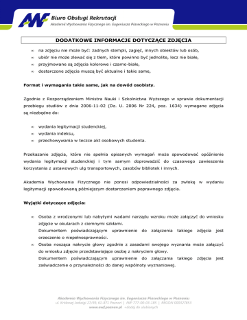 DODATKOWE INFORMACJE DOTYCZĄCE ZDJĘCIA • na zdjęciu nie może być: żadnych stempli, zagięć, innych obiektów lub osób, • ubiór nie może zlewać się z tłem, które powinno być jednolite, lecz nie białe, • przyjmowane są zdjęcia kolorowe i czarno-białe, • dostarczone zdjęcia muszą być aktualne i takie same, Format i wymagania takie same, jak na dowód osobisty. Zgodnie z Rozporządzeniem Ministra Nauki i Szkolnictwa Wyższego w sprawie dokumentacji przebiegu studiów z dnia 2006-11-02 (Dz. U. 2006 Nr 224, poz. 1634) wymagane zdjęcia są niezbędne do: • wydania legitymacji studenckiej, • wydania indeksu, • przechowywania w teczce akt osobowych studenta. Przekazanie zdjęcia, które nie spełnia opisanych wymagań może spowodować opóźnienie wydania legitymacji studenckiej i tym samym doprowadzić do czasowego zawieszenia korzystania z ustawowych ulg transportowych, zasobów bibliotek i innych. Akademia Wychowania Fizycznego nie ponosi odpowiedzialności za zwłokę w wydaniu legitymacji spowodowaną późniejszym dostarczeniem poprawnego zdjęcia. Wyjątki dotyczące zdjęcia: • Osoba z wrodzonymi lub nabytymi wadami narządu wzroku może załączyć do wniosku zdjęcie w okularach z ciemnymi szkłami. Dokumentem poświadczającym uprawnienie do załączenia takiego zdjęcia jest orzeczenie o niepełnosprawności. • Osoba nosząca nakrycie głowy zgodnie z zasadami swojego wyznania może załączyć do wniosku zdjęcie przedstawiające osobę z nakryciem głowy. Dokumentem poświadczającym uprawnienie do załączania zaświadczenie o przynależności do danej wspólnoty wyznaniowej. takiego zdjęcia jest