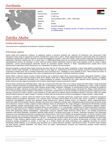Jordania Stolica: Amman Powierzchnia: 92 300 km² Ludność: 5 759,7 tys. Waluta: dinar jordański (JOD), 1 JOD = 1000 filsów Napięcie: 220 V Język: arabski Wiza: wiza jest wymagana Regiony: Al Balqa, Al Karak, Al Mafraq, Amman, At Tafilah, Az Zarqa, Dolina Petry, Irbid, Ma an, Zatoka Akaba Zatoka Akaba Krótka informacja Luksusowy kurort w sąsiedztwie raf koralowych i zabytków starożytności. Informacje ogólne Zatoka Akaba jest przyjemnym miejscem na spędzenie wakacji w otoczeniu skalistych gór, pięknych raf koralowych oraz luksusowych hoteli oferujących swoje usługi na najwyższym poziomie. Krystalicznie czysta woda w zatoce, dobrze zagospodarowane i piaszczyste plaże oraz możliwość uprawiania szerokiej gamy sportów wodnych są atutem przyciągającym turystów z wielu stron świata. Część turystów wygrzewa się przeważnie na nadmorskim wybrzeżu, podczas gdy inni w pocie czoła i z wielką determinacją biorą się za zwiedzanie historycznych pamiątek pochodzących z najodleglejszych czasów. Nic dziwnego, że rejon zatoki jest bardzo chętnie odwiedzany zarówno przez panie pragnące wrócić po urlopie z piękną opalenizną i panów wykorzystujących doskonałe warunki do uprawiania sportów wodnych. Z Akaby usatysfakcjonowani wyjadą także turyści zainteresowani wędrówkami wśród starożytnych ruin i eskapadami na spalone słońcem pustynie. Słoneczna pogoda w regionie Zatoki Akaba utrzymuje się przez cały rok. W zimie jest ciepło i przyjemnie, a letnie upały łagodzi orzeźwiająca bryza morska, chociaż należy pamiętać, że temperatura nawet w nocy sięga 30°. Umiarkowany klimat również sprawia, że jest to doskonałe miejsce do nurkowania o każdej porze roku ze średnią temperaturą wody wynoszącą 22,5° i spadającą w zimie zaledwie do 20°C. Słońce świeci tam przez 12 godzin dziennie, więc jest wystarczająco dużo czasu na wygrzewanie się na plażach i zwiedzanie okolicznych atrakcji. Zatoka Akaba z jedynym portem morskim Jordanii położona jest w północnej części Morza Czerwonego pomiędzy półwyspami Arabskim i Synaj, zajmując tym samym pas wybrzeża długości około 25 km. Region zatoki leży w bliskim sąsiedztwie izraelskiego kurortu Ejlat, graniczy z rozległymi terenami Ma’an na północnym wschodzie oraz z Arabią Saudyjską na południu. Podobnie jak przy całym wybrzeżu Morza Czerwonego, również wzdłuż zatoki pod wodą ciągną się przepiękne rafy koralowe zapewniające mnóstwo podwodnych wrażeń. Historia Akaby, podobnie jak pobliskiego Ejlatu, wiąże się z czasami króla Salomona, który w tym miejscu założył port Ezion-Geber i wysłał swoją flotę po złoto i kamienie szlachetne do legendarnego kraju Ofir. W późniejszych czasach w porcie zadomowili się Nabatejczycy z Petry, z kolei w czasach rzymskich przez region przechodził ważny szlak handlowy łączący Egipt, Damaszek i Palestynę. W rozbudowanym porcie przesiadali się pielgrzymi podróżujący do Mekki, natomiast muzułmanów wyparli krzyżowcy w 1116 r., którzy na pobliskiej wyspie wybudowali fort. Region zatoki trafił jeszcze raz do muzułmańskiego władcy Saladyna i Mameluków, by pozostać w ostateczności po stronie arabskiej za sprawą powstańców wspieranych przez słynnego Lawrence’a z Arabii w okresie I wojny światowej. XX wiek odbił się na regionie wieloma konfliktami zbrojnymi, niemniej w 1994 roku zostało otwarte przejście graniczne między Izraelem a Jordanią, a Akaba stała się turystycznym kurortem przyciągającym uwagę turystów z całego świata. Głównym ośrodkiem w regionie zatoki jest właśnie kurort Akaba słynący z niezwykłej gościnności, przyjemnych kawiarni i restauracji serwujących arabskie potrawy przyrządzane najczęściej z ryb i owoców morza. Do Akaby można dostać się od strony lądu, morza i powietrza, a dodatkowym magnesem przyciągającym turystów jest Specjalna Strefa Ekonomiczna. Główną atrakcją kurortu są przyjemne, dobrze zagospodarowane, piaszczyste plaże oraz kompleksy hotelowe oferujące różnorodne formy spędzania wolnego czasu. Największą popularnością cieszą się sporty wodne oraz nurkowanie, chociaż w okolicy znajduje się kilka ciekawych miejsc do odwiedzenia. Na uwagę zasługuje z pewnością fort Mameluków powstały przed podbojem państwa mameluckiego przez Turcję w 1516 r., Muzeum Archeologiczne ze znaleziskami z południowych regionów Jordanii, fundamenty miasta-fortecy Alila sięgające początków Islamu czy pochodzące z IV w. ruiny jednego z najstarszych na świecie bizantyjskich kościołów. Kurort nie miałby takiej renomy w świecie turystycznym, gdyby nie przestronne i eleganckie hotele oferujące pełen relaks w luksusowej atmosferze. Centra SPA gwarantują zabiegi odmładzające i regenerujące zmęczony organizm dzięki leczniczej czarnej glince i soli morskiej przywiezionej specjalnie znad Morza Martwego. Kompleksy hotelowe dbają również o kondycję swoich gości za sprawą organizacji rozmaitych form aktywnego wypoczynku oraz udostępniania basenów ze słodką wodą, centrów fitness i wielu innych obiektów do uprawiania sportów. W wolnych chwilach można zawsze zanurzyć się w lazurowej wodzie Zatoki Akaba lub wybrać się na rejs łodzią z przeszklonym dnem w pobliże urzekających raf koralowych. Akaba dysponuje również atrakcjami związanymi z morzem – na kształcące wycieczki można wybrać się do Ośrodka Badań Morskich lub ogromnego Akwarium. Z kolei miłośnicy głośnej muzyki, zakupów i wyszukanych dań powinni wybrać się na bulwar Al-Hammamet al-Tunisieh, który pulsuje pozytywną energią szczególnie po zmroku. Z racji tego, że w Akabie otwarta jest strefa wolnocłowa wato zaglądnąć chociażby do centrum handlowego Akaba Gateway, by za rozsądną cenę zaopatrzyć się w szereg ciekawych pamiątek i wyśmienitych trunków. W centrum miasta znajduje się także barwne, arabskie targowi