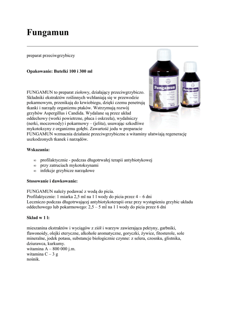 Fungamun preparat przeciwgrzybiczy Opakowanie: Butelki 100 i 300 ml FUNGAMUN to preparat ziołowy, działający przeciwgrzybiczo. Składniki ekstraktów roślinnych wchłaniają się w przewodzie pokarmowym, przenikają do krwiobiegu, dzięki czemu penetrują tkanki i narządy organizmu ptaków. Wstrzymują rozwój grzybów Aspergillus i Candida. Wydalane są przez układ oddechowy (worki powietrzne, płuca i oskrzela), wydalniczy (nerki, moczowody) i pokarmowy – (jelita), usuwając szkodliwe mykotoksyny z organizmu gołębi. Zawartość jodu w preparacie FUNGAMUN wzmacnia działanie przeciwgrzybiczne a witaminy ułatwiają regenerację uszkodzonych tkanek i narządów. Wskazania: • • • profilaktycznie - podczas długotrwałej terapii antybiotykowej przy zatruciach mykotoksynami infekcje grzybicze narządowe Stosowanie i dawkowanie: FUNGAMUN należy podawać z wodą do picia. Profilaktycznie: 1 miarka 2,5 ml na 1 l wody do picia przez 4 – 6 dni Leczniczo podczas długotrwającej antybiotykoterapii oraz przy wystąpieniu grzybic układu oddechowego lub pokarmowego: 2,5 – 5 ml na 1 l wody do picia przez 6 dni Skład w 1 l: mieszanina ekstraktów i wyciągów z ziół i warzyw zawierająca pektyny, garbniki, flawonoidy, olejki eteryczne, alkohole aromatyczne, goryczki, żywice, fitosterole, sole mineralne, jodek potasu, substancje biologicznie czynne: z selera, czosnku, glistnika, dziurawca, kurkumy. witamina A – 800 000 j.m. witamina C – 3 g nośnik.